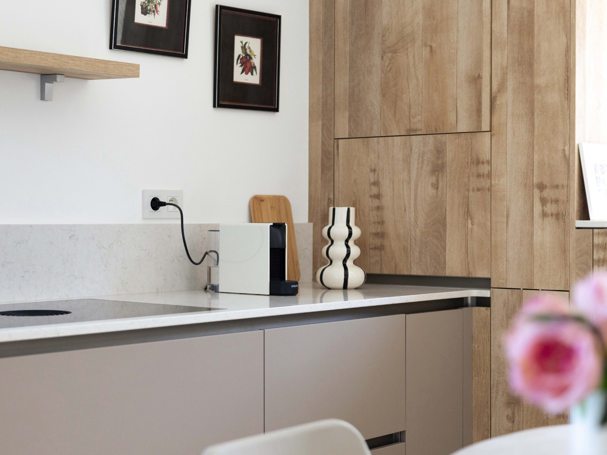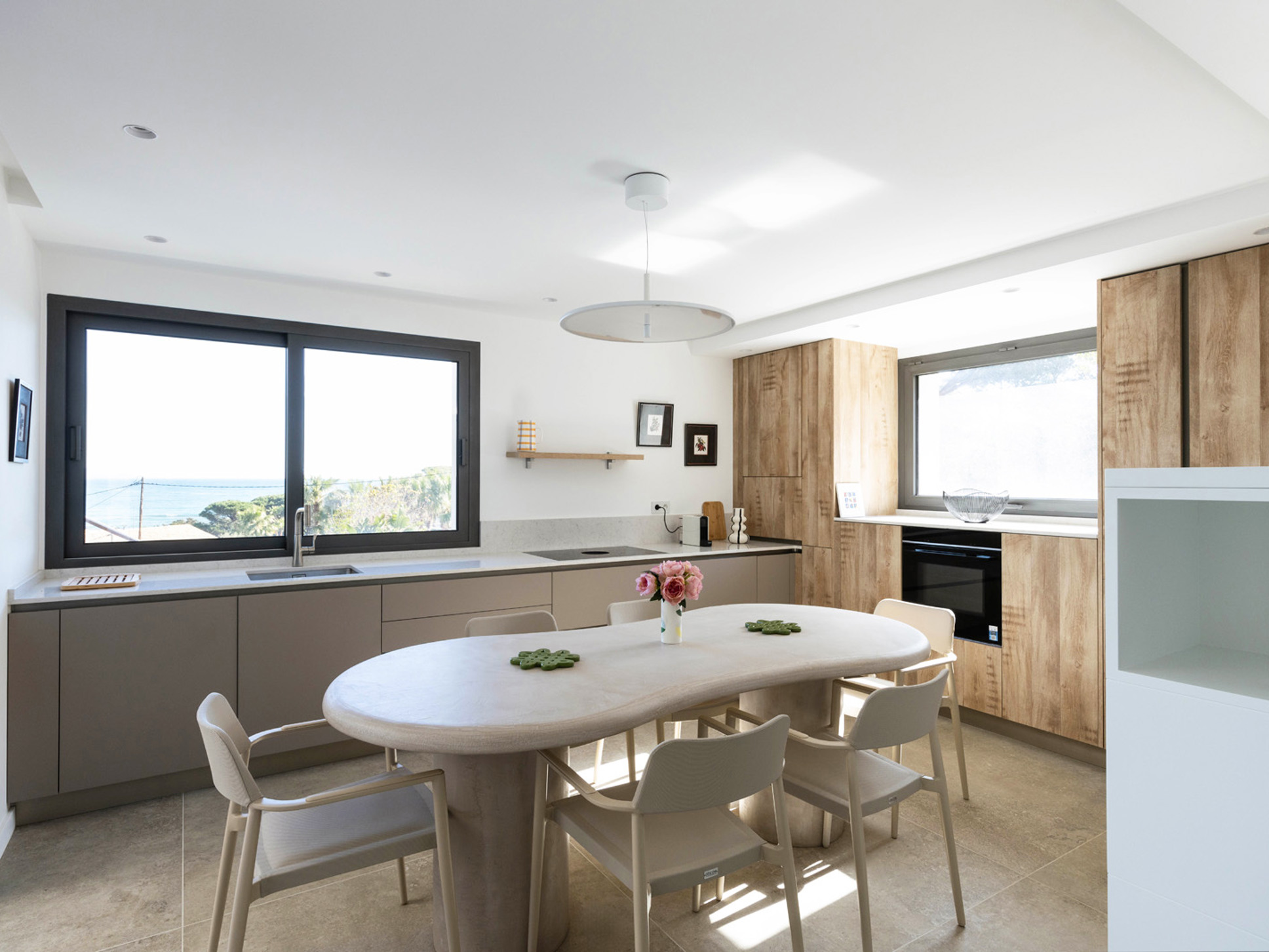 De open keuken met eettafel is voorzien van moderne apparatuur en ruime kastruimte. Vanuit de keuken kijkt u uit over de Middellandse Zee en Plage de La Nartelle – een spectaculair uitzicht dat zelfs afwassen een plezier maakt. Uiteraard is de keuken ook uitgerust met een vaatwasser.