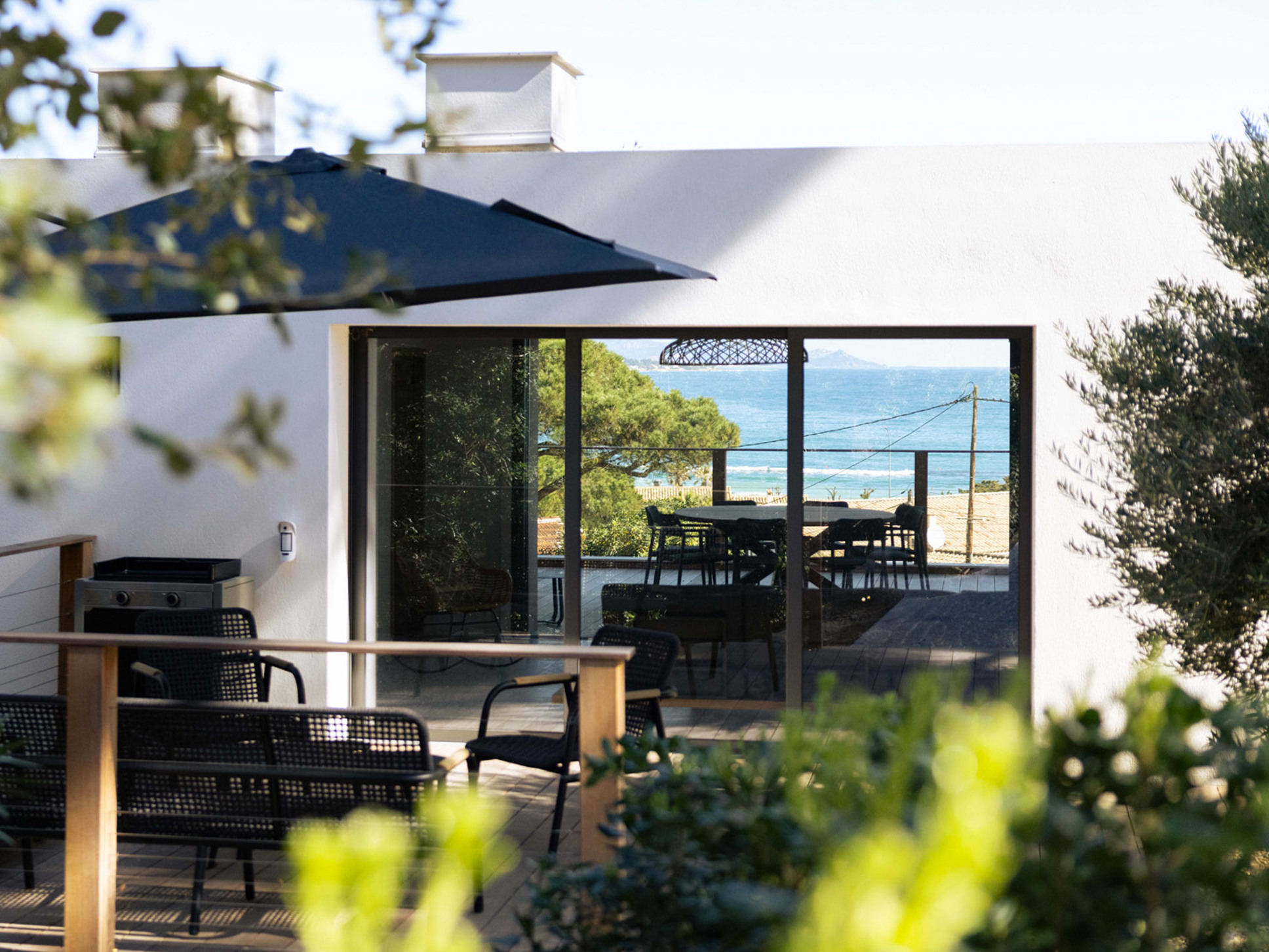 Dit biedt toegang tot 2 royale terrassen, afhankelijk van de tijd van de dag in de schaduw of in de zon. Het terras aan de zeezijde biedt een grote ronde eettafel. Op het andere terras (entree zijde) staat een loungeset. Een fijne plek om even te relaxen en een boek te lezen.