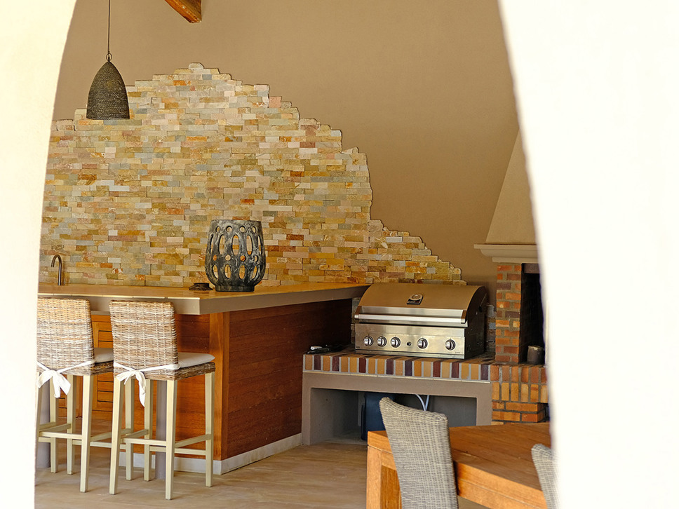Erg mooi vinden we ook het zeer royale overdekte terras met BBQ area, zomerkeuken, bar en open haard. Uiteraard voorzien van eettafel en stoelen alsook van prachtige luxe zitmeubelen.