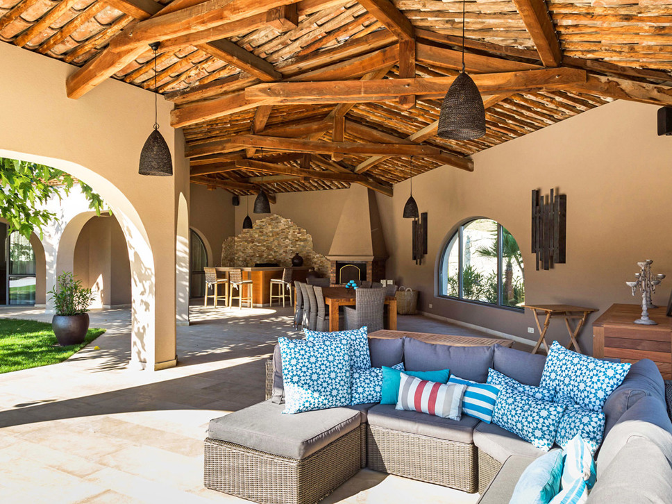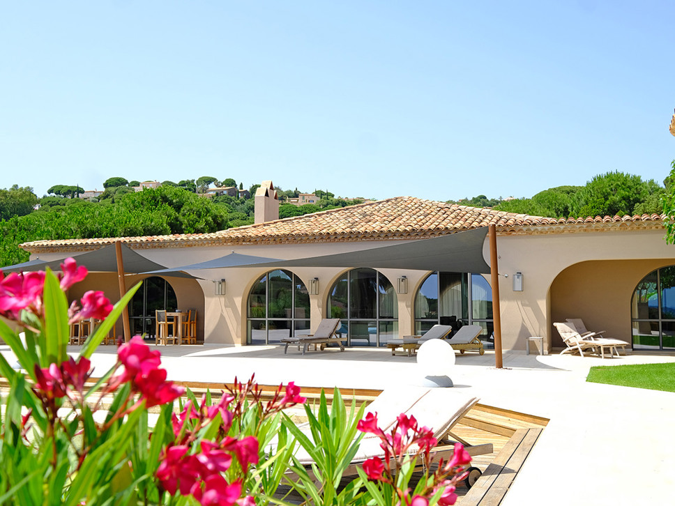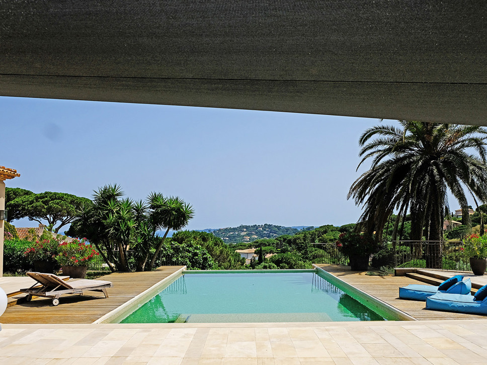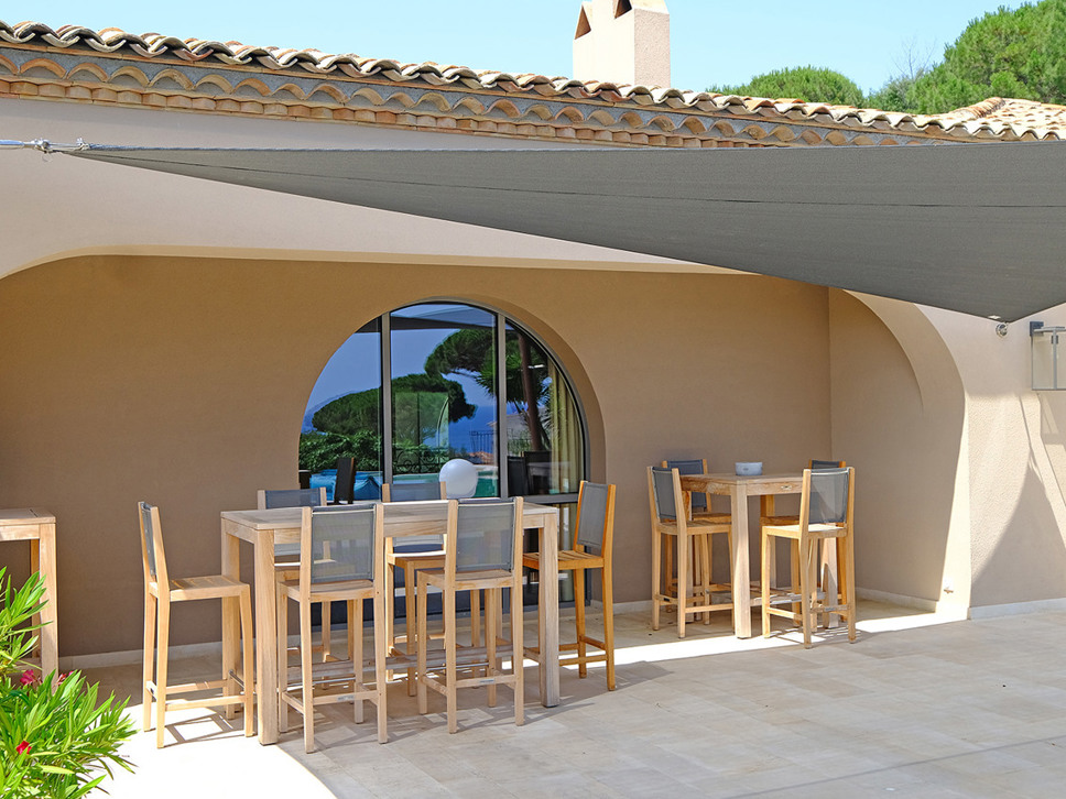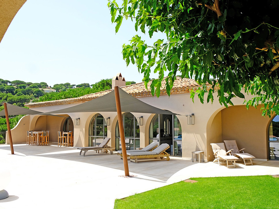 Wij zijn onder de indruk van het royale en het volledig op het zuiden georiënteerde terras van maar liefst 400 m2. Er zijn verschillende zithoeken gecreëerd. Onder andere is er een met zeildoeken overdekt terras direct aan de zijde van de living. Dit terras biedt een heerlijke schaduwplaats voorzien van luxe tuinmeubelen. Een heerlijke plek om lang te loungen, koffie te drinken of rustig een boek te lezen. Vanaf dit terras heeft u een volledig zicht op het zwembad en in de verte ziet u de Golf van Saint Tropez liggen.