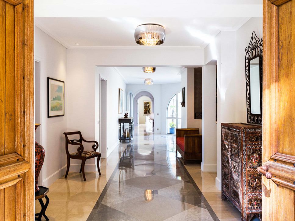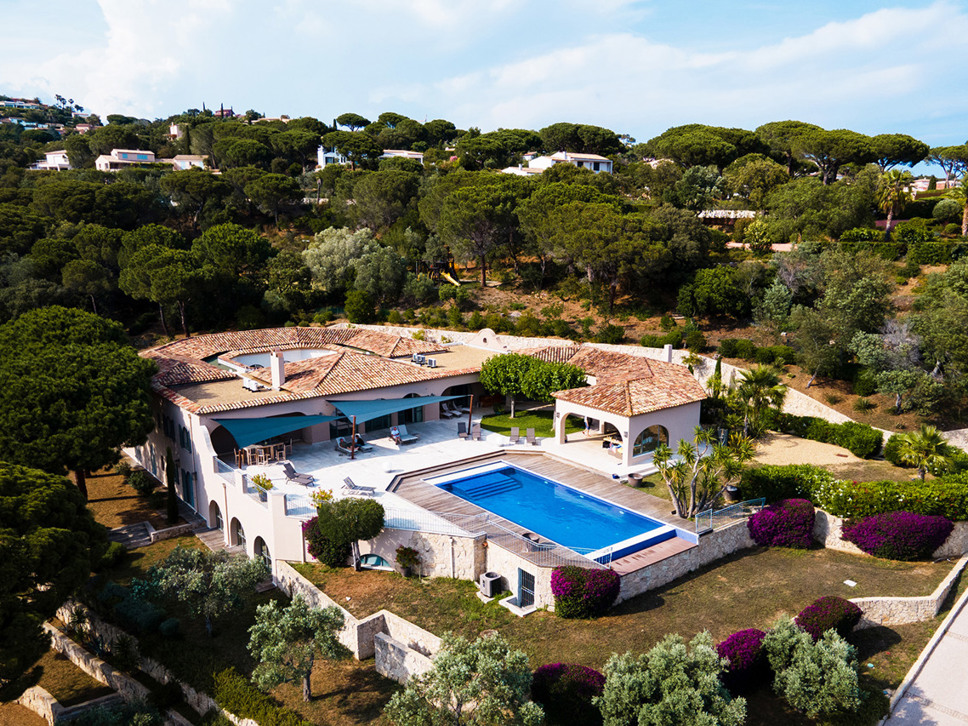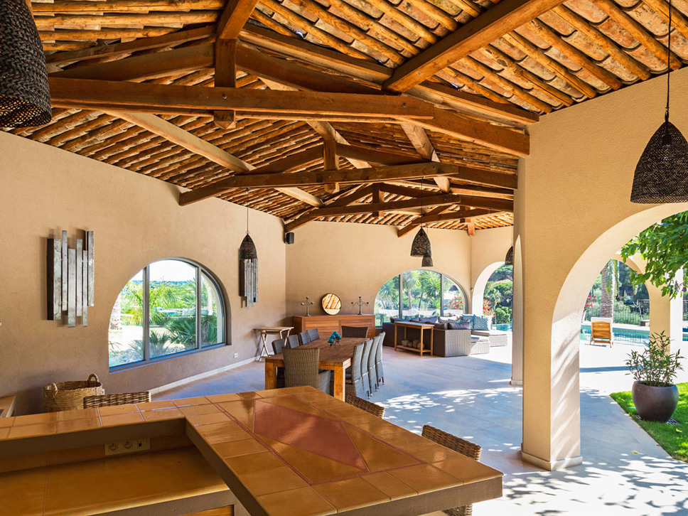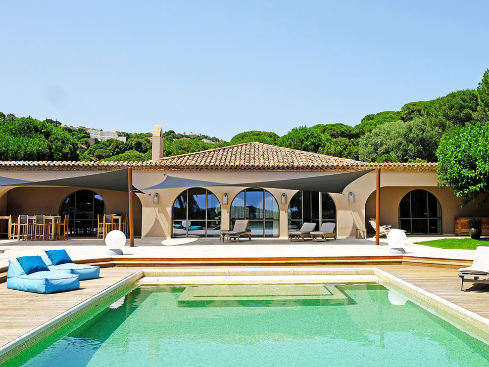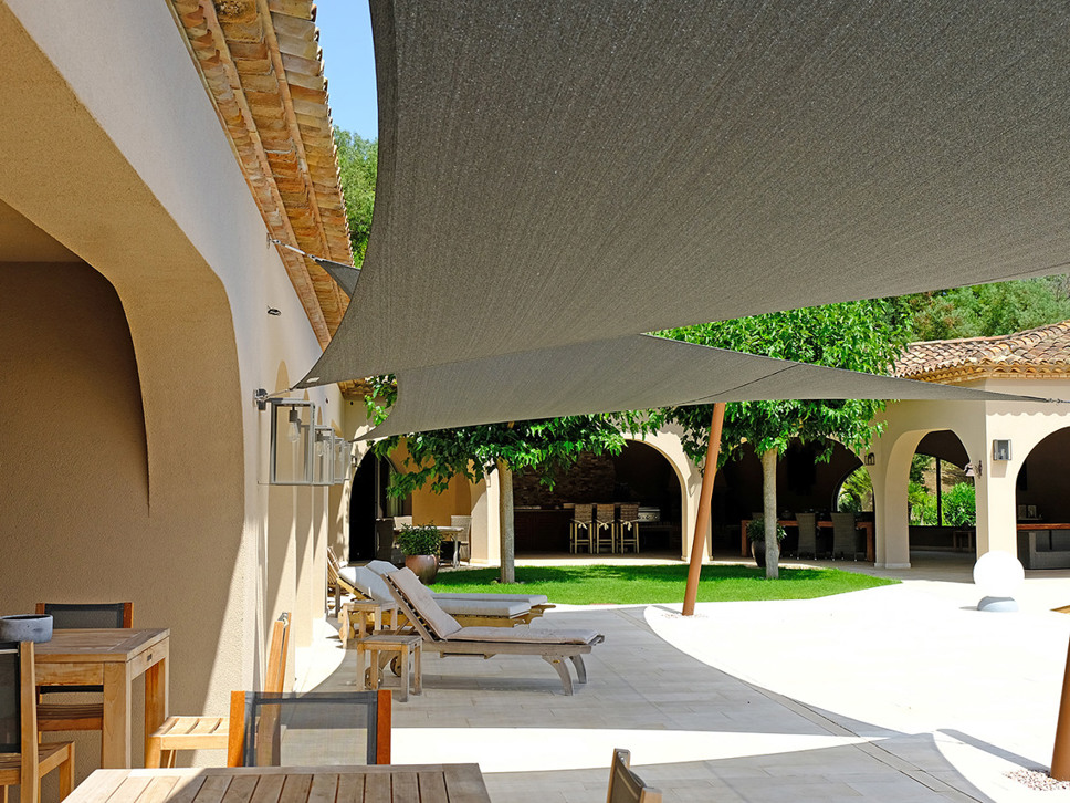 Wij zijn onder de indruk van het royale en het volledig op het zuiden georiënteerde terras van maar liefst 400 m2. Er zijn verschillende zithoeken gecreëerd. Onder andere is er een met zeildoeken overdekt terras direct aan de zijde van de living. Dit terras biedt een heerlijke schaduwplaats voorzien van luxe tuinmeubelen. Een heerlijke plek om lang te loungen, koffie te drinken of rustig een boek te lezen. Vanaf dit terras heeft u een volledig zicht op het zwembad en in de verte ziet u de Golf van Saint Tropez liggen.