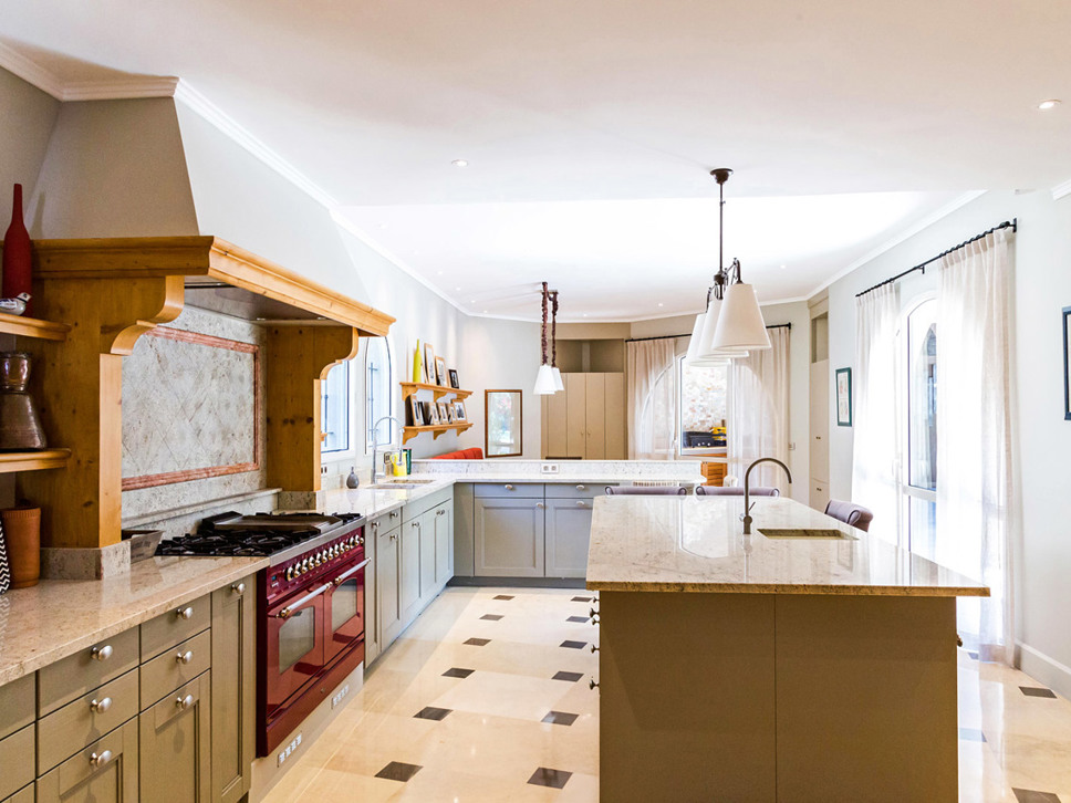 De woonkeuken is zeer goed geëquipeerd en biedt een leuke ontbijthoek. De keuken bevat o.a. een vaatwasser, ruim gasvuur met 2 elektrische ovens, magnetron, koelkast met diepvriezer, koffieapparaat en TV. Op het niveau van de tuin is er nog een wijnkelder en een ruime game room voor de jeugd. Verder is er nog een berging met wasmachine en een garage die plaats biedt aan 4 auto's.