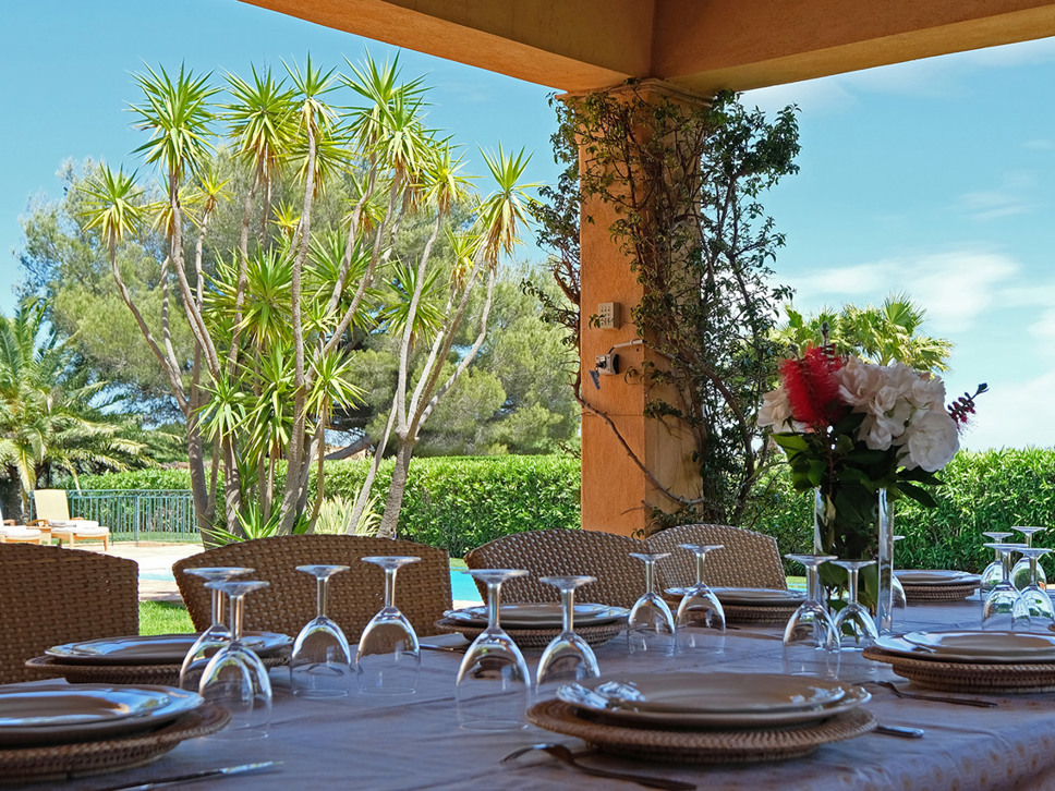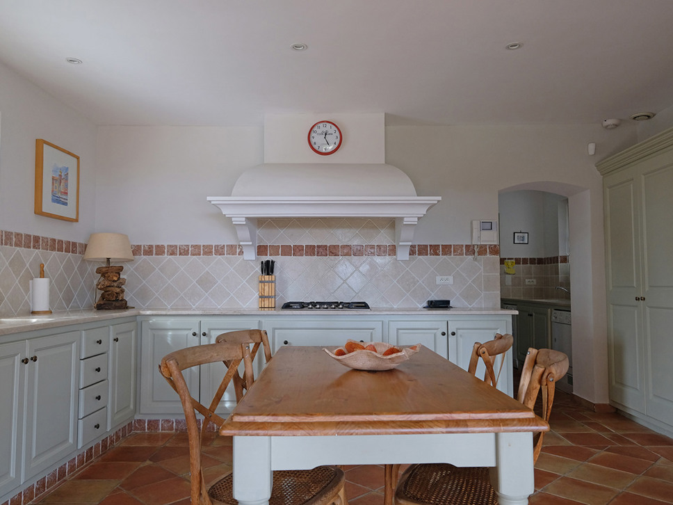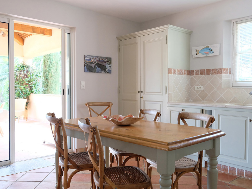 In de eetkamer staat een eettafel voor 8 personen. In de woonkeuken staat ook een kleinere tafel. De keuken is zeer compleet uitgerust; Amerikaanse ijskast, gasfornuis, magnetron, oven/grill, koelvrieskast, afwasmachine, broodrooster, waterkoker en koffiezetapparaat. In de bijkeuken staan de wasmachine en droger. De keuken biedt toegang tot het overdekte terras met BBQ en royale eettafel. Een mooie setting om s’avond te genieten van het diner met een fraai uitzicht over het zwembad en de palmbomen in de tuin.