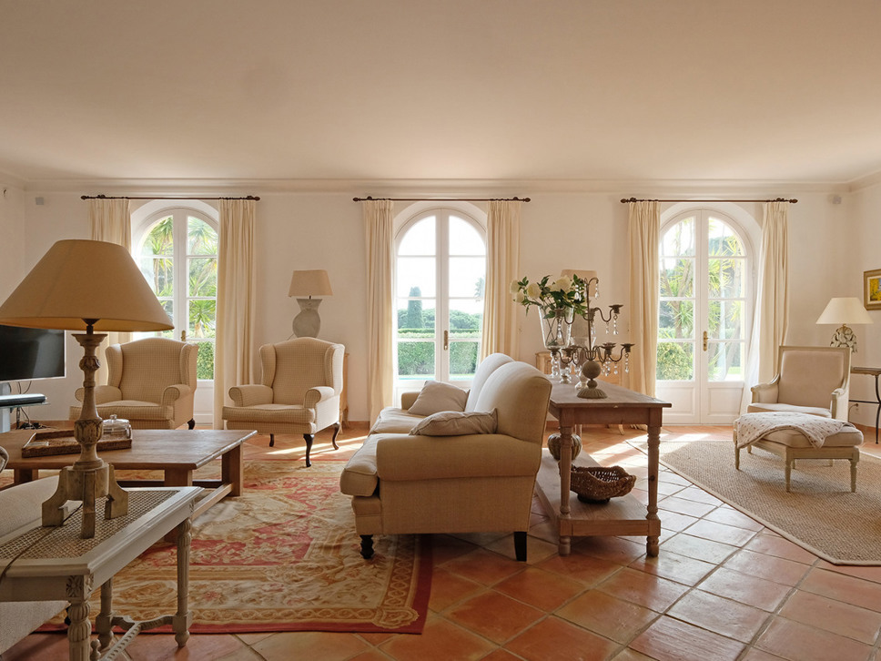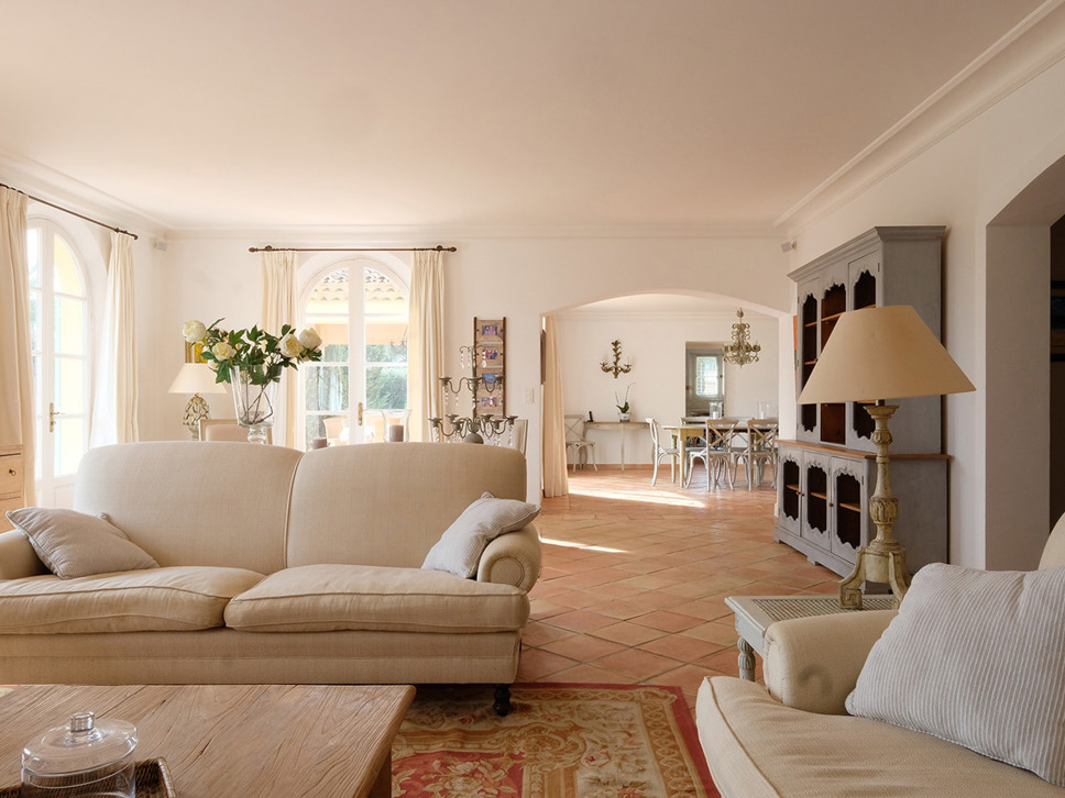 De living is bijzonder ruim en voorzien van een comfortabel zithoek en diverse fauteuils. Het interieur straalt luxe en rust uit. Gedekte kleuren en gebruik van mooie materialen. Vanuit de living is er direct toegang tot het terras en tuin met zwembad. Dit geldt ook voor de eetkamer en de ruime keuken.