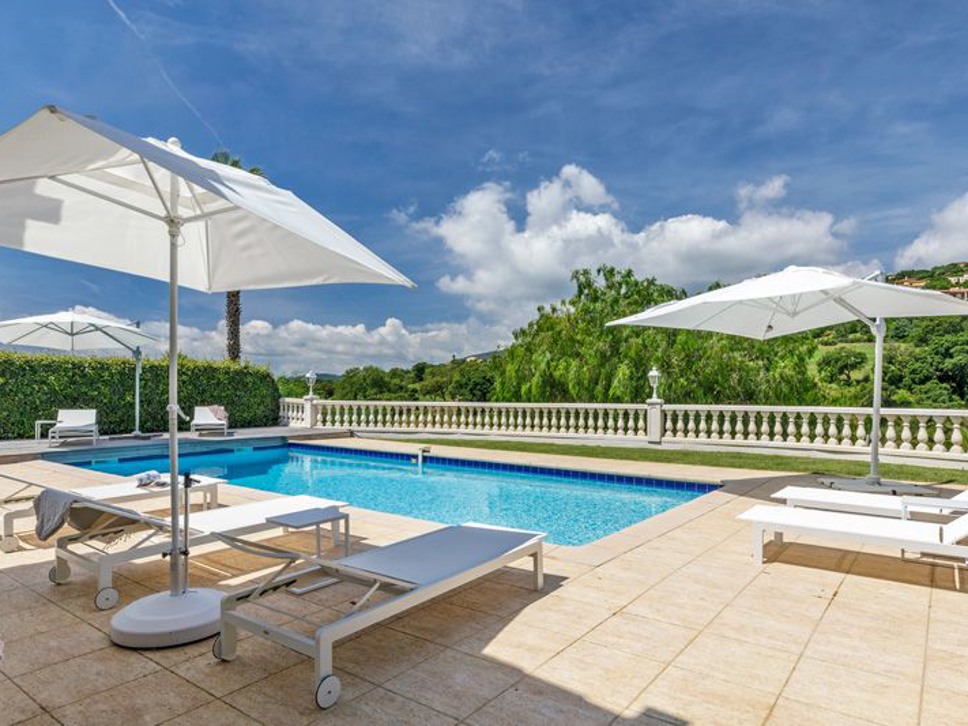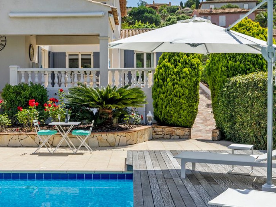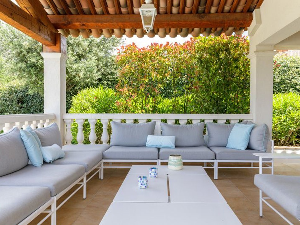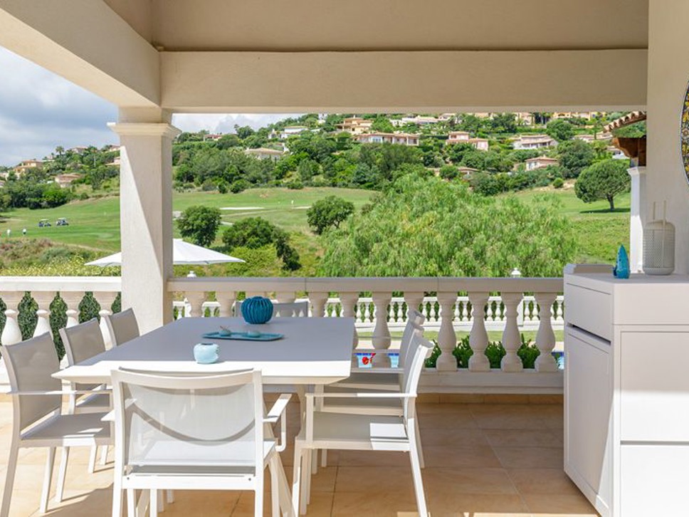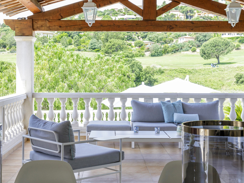 Luxe moderne villa met privé zwembad te Sainte Maxime, Côte d'Azur. Prachtig overdekt zomerterras met comfy loungeset. Breed uitzicht op de golfbaan van Sainte Maxime. De villa is geschikt voor 8 personen.