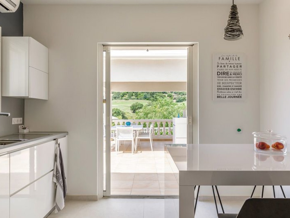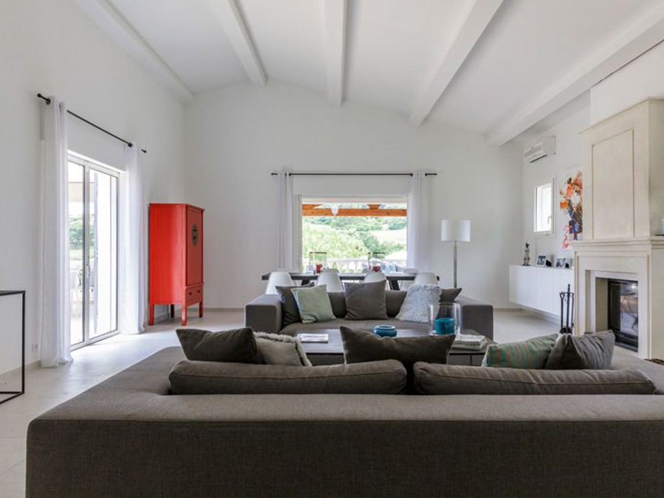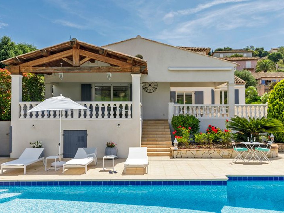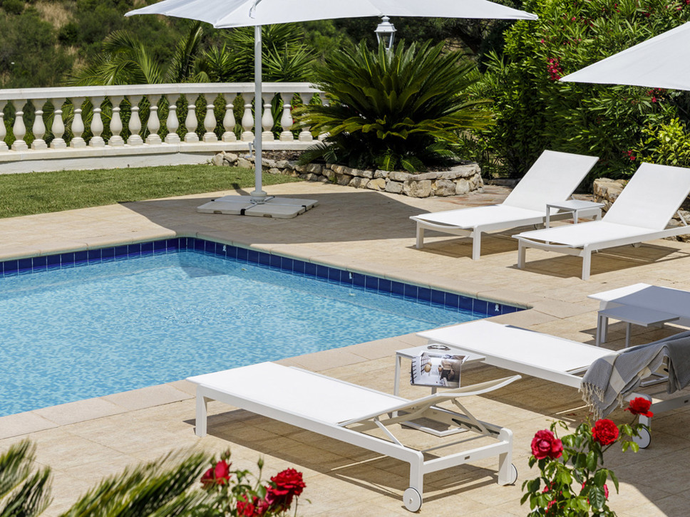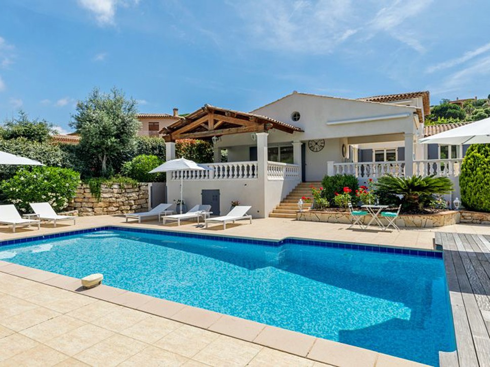 Luxe moderne villa met privé zwembad te Sainte Maxime, Côte d'Azur. Prachtig overdekt zomerterras met comfy loungeset. Breed uitzicht op de golfbaan van Sainte Maxime. De villa is geschikt voor 8 personen.