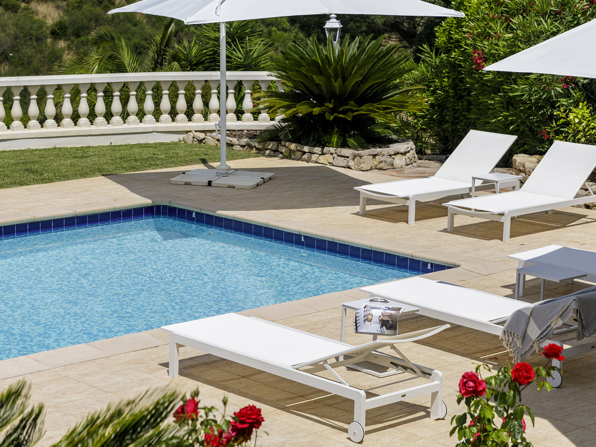 Het lager gelegen zwembad heeft een afmeting van 12 x 5 m en heeft een diept van 2.5 m. Voor uw comfort staan er mooie sunloungers, parasols en is er een buitendouche.