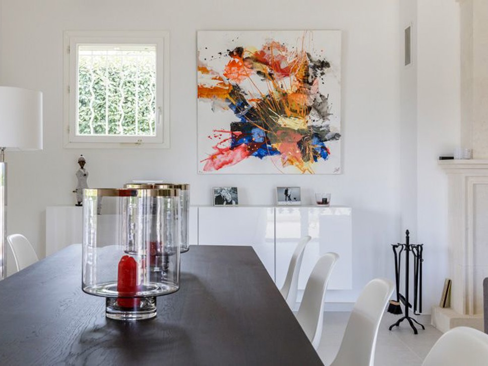 De eettafel met zes zitplaatsen vormt een centraal punt in de ruimte – ideaal voor lange avonden tafelen. De grote glazen schuifdeuren zorgen voor een naadloze verbinding met het overdekte terras buiten, waar u het hele jaar door kunt genieten van het buitenleven.