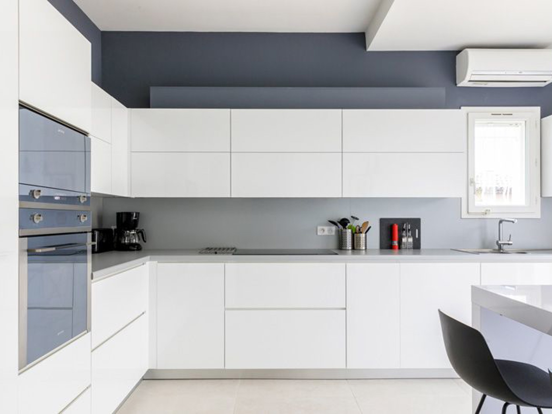 De open keuken is een echte blikvanger: strak wit van kleur, van alle gemakken voorzien en compleet ingericht met onder meer een Amerikaanse koelkast met ijsblokjes, combi-oven, espressoapparaat en een gezellige bar met vier barkrukken. Ook vanuit de keuken heeft u directe toegang tot het overdekte terras met eettafel – perfect voor ontbijt in de ochtendzon of een diner bij zonsondergang.