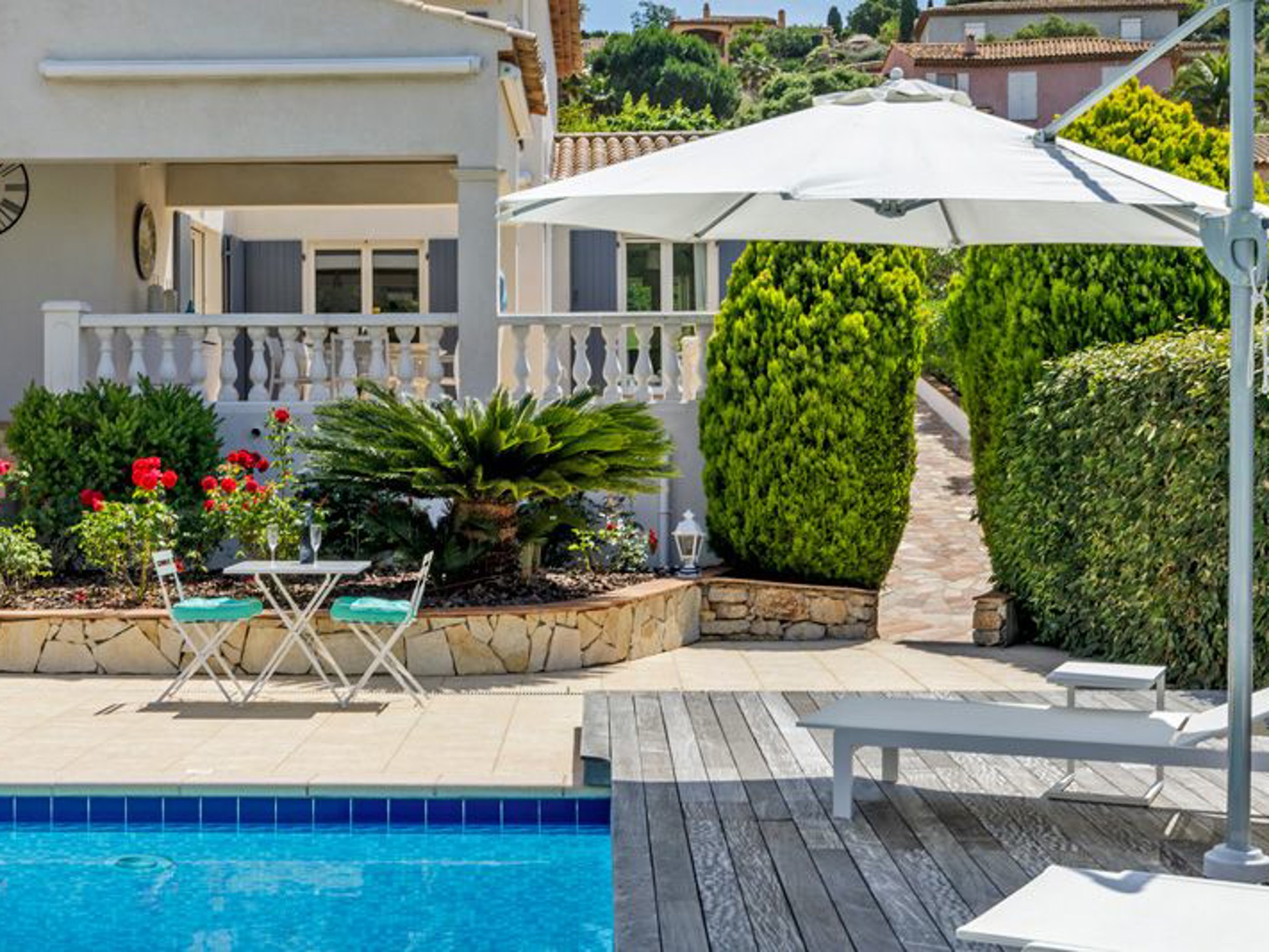 De villa ligt direct aan de golfbaan van Sainte Maxime. U betreedt het volledig omheinde terrein middels een elektrische poort. Er is voldoende parkeergelegenheid op eigen terrein voor meerdere auto’s.