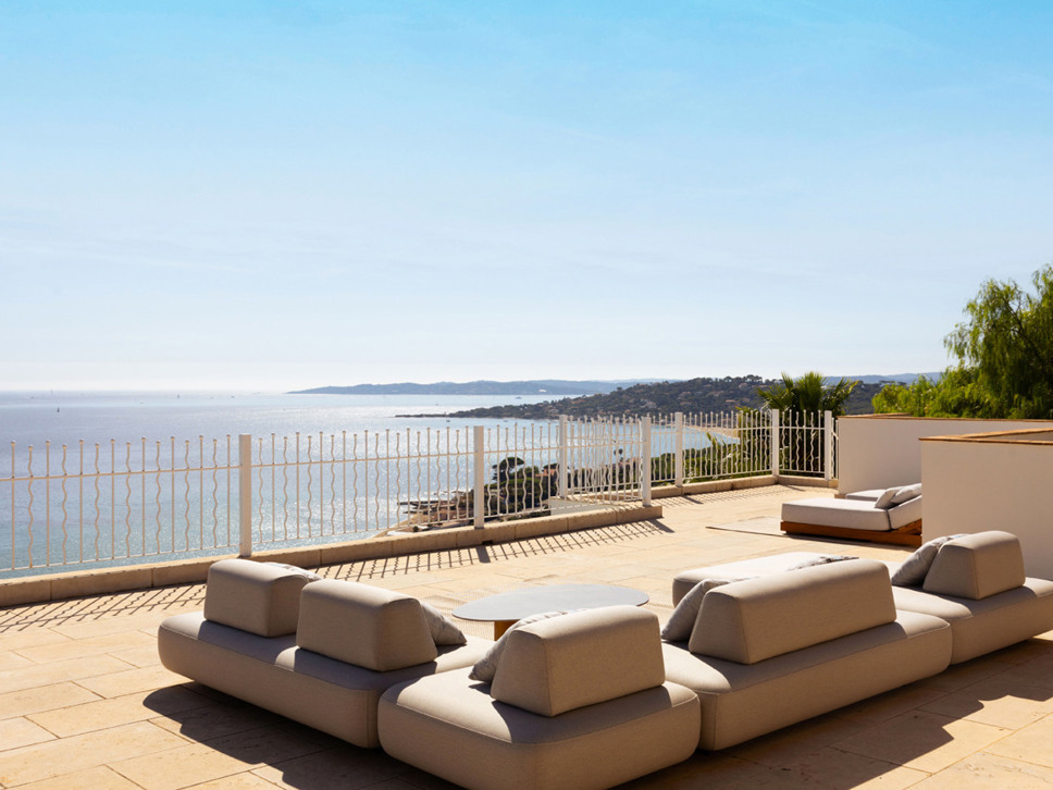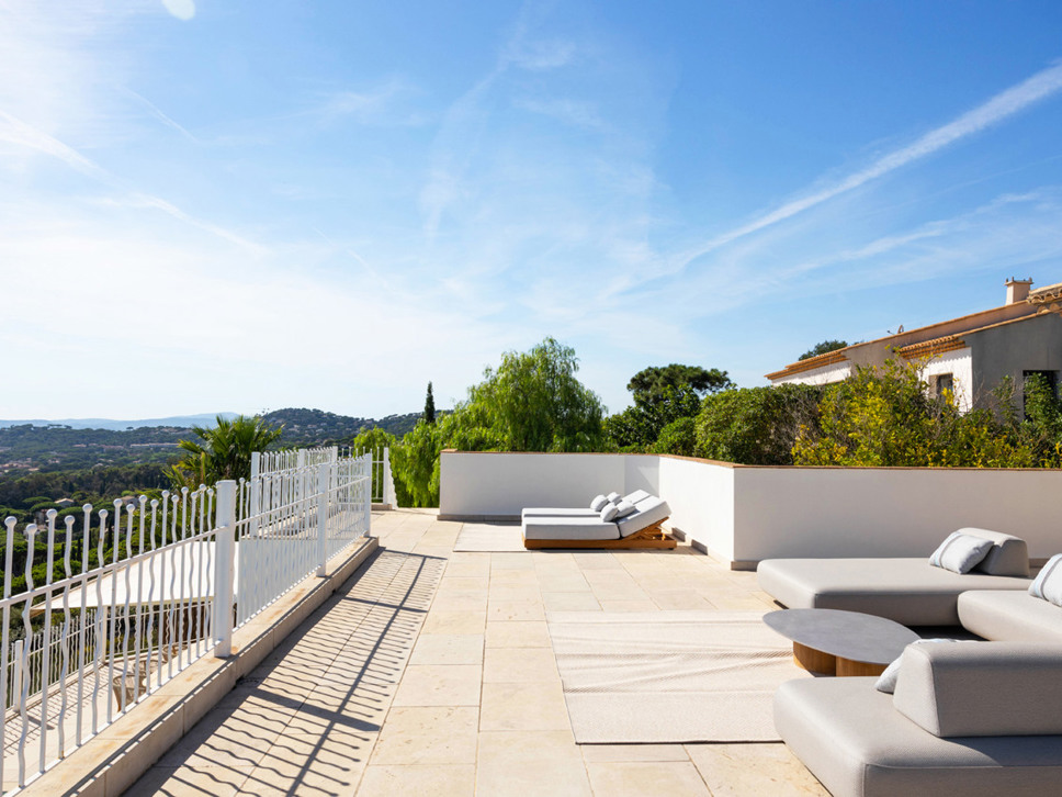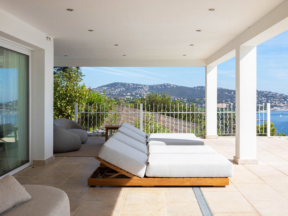 Het primaire terras is het terras bij de living en het privézwembad. U geniet hier van een prachtig uitzicht op de Golf van Saint Tropez en de Middellandse Zee. Op dit deel van het overdekte terras staan een luxe loungeset - in de schaduw - luxe ligbedden en een XL eettafel met stoelen. Zie hiervoor ook de foto's voor een goed beeld van de terrassen en het buitenmeubilair.
