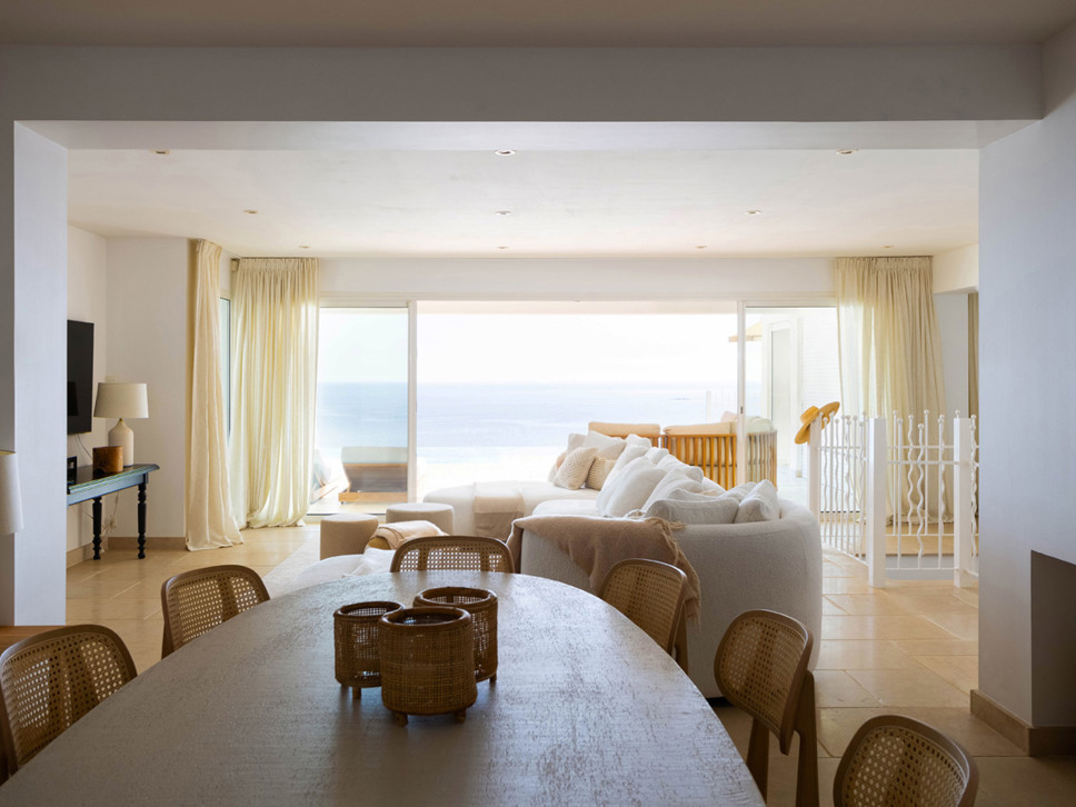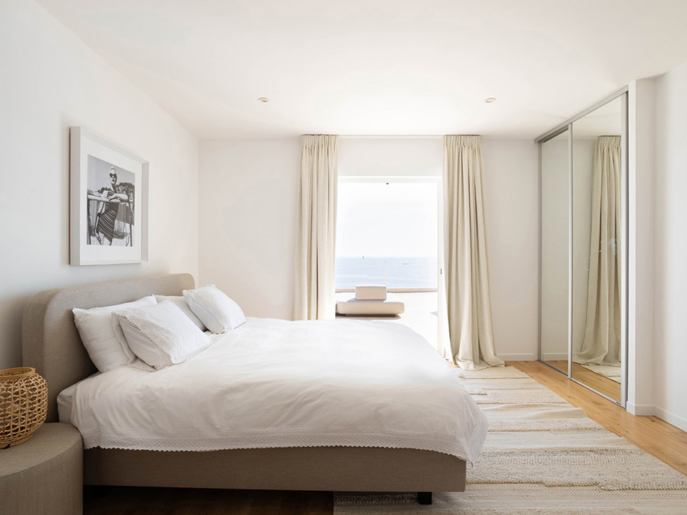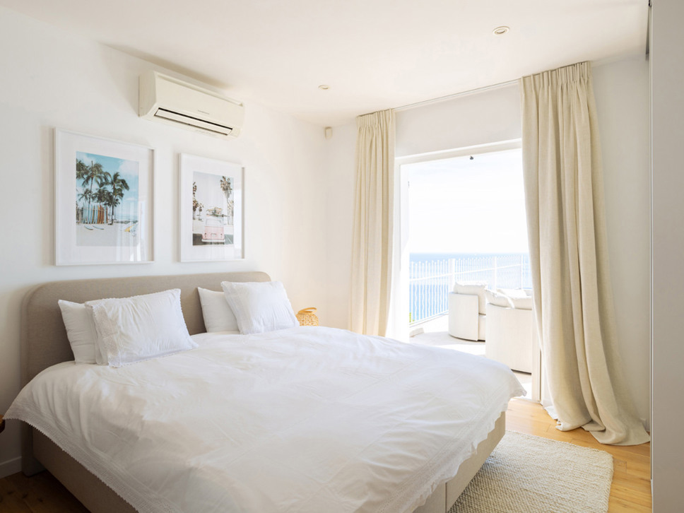 De slaapkamers op de 1e verdieping hebben toegang tot een royaal terras vanwaar breed zeezicht en voorzien van ligbedden, loungeset en luxe zitmeubelen. De slaapkamers op de benedenverdieping hebben toegang tot een overdekt terras met daarop een moderne ronde tafel met stoelen.