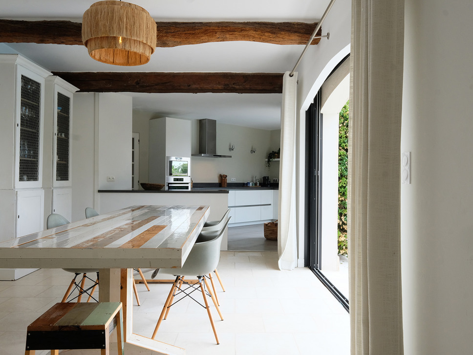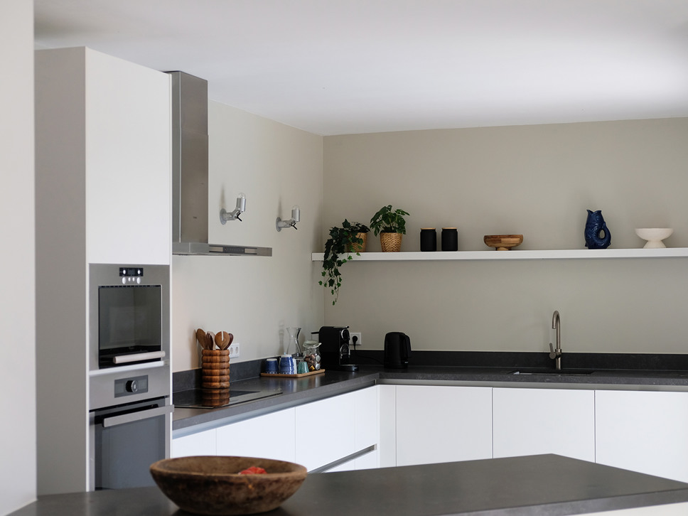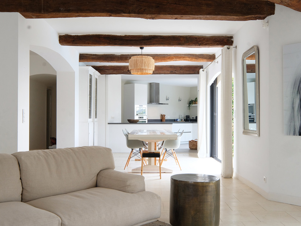 De open keuken bevindt zich in het verlengde van de living en is zeer compleet uitgerust, Amerikaanse ijskast, 4 kookplaten, magnetron, oven/grill, koelvrieskast, afwasmachine, broodrooster, waterkoker en koffiezetapparaat. Op de begane grond bevindt zich ook een toilet en ruimte met wasmachine en droger. Aan de tuinzijde van de living bevindt zich een bar (ijskast, stromend water), de ideale plaats om s’avond te genieten van een drankje met een fraai uitzicht over het zwembad, tuin en de Golf van St. Tropez.