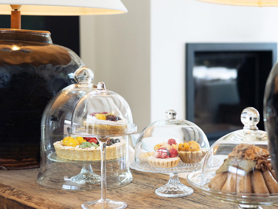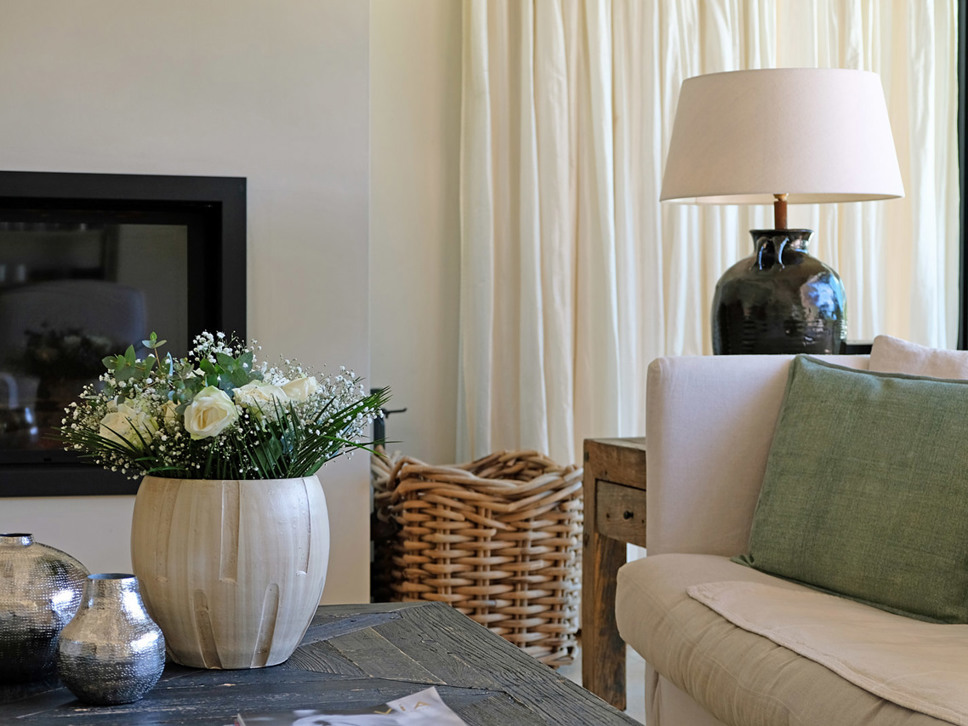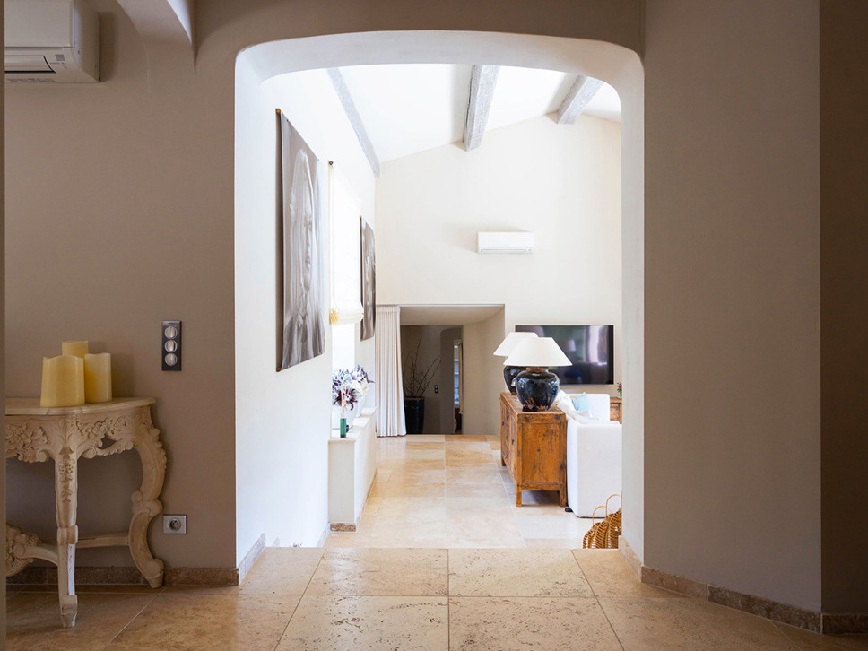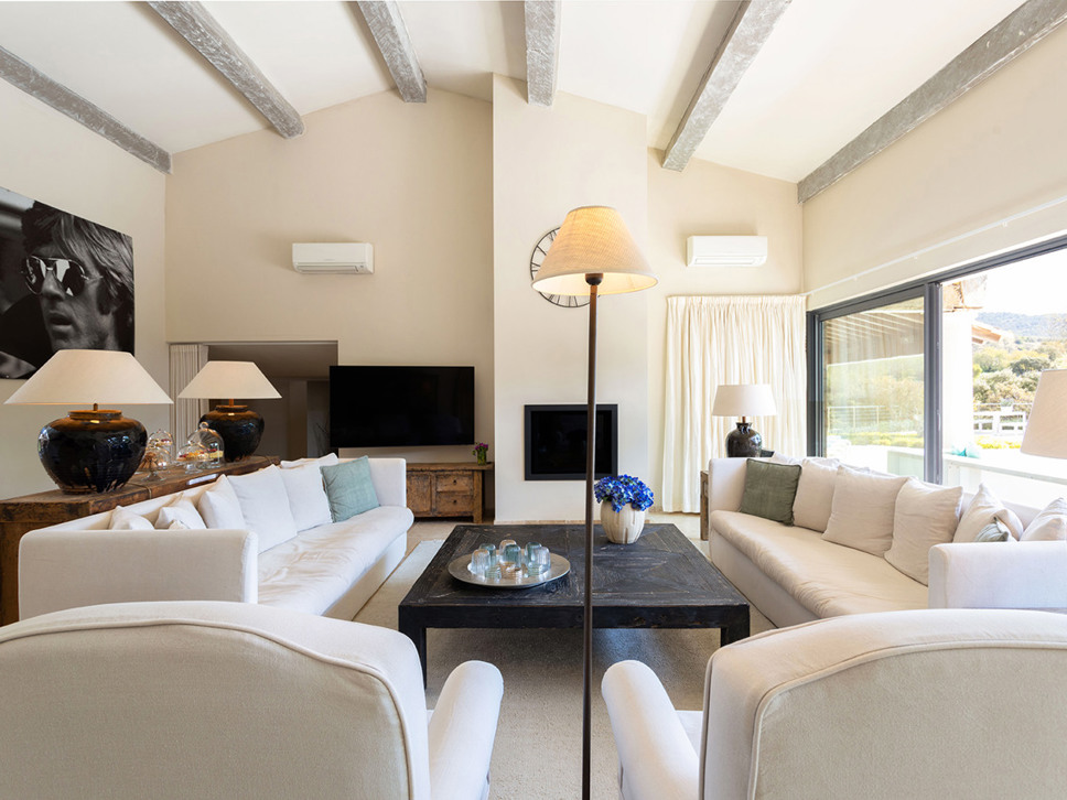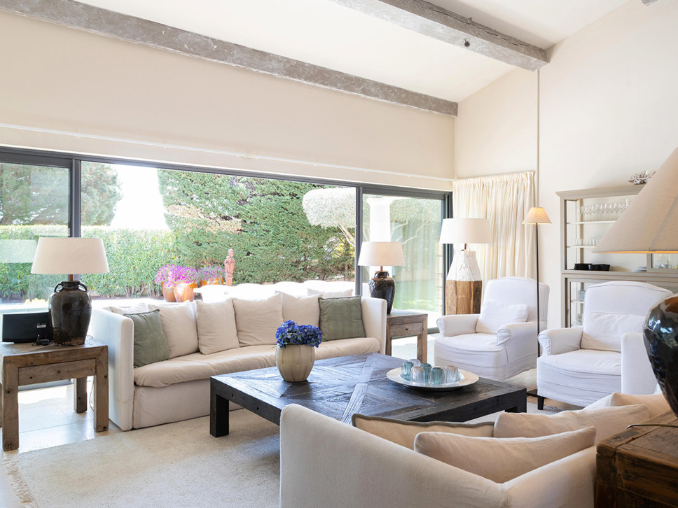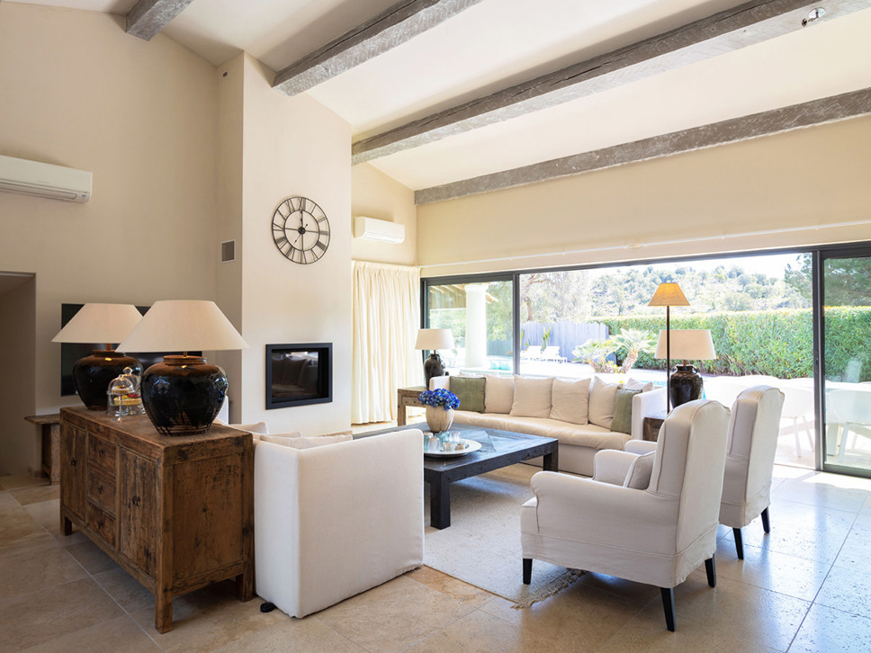 Via de entree komt u uit in de ruime hal, links treft u de royal woonkeuken en rechtdoor loopt u naar de mooie ruime living. In de living is een fraaie zithoek gecreëerd bij de open haard, voorzien van twee comfortabele zitbanken en twee fauteuils. Vanuit de living heeft u uitzicht op het zwembad. De living biedt, via grote schuifpuien, direct toegang tot het terras met het zwembad.