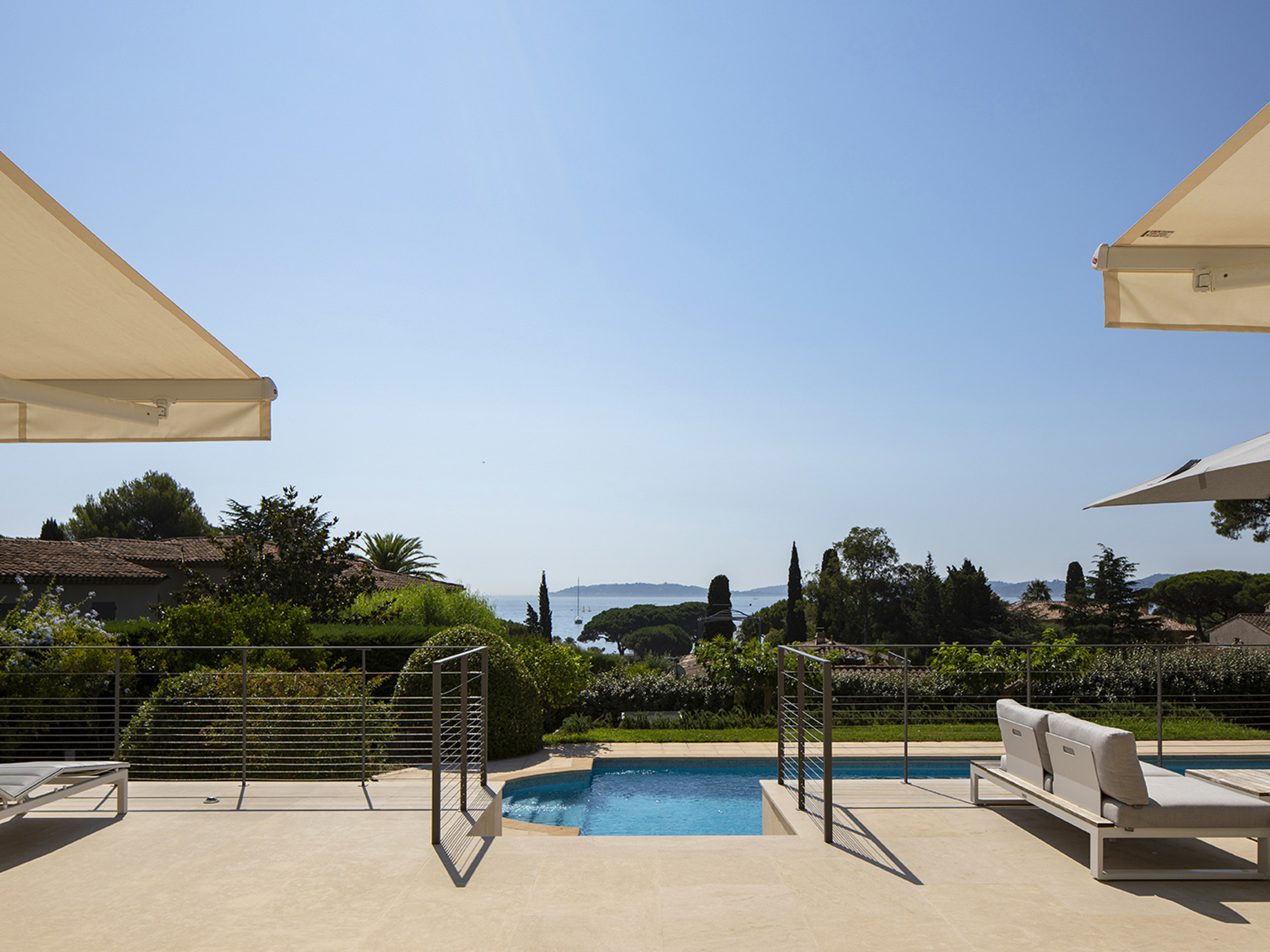 Royale familievilla met privé zwembad te Sainte Maxime, Côte d'Azur. Op loopafstand (220 m.) van het strand. Vanaf het terras kunt u genieten van het panoramische zeezicht en het zicht op de baai van Saint Tropez. Deze villa is geschikt voor 14 personen.