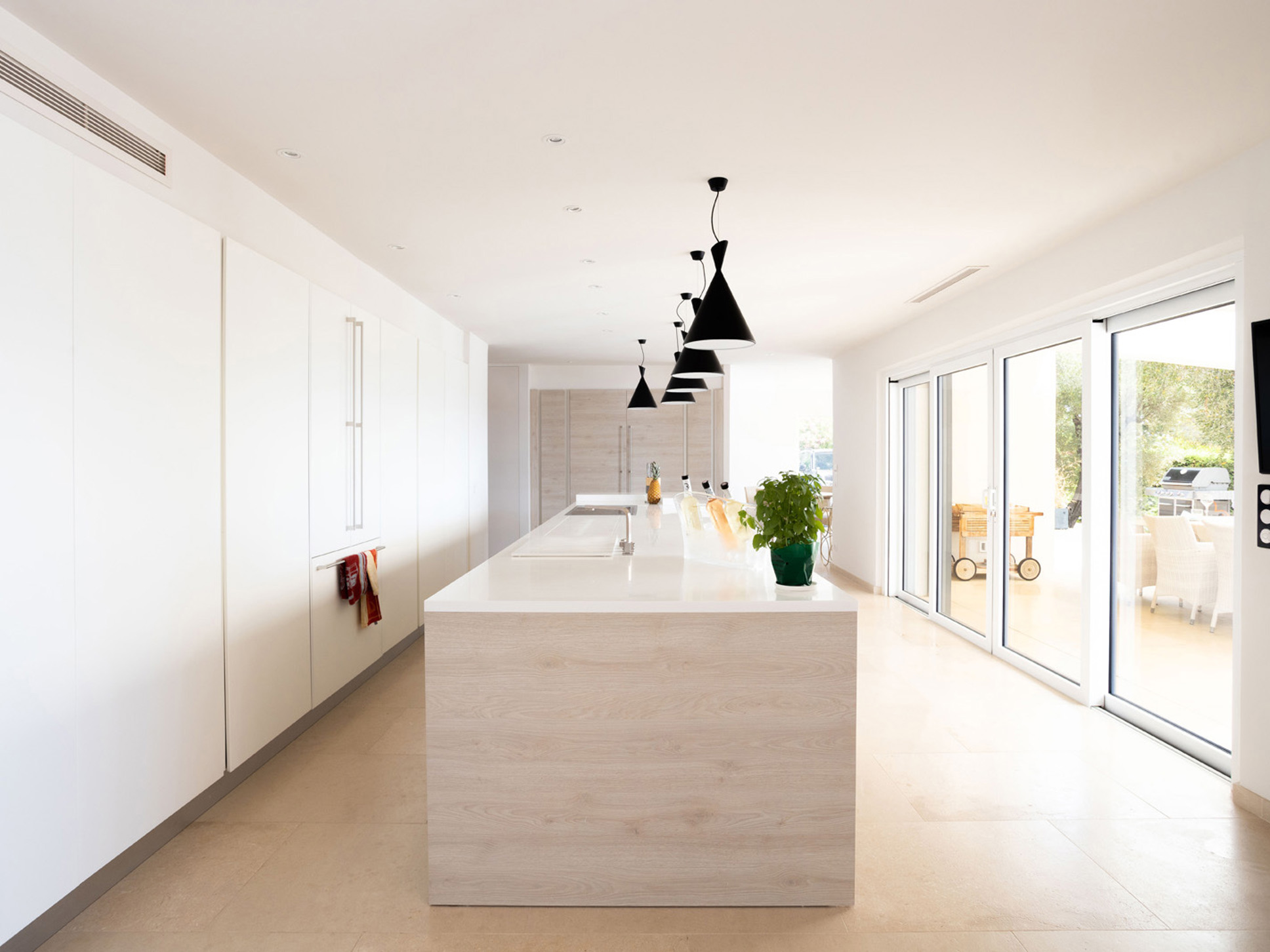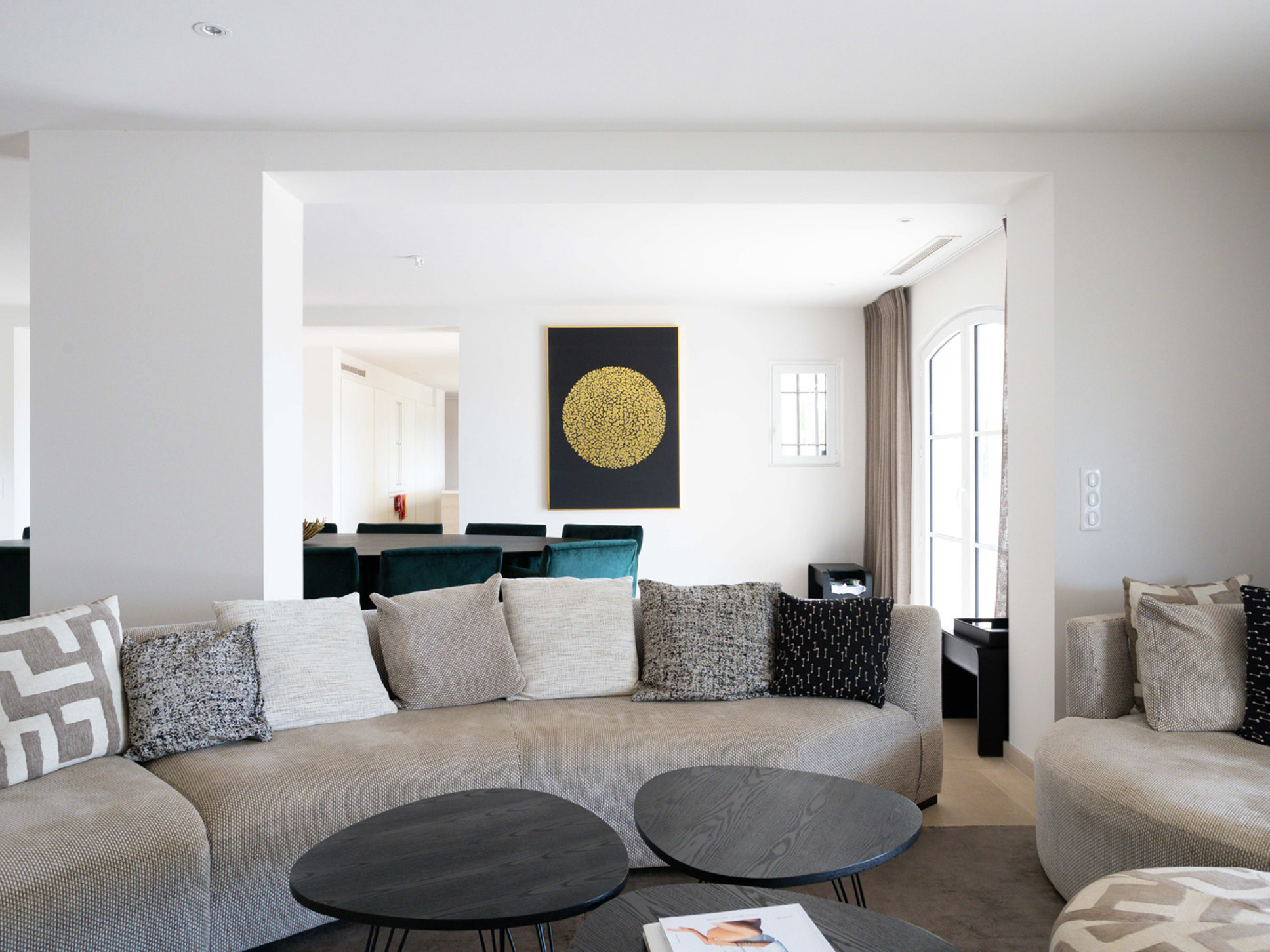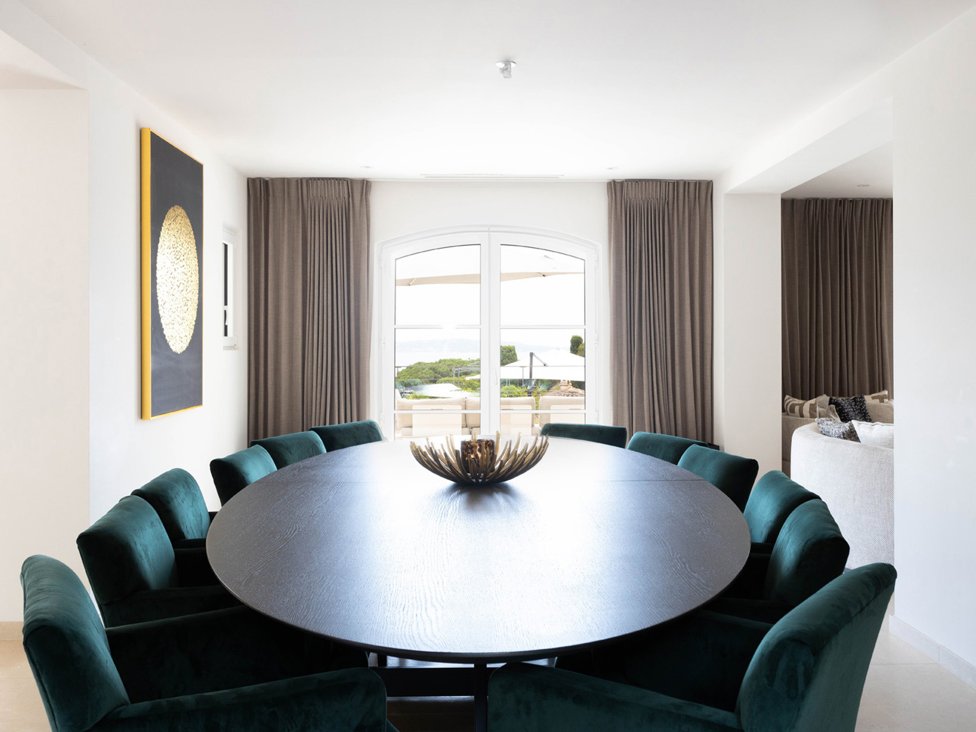 De villa is zeer royaal opgezet met een woonoppervlak van 500 m². De living heeft een ruime, comfortabele rondzit met plaats voor iedereen. Er is satelliet-TV en een Sonos muziekinstallatie. Vanuit de living stapt u direct het terras op. Aangrenzend ligt de eetkamer met een grote eettafel en stoelen, met uitzicht op terras en zee.