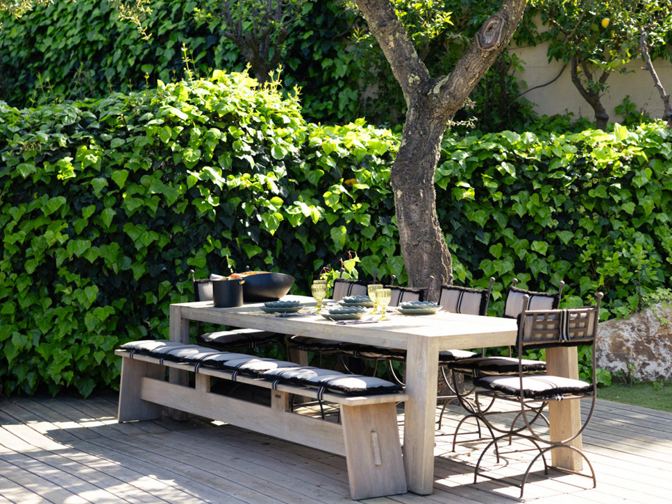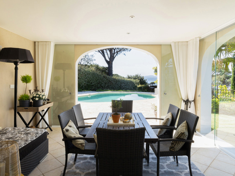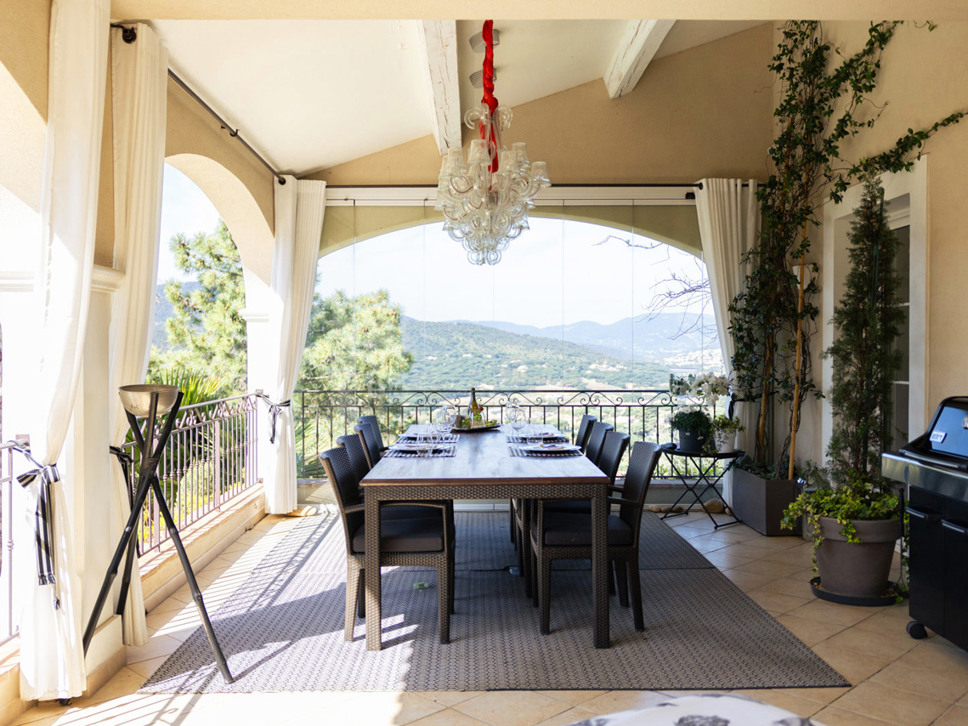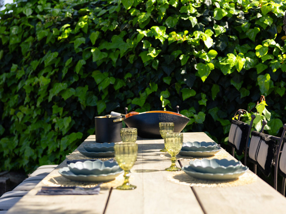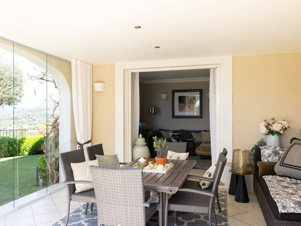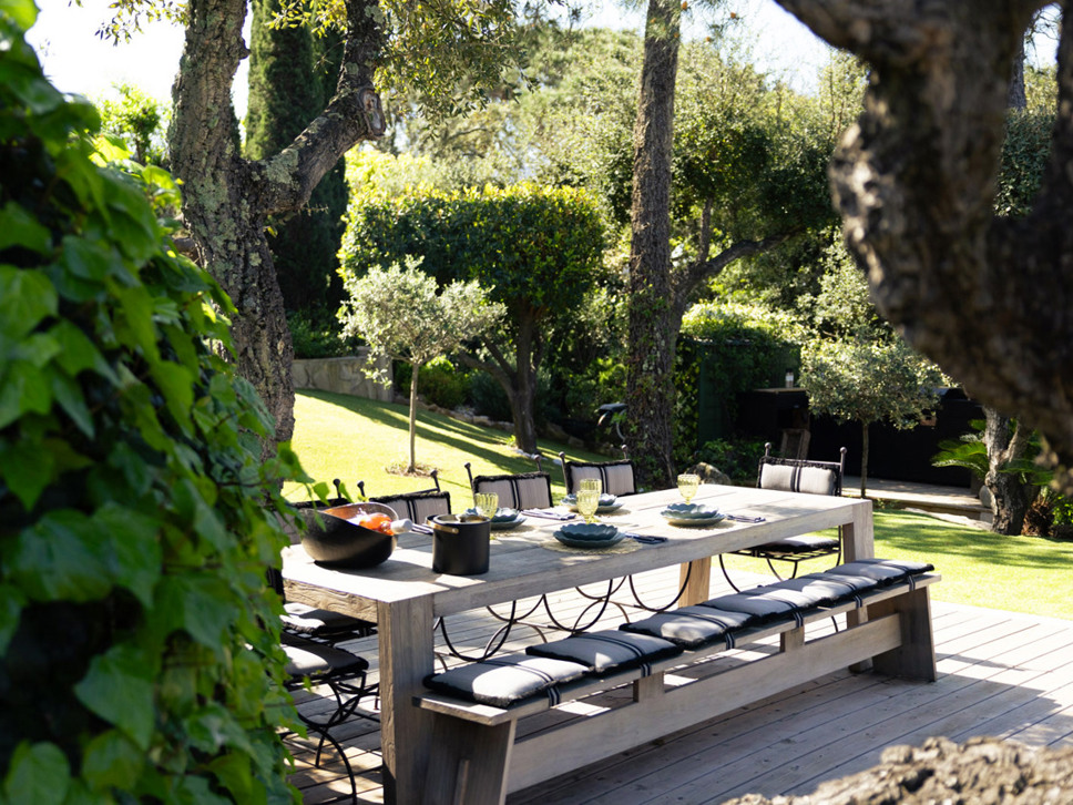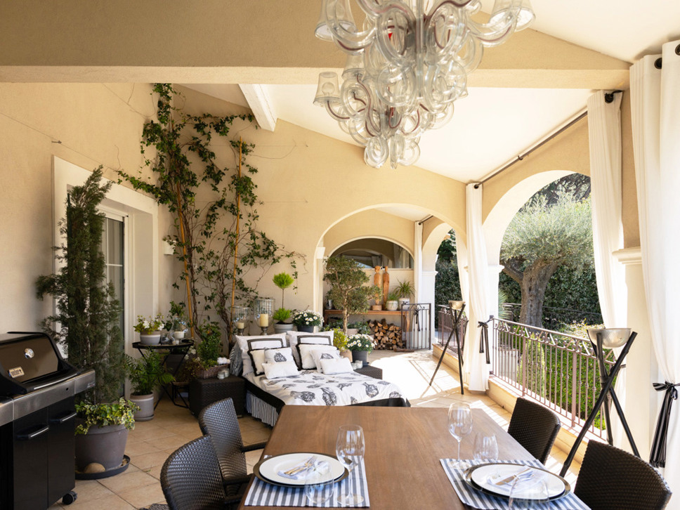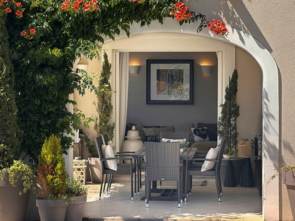 Vanuit de living is er directe toegang tot het overdekte terras met in het verlengde de tuin en het zwembad. Op het gezellig - potten en lantaarns - ingerichte overdekte terras staat de buiten eettafel; wat ons betreft het centerpoint van de woning.