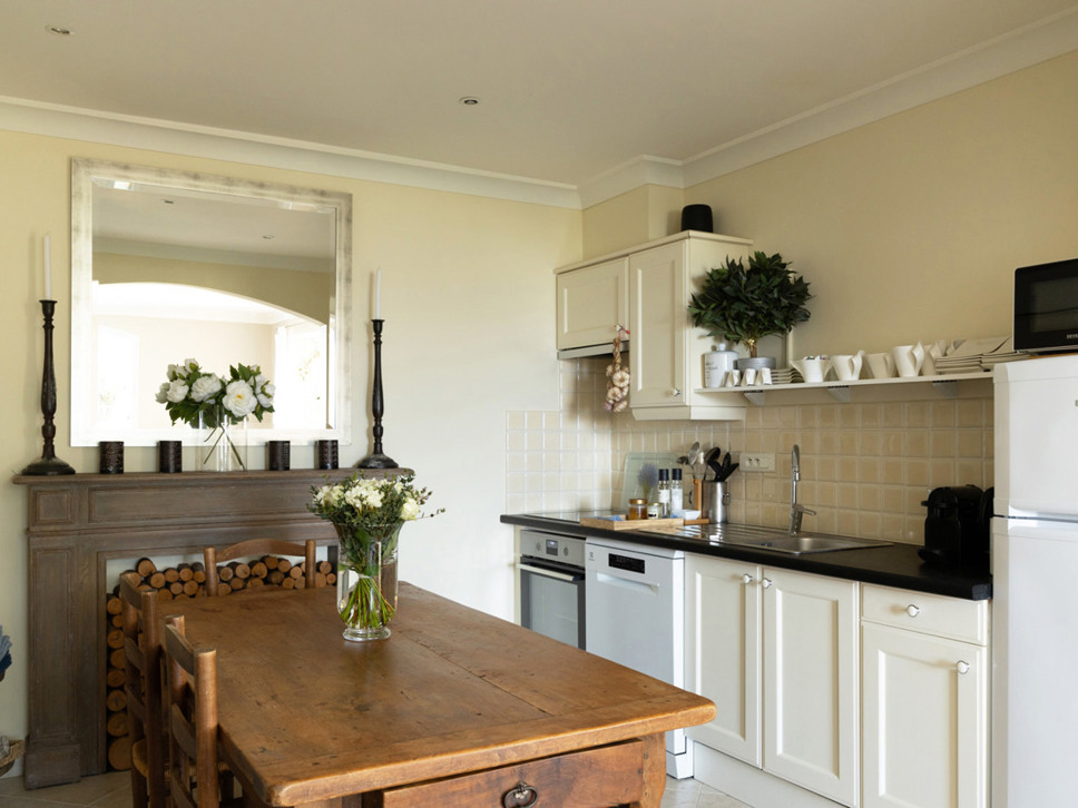 De keuken is goed voorzien van keukengerei en er staat een eettafel. Eten doet u waarschijnlijk buiten aan de tafel op het overdekte terras.