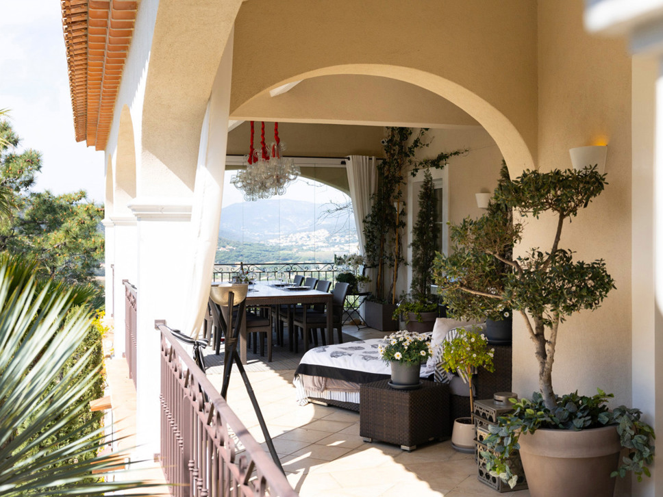 De villa biedt veel meer buitenruimte dan je in eerste instantie zou verwachten. Een pad loopt vanaf het zwembad naar beneden naar een 'tussenterras' met twee ligbedden onder de beschuttig van een olijfboom. Hier staan verder een comfortabel ligbed voor twee personen en een tafeltje met twee stoelen. Vervolgens leidt het pad verder naar beneden naar een groot terras met een ruime buitenkeuken, een grote eettafel met plaats voor 10 personen, een schommel en ook weer meerdere zitjes. Hier heeft u ook een mooi uitzicht over de vallei.