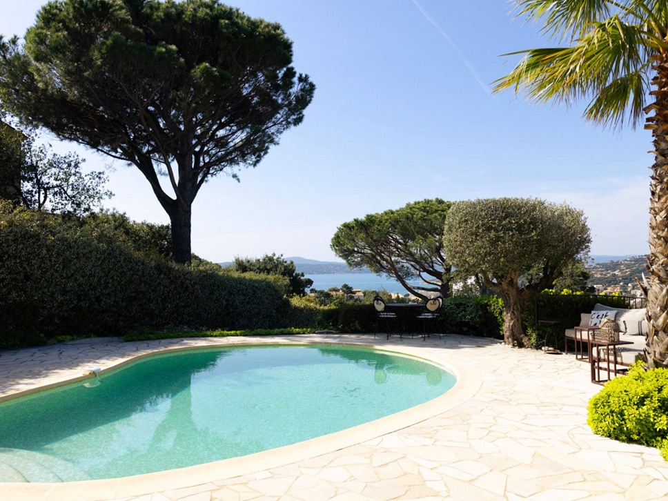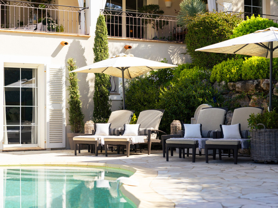 Het zwembad is organisch van vorm en meet ongeveer 5 meter in de rondte. Rondom het zwembad staan vier luxe ligbedden, diverse zitjes, een bistrotafeltje met stoelen en parasols.