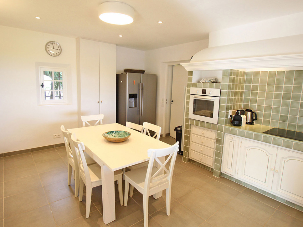 In het verlengde van de living bevindt zich de eetkamer met een eettafel met 6 stoelen. De eetkamer staat in verbinding met een royale Provençaalse keuken. De keuken is compleet en voorzien een magnetron, koelkast, oven, vaatwasser en inductiekookplaat.