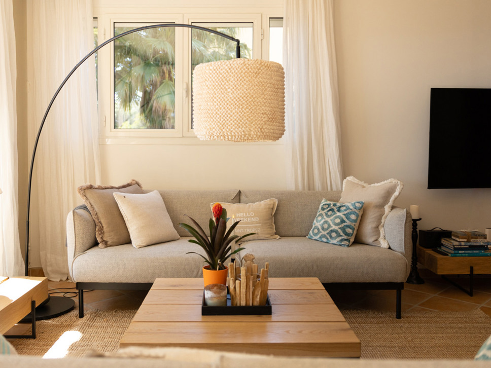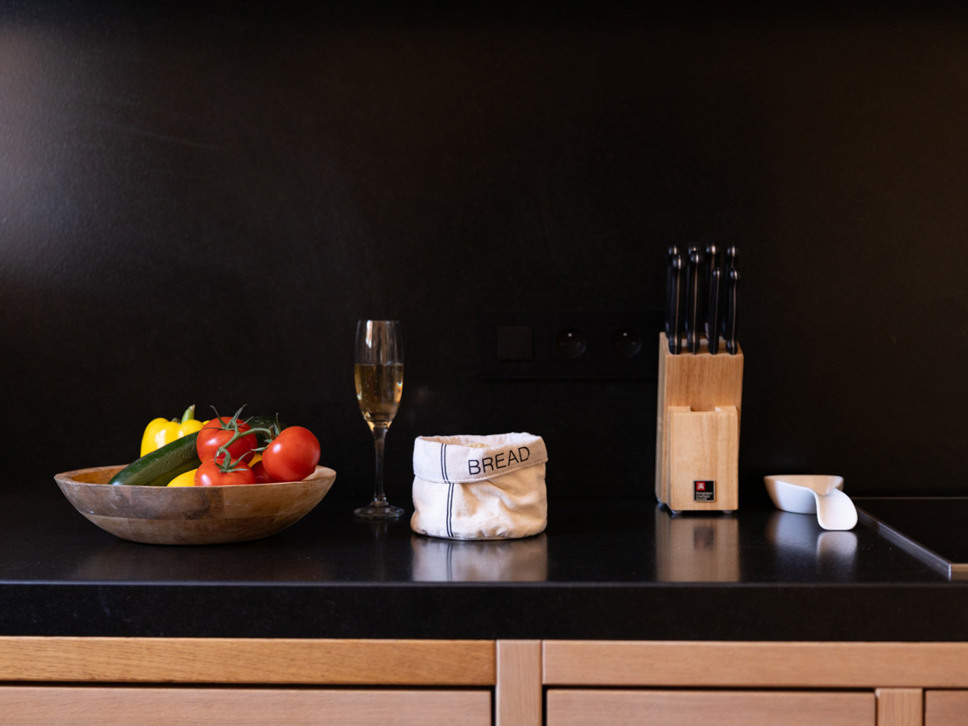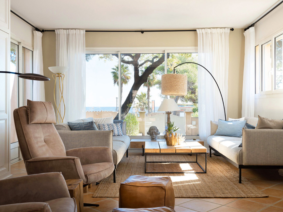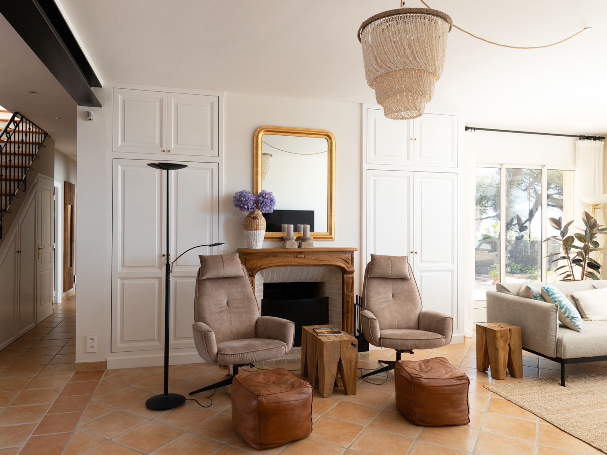 De woonkamer is eigentijds ingericht met oog voor detail. Een comfortabele zithoek met luxe banken, een open haard en smaakvolle accessoires nodigt uit tot ontspannen avonden. Vanaf hier geniet u van een prachtig uitzicht op zee. De zithoek is voorzien van een grote LED Smart TV met Apple TV, toegang tot Netflix en Prime Video, én het Orange-basispakket met een ruime keuze aan Franse en internationale zenders.