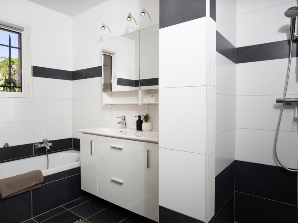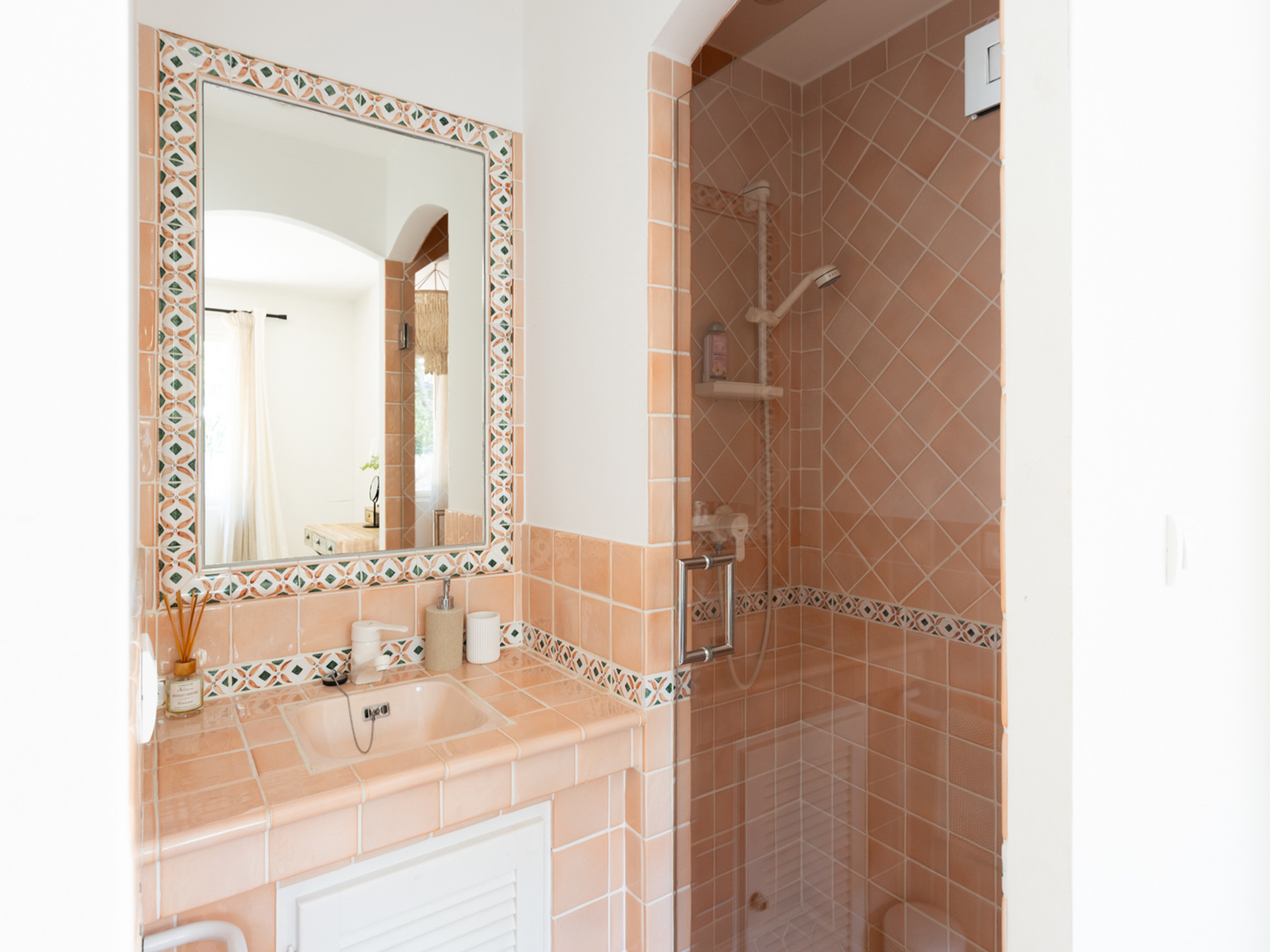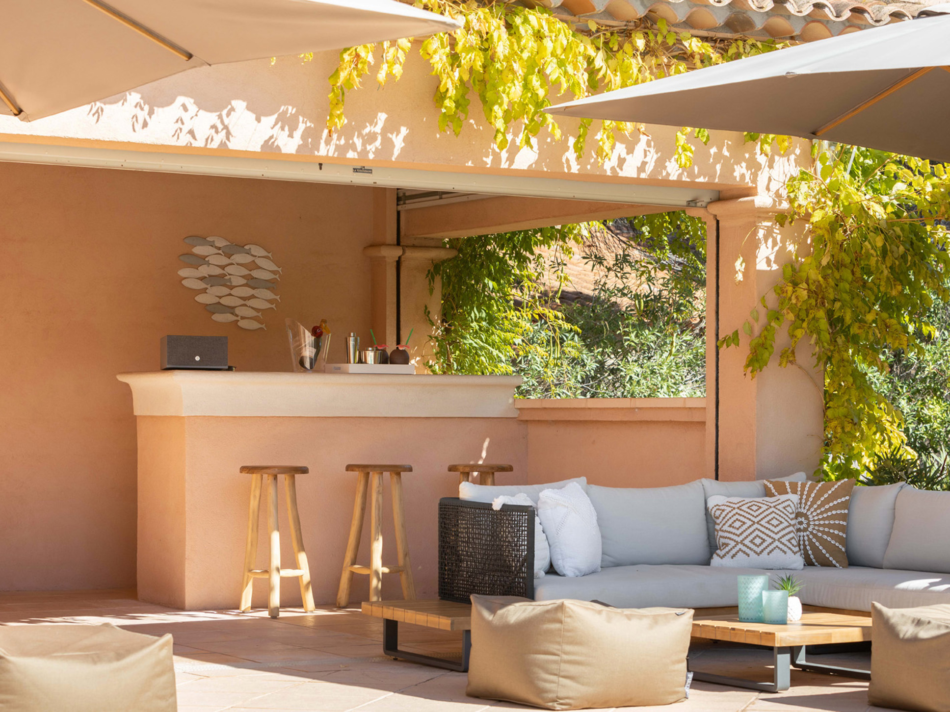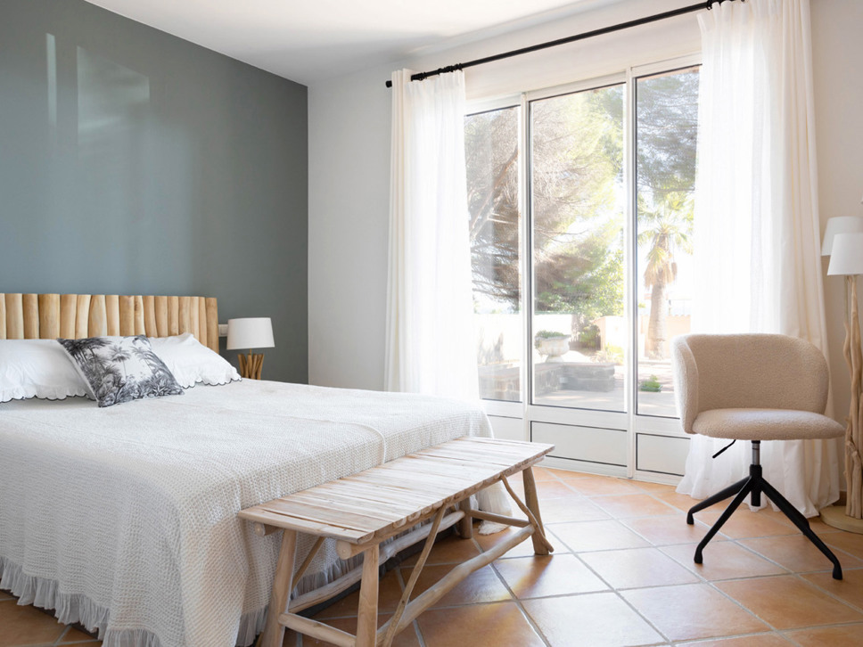 Slaapkamer 5, “Provence”: met zeezicht en een tweepersoonsbed (160x200). Deze twee slaapkamers delen een ruime badkamer met ligbad, aparte douche en dubbele wastafel.De villa ligt aan de kustweg direct tegenover het strand en de strandclubs. Het privéterrein van de villa is omheind en afgesloten met een elektrische poort. Het uitzicht is over de binnenplaats richting de zee. De binnenplaats heeft een stijlvolle jeu de boules-baan met verlichting en banken onder de hoge palmboom en tegelijkertijd voldoende ruimte voor parkeren en/of balspelen.