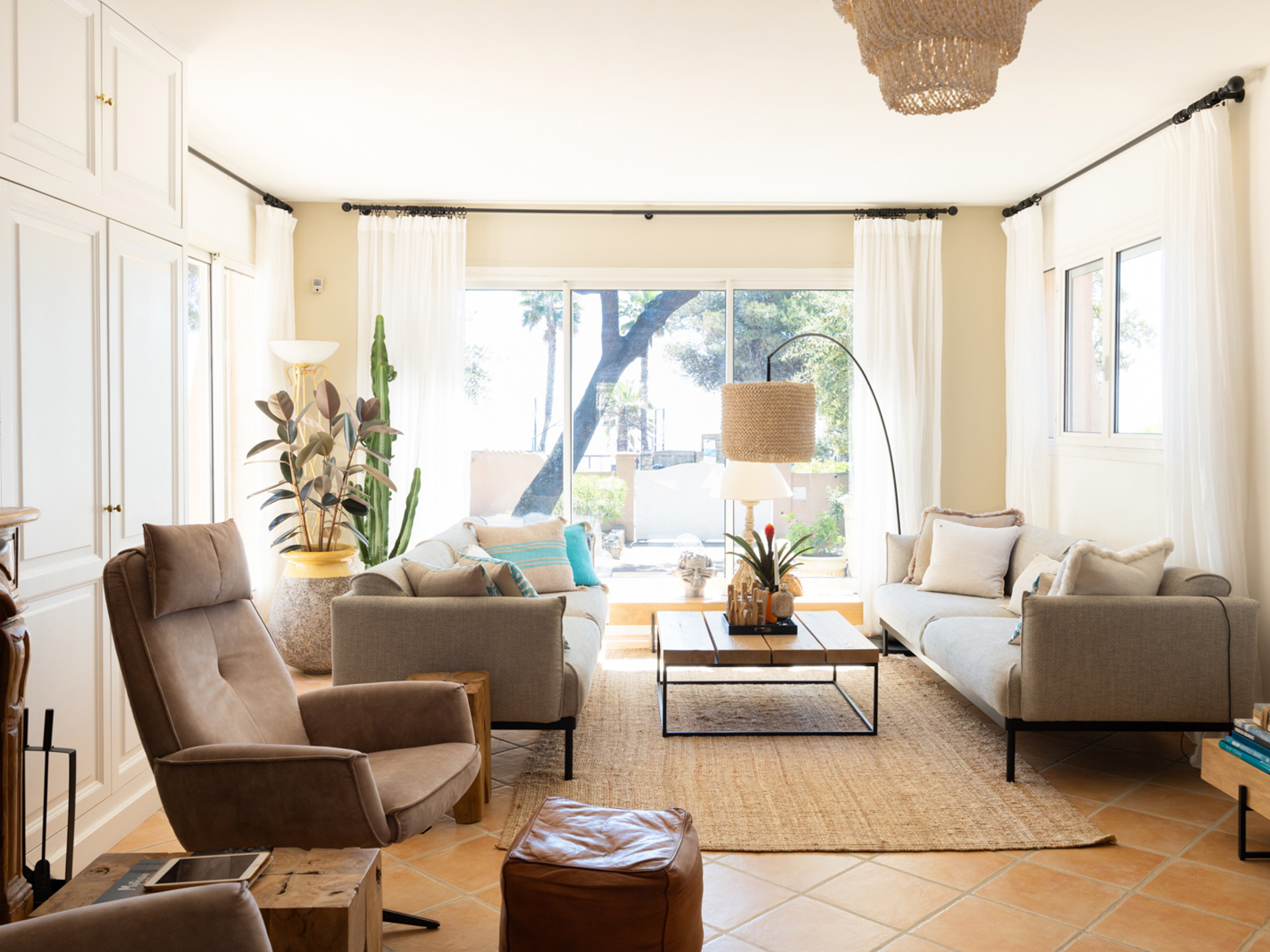 De begane grond van deze stijlvolle villa herbergt de sfeervolle woonkamer, de royale eetkamer en een moderne open keuken, evenals drie van de in totaal vijf slaapkamers.