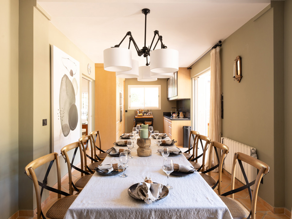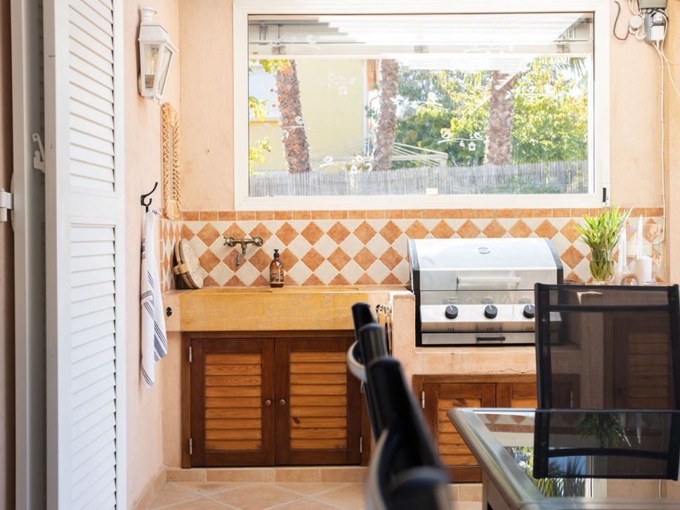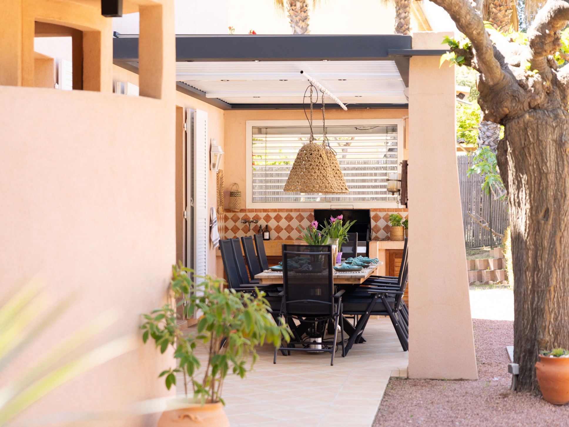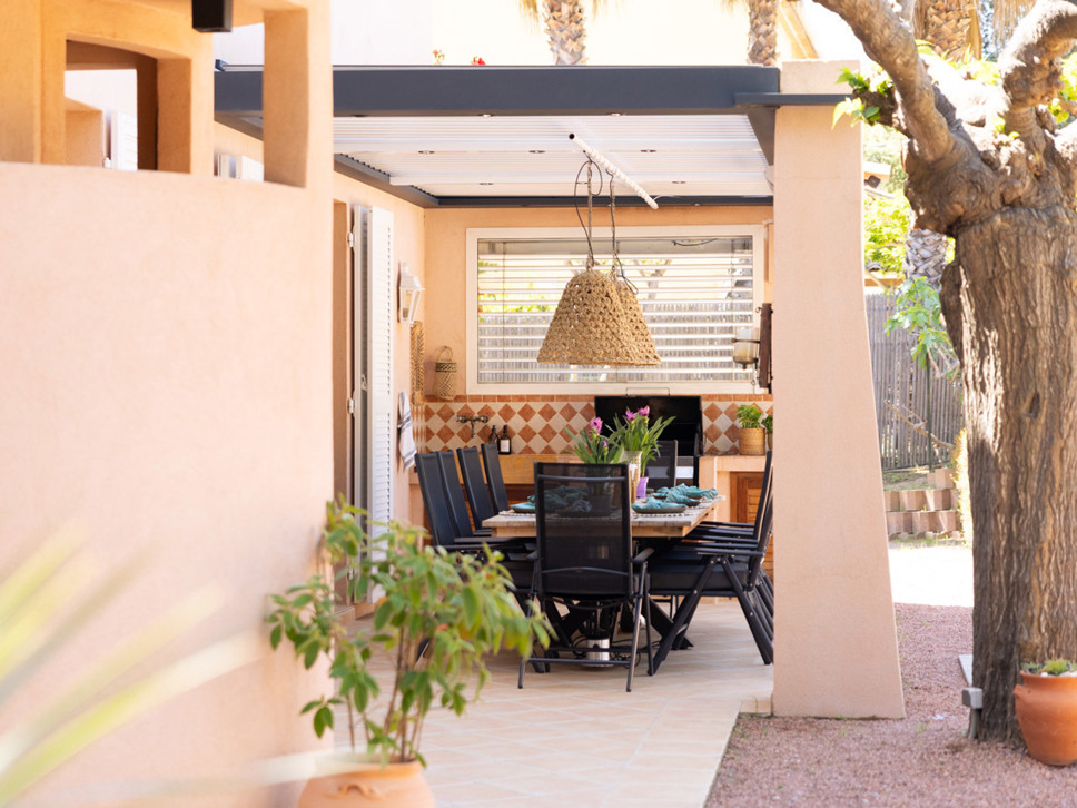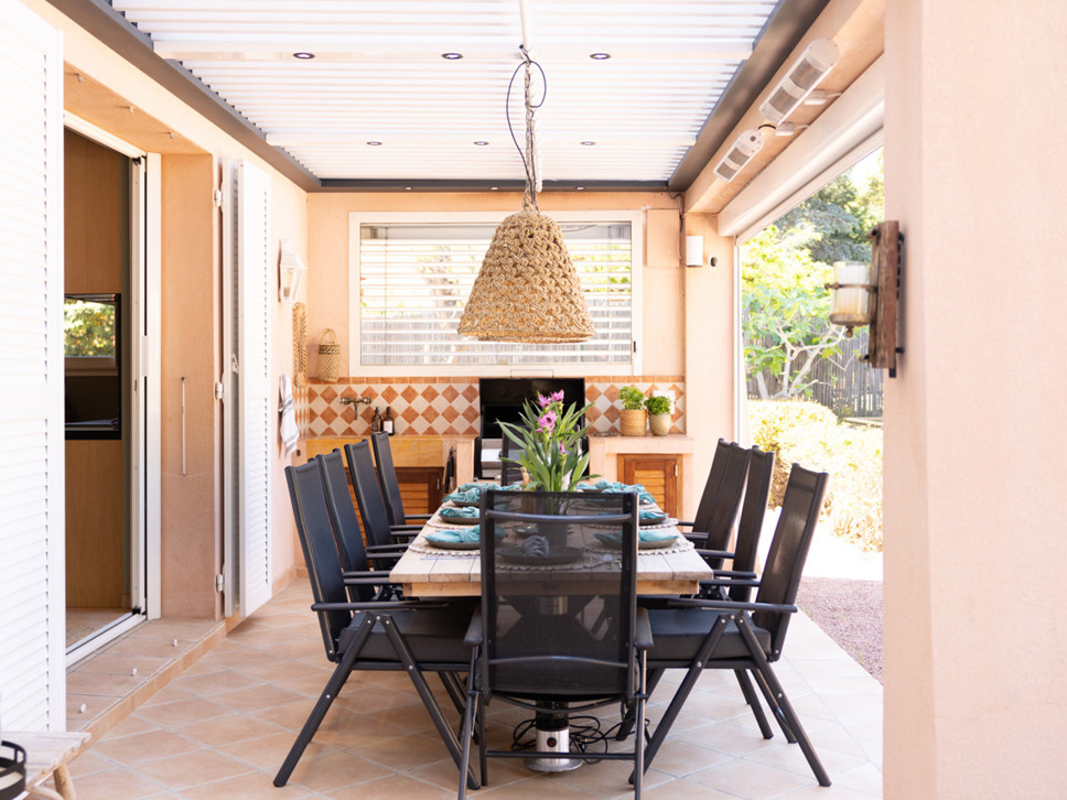 Zowel de eetkamer als de keuken geven direct toegang tot het overdekte terras met zomerkeuken, BBQ en een royale eettafel voor 10 tot 12 personen – perfect voor lange avonden buiten.