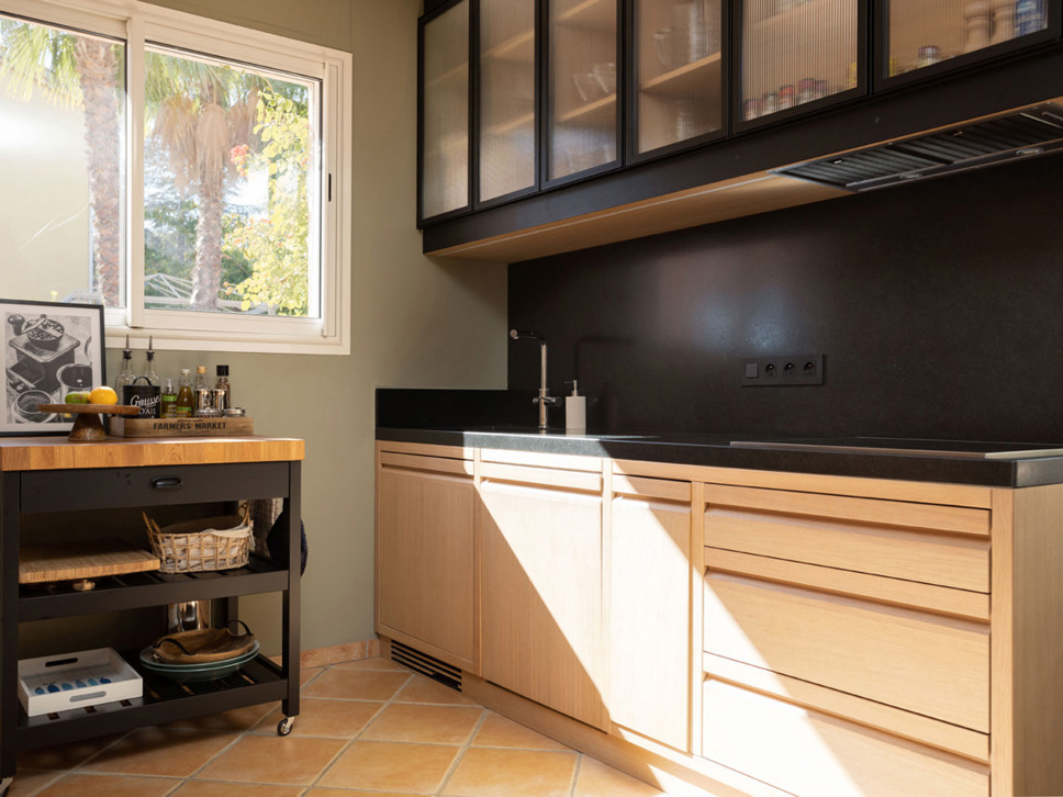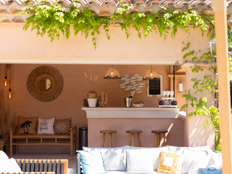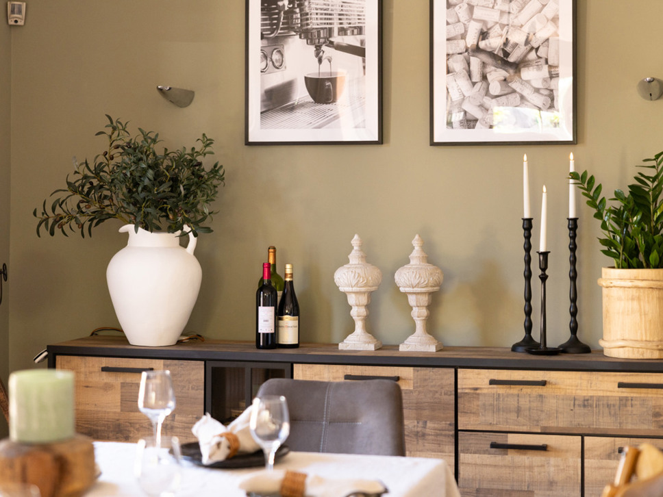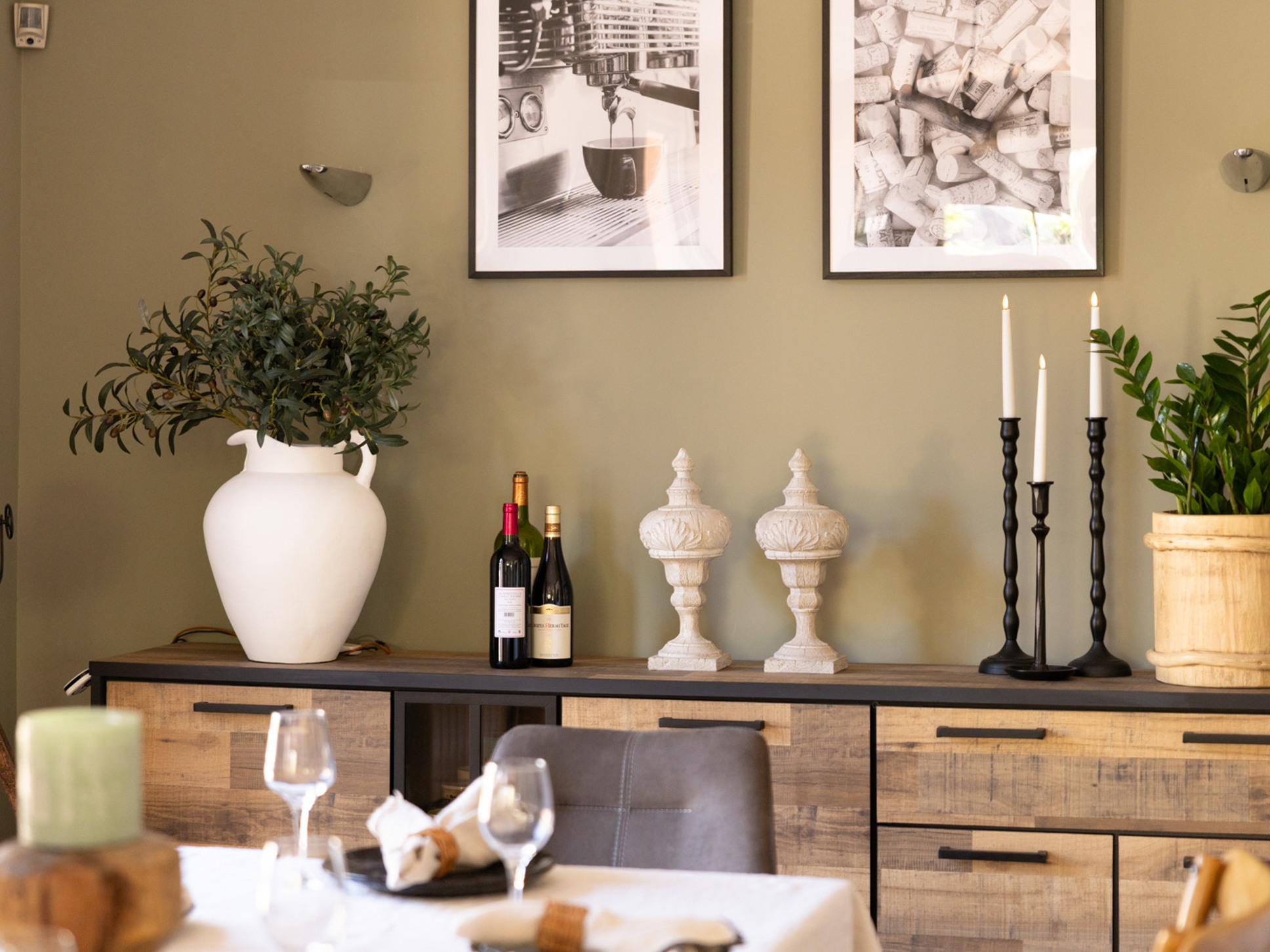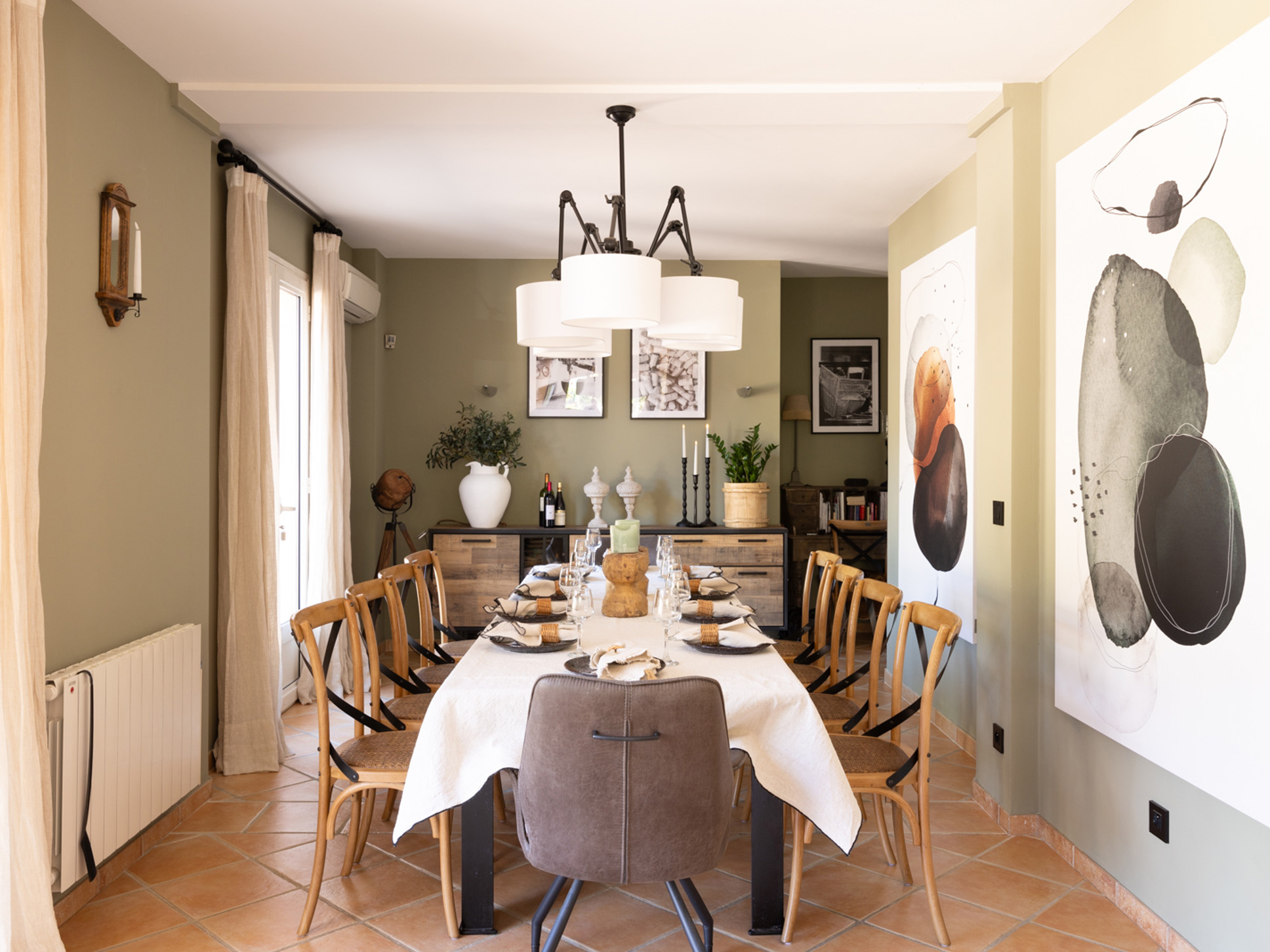 Zowel de eetkamer als de keuken geven direct toegang tot het overdekte terras met zomerkeuken, BBQ en een royale eettafel voor 10 tot 12 personen – perfect voor lange avonden buiten.