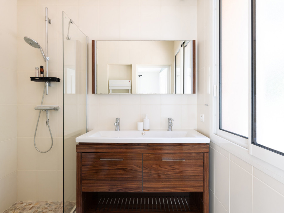 Slaapkamer 1, “La Plage” (begane grond): een ruime kamer met zeezicht, directe toegang tot het voorste terras, een tweepersoonsbed (160x200) en een en-suite badkamer met inloopdouche, dubbele wastafel en toilet.