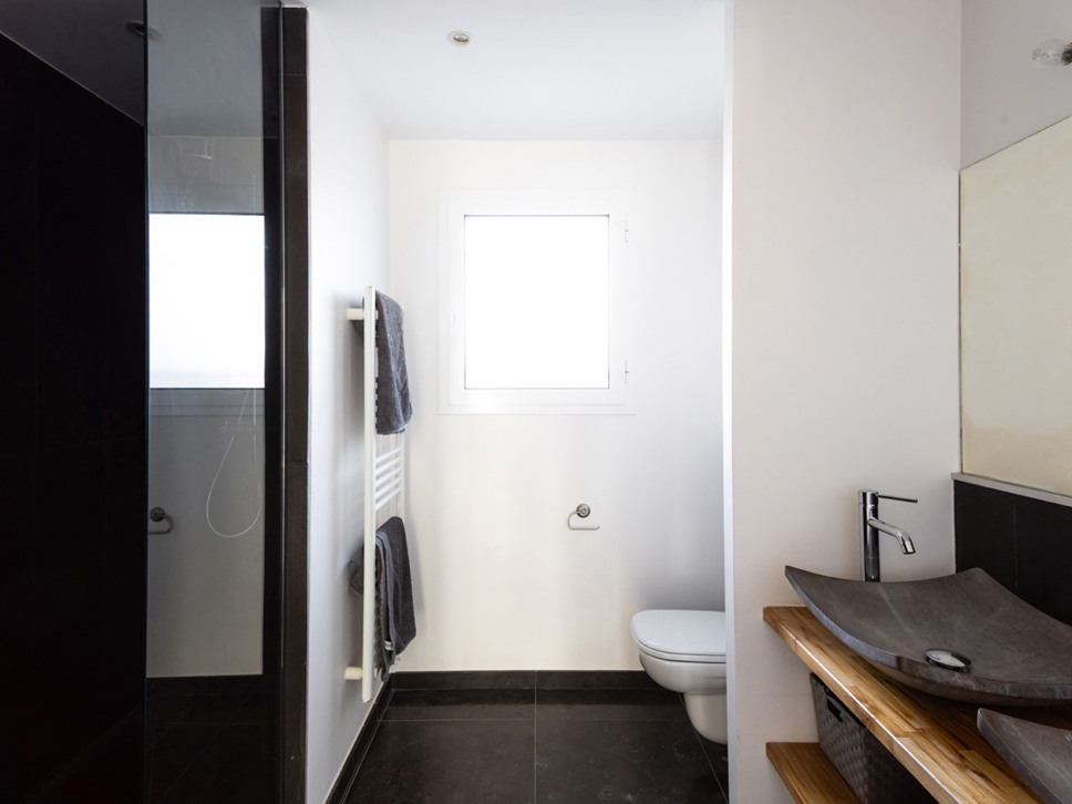 Slaapkamer 2 is gelegen aan de achterzijde van de woning. Het tweepersoonsbed is boxspring (2x90x200). De badkamer is separaat op de gang en biedt een ruime inloop douche, een dubbele wastafel en W.C. Slaapkamer 2 heeft ook een eigen wastafel op de kamer.