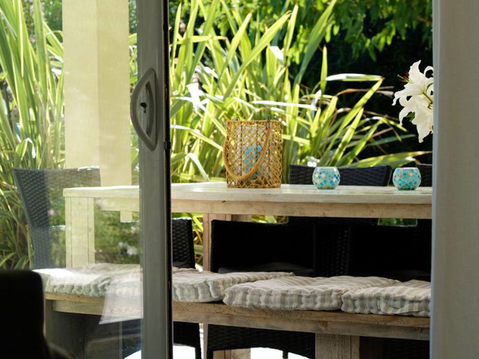Het terras buiten is voorzien van dezelfde tegels als binnen hetgeen de living vloeiend laat overlopen in het buiten terras. Dit geeft een heerlijk ruimtelijk gevoel. Erg leuk is ook de Boretti BBQ welke staat onder de overkapping.