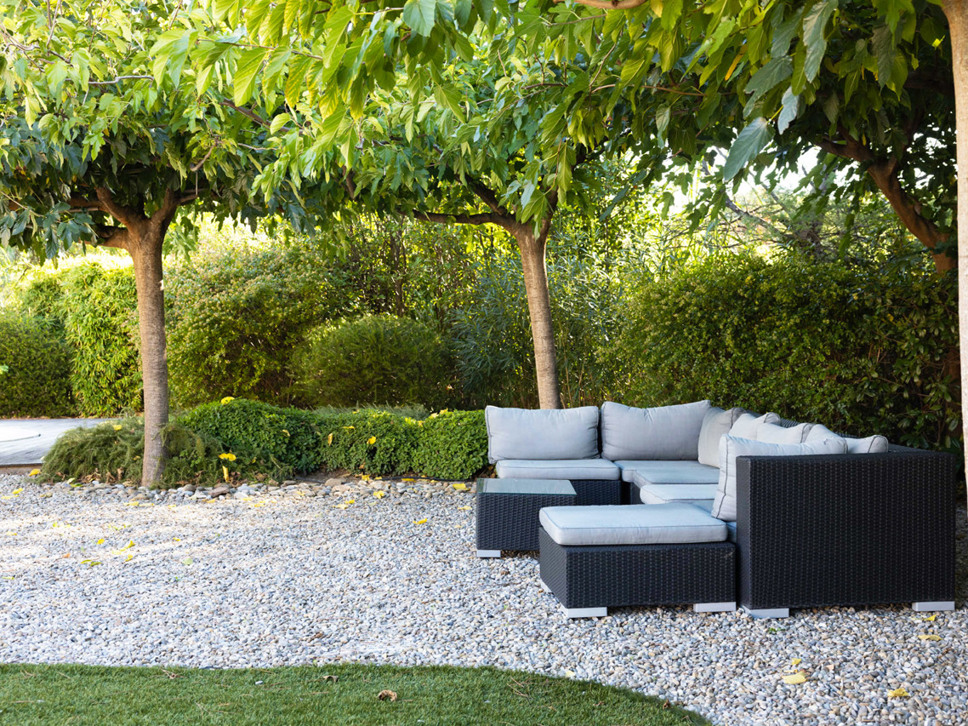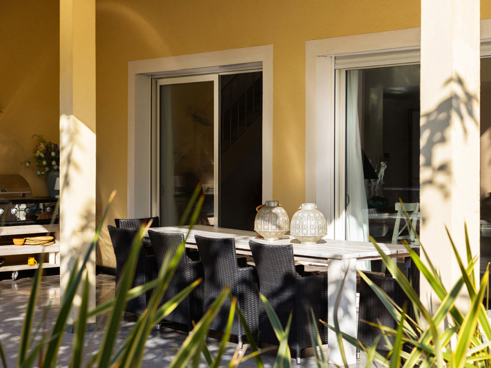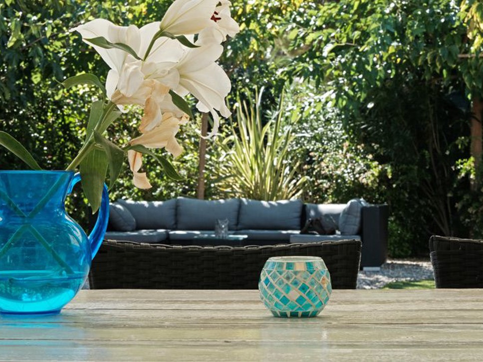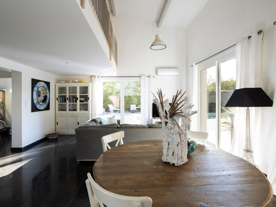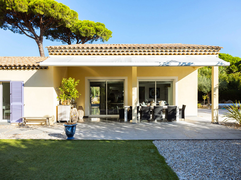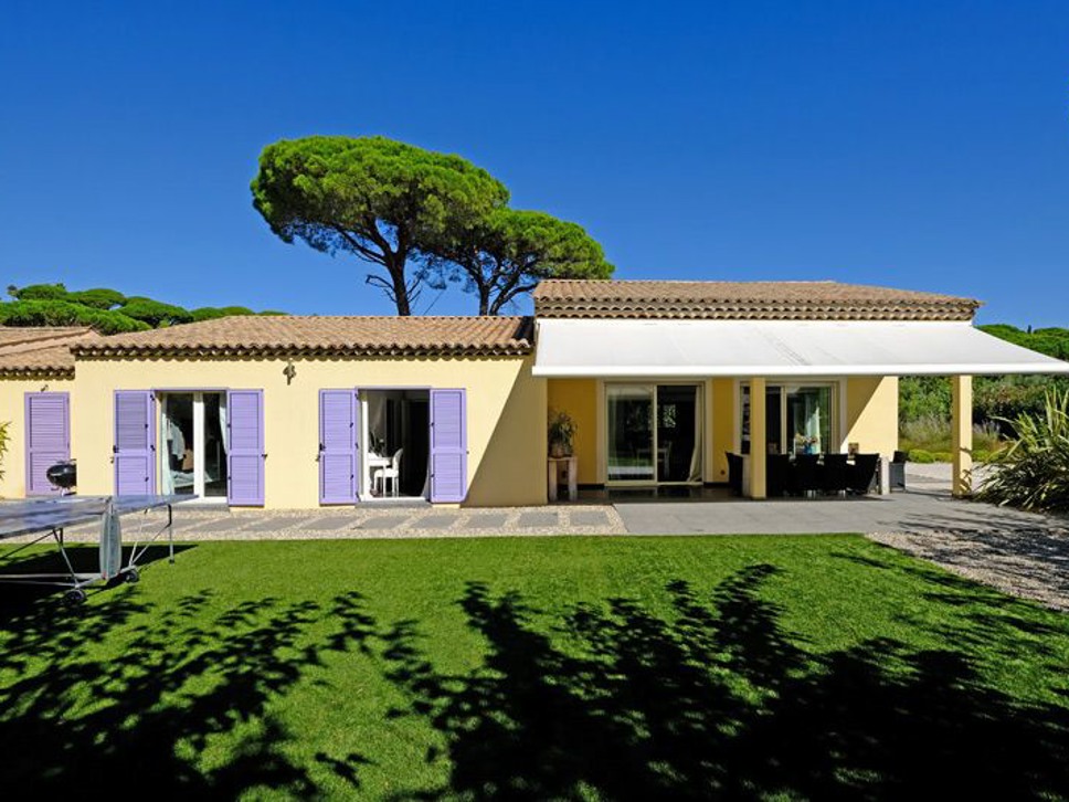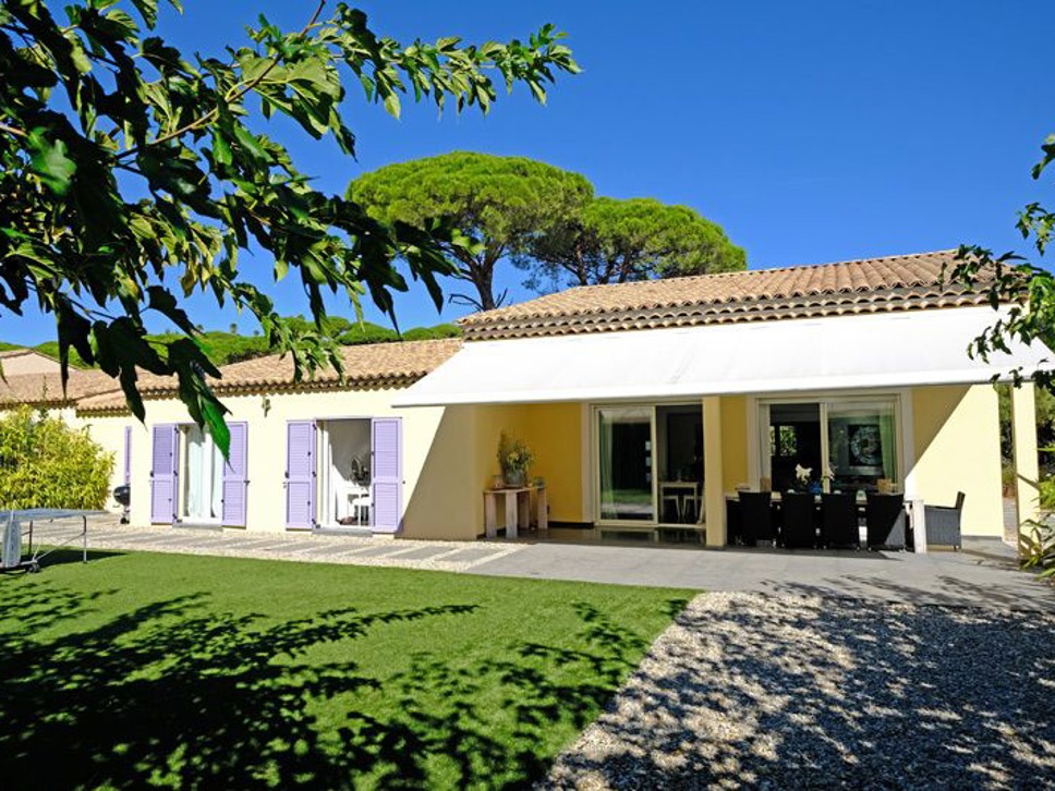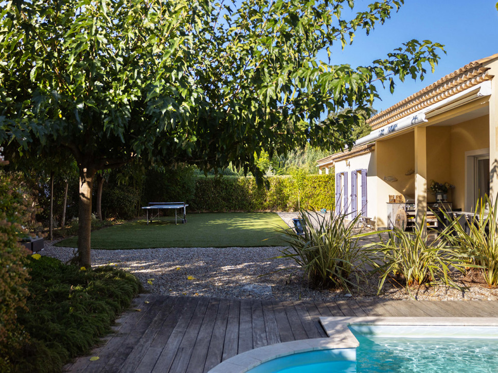 De villa is gelegen op slechts 700 m. van zee en strand, Plage La Nartelle. Vanuit de living en keuken is er rechtstreeks toegang tot het terras. Het terras is overdekt en voorzien van een royale elektrische zonwering. Onder de overkapping staat een ruime houten eettafel met 10 zitplaatsen, de plek voor een heerlijk ontbijt of lunch. Onder de jonge platanen staat een mooie loungeset. Erg aantrekkelijk voor jonge gezinnen is de fraaie grasmat.