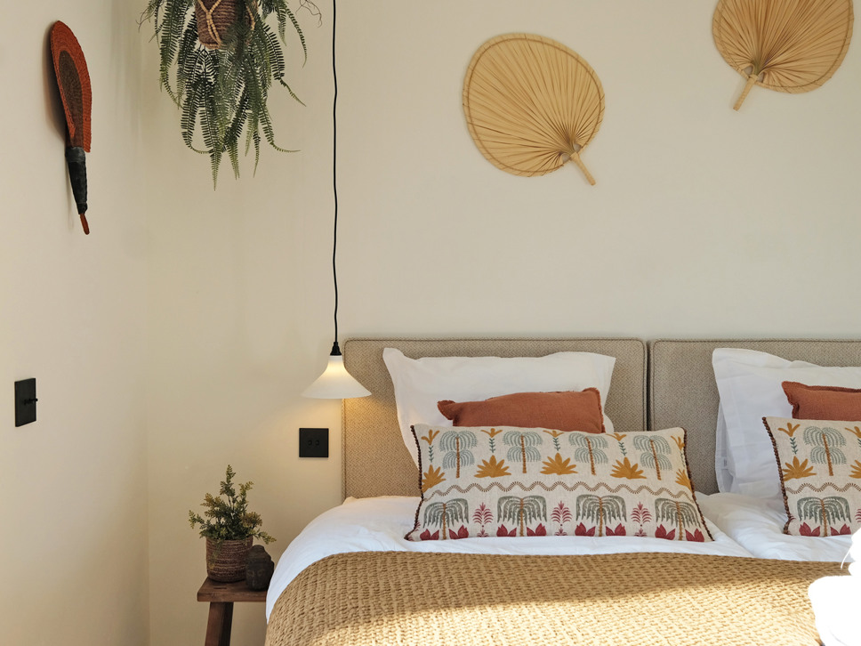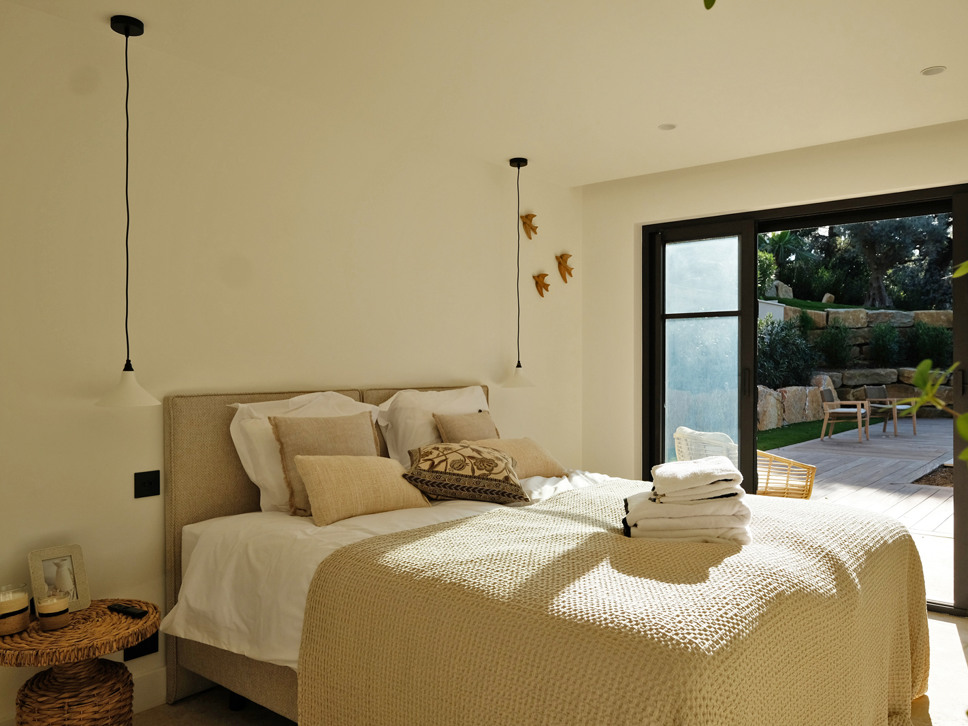 Slaapkamer 2, begane grond, biedt een tweepersoonsbed boxspring (180x200) en een design en-suite badkamer (regendouche, wastafel en separate W.C). Openslaande deuren naar het terras aan zwembadzijde