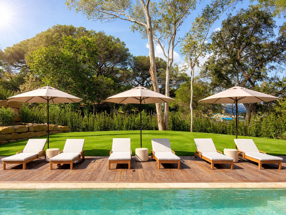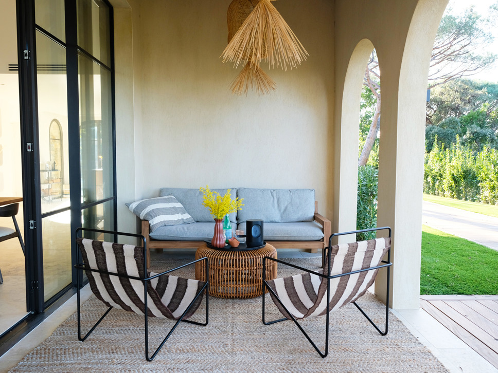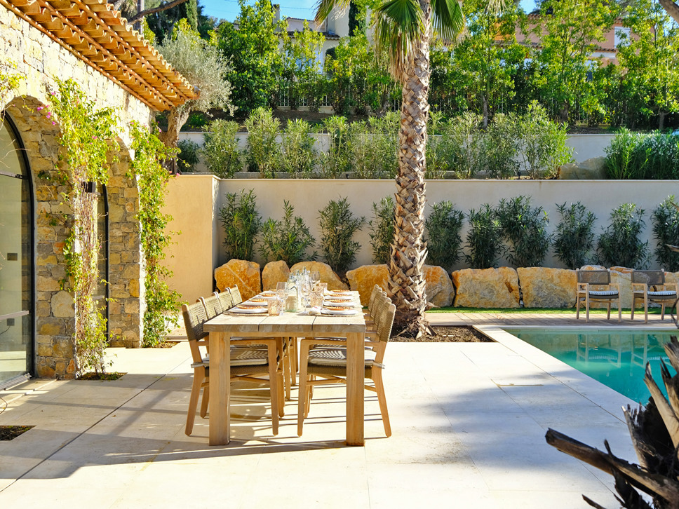 Vanuit de living is er toegang tot een knus overdekt terras met comfy tuinmeubels. Ook is er een leuk zitje bij de jeu de boulesbaan vanwaar zich op de Middelandse Zee.Het zwembad heeft een afmeting van 11 x 5 m met een diepte van 1.50 m. Toegang gaat via een plage. Op het terras bij het zwembad staan 6 zeer comfy sunloungers en 4 parasols.