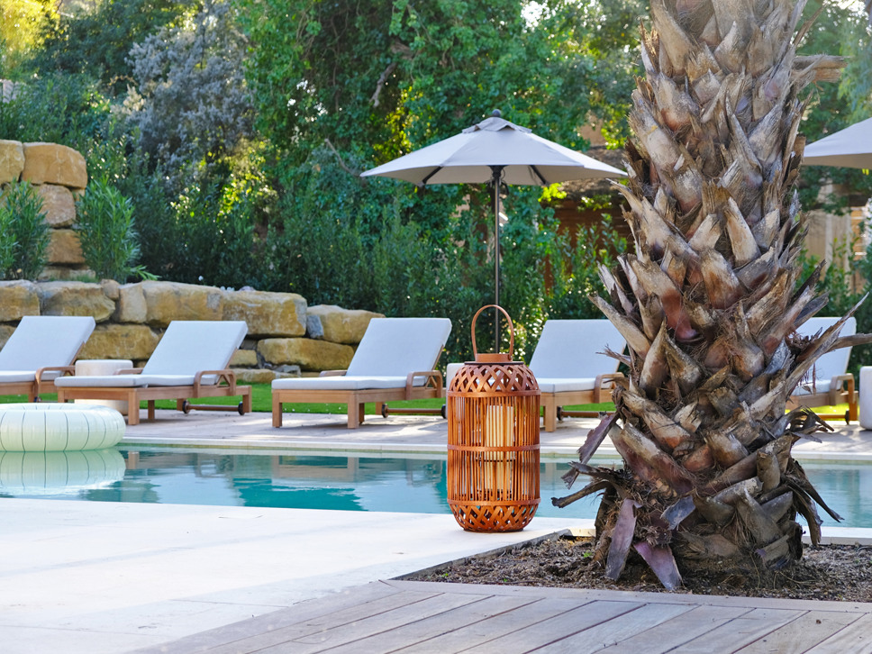 De foto's zijn gemaakt in het begin van het voorjaar met een laag staande zon. De tuin is en het zwembad liggen in de zomer volop in de warme zon.