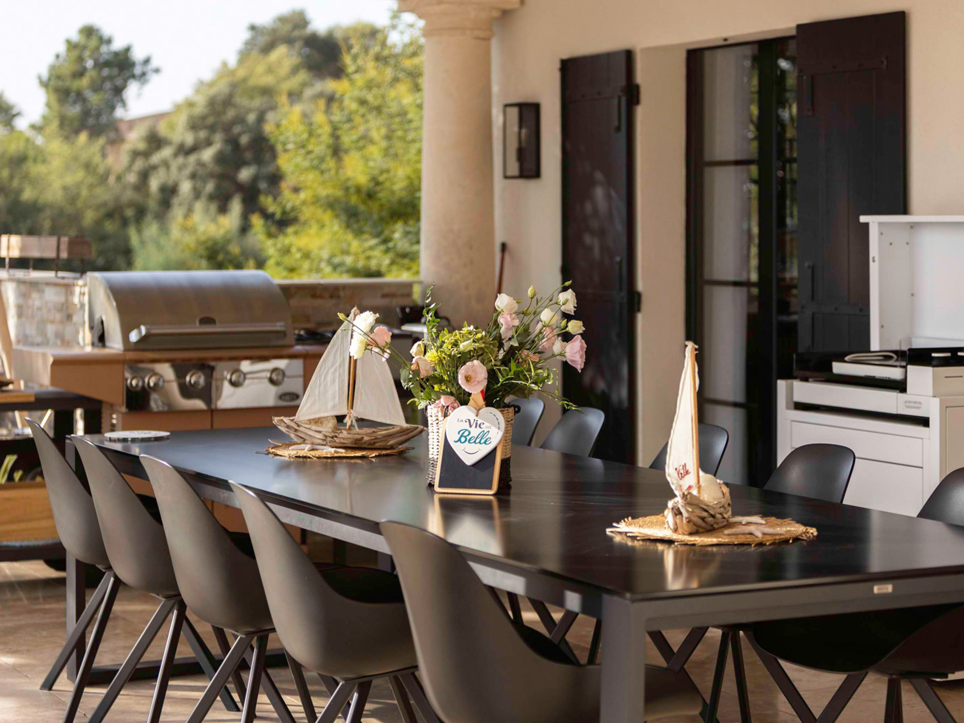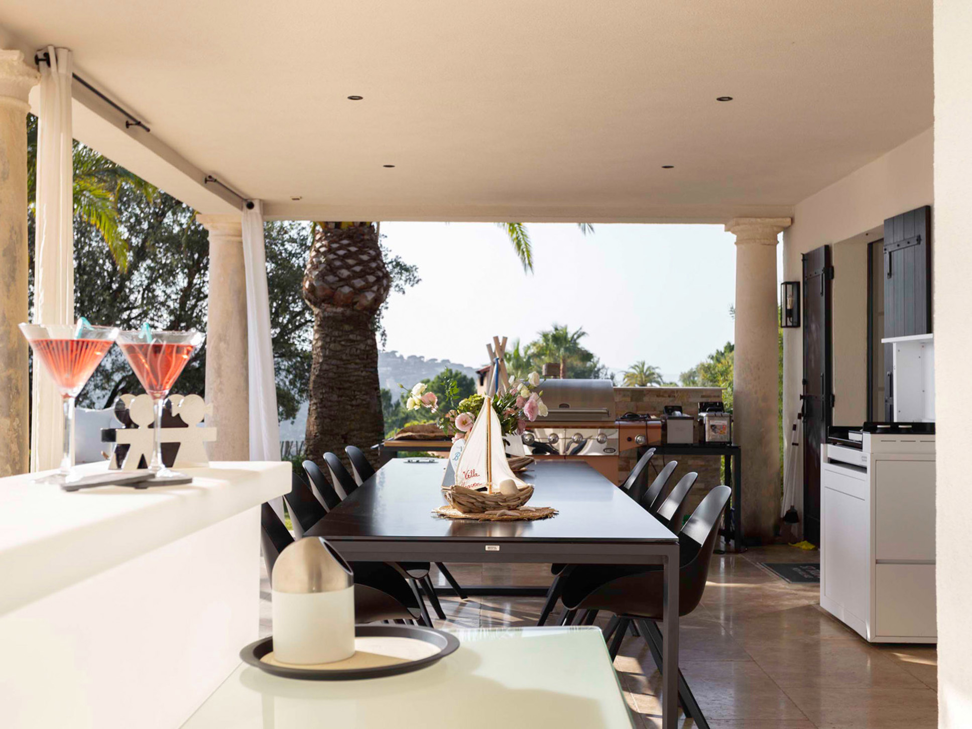Op het niveau van de living en keuken bevindt zich een royaal overdekt terras. Onder het overdekte terras staat een grote houten eettafel en een fraaie design BBQ. Verder staan op het terras divers luxe buitenmeubelen waaronder een loungeset en sunloungers (10). Op het terras bevindt zich ook een buitendouche.