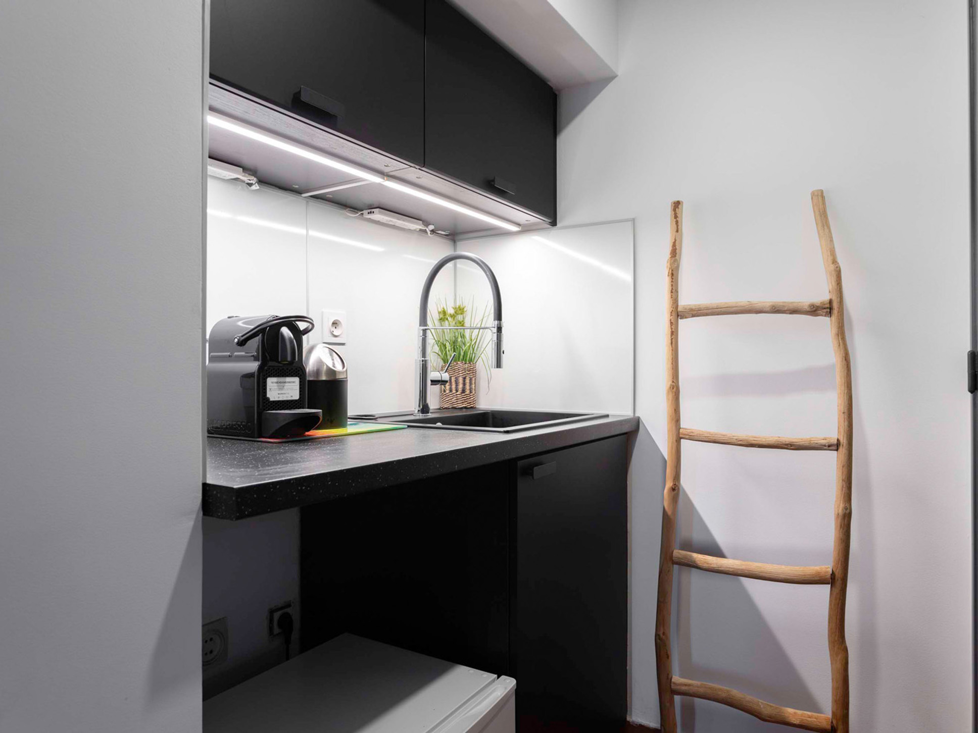 Slaapkamer 5 is feitelijk een royaal appartement op de onderste verdieping. Het bestaat uit een fraaie zithoek met TV. een kitchenette en een kleine badkamer (W.C. wastafel en douche). Het boxspringbed is tweepersoons. (200x200). Een fijne kamer voor bijvoorbeeld grootouders of ouders met een baby. Deze suite is optioneel bij te boeken, zie ook toelichting onder 'In de omgeving'.