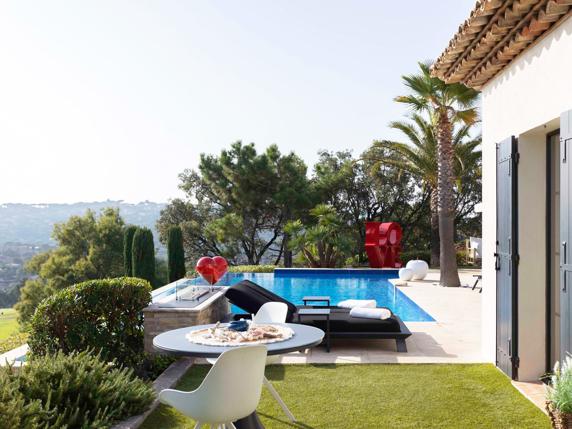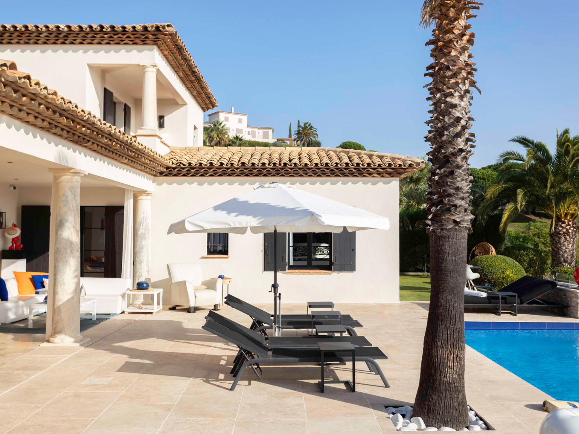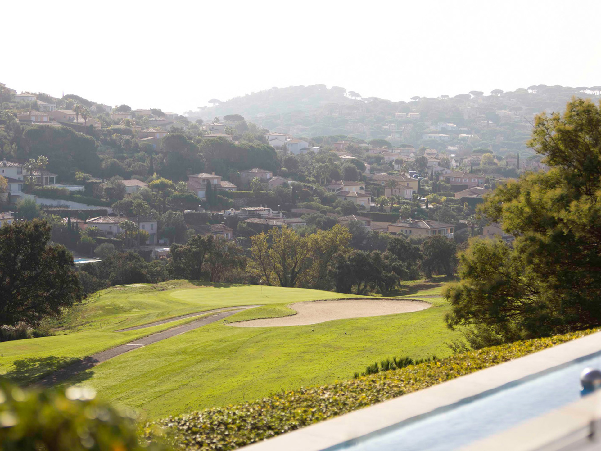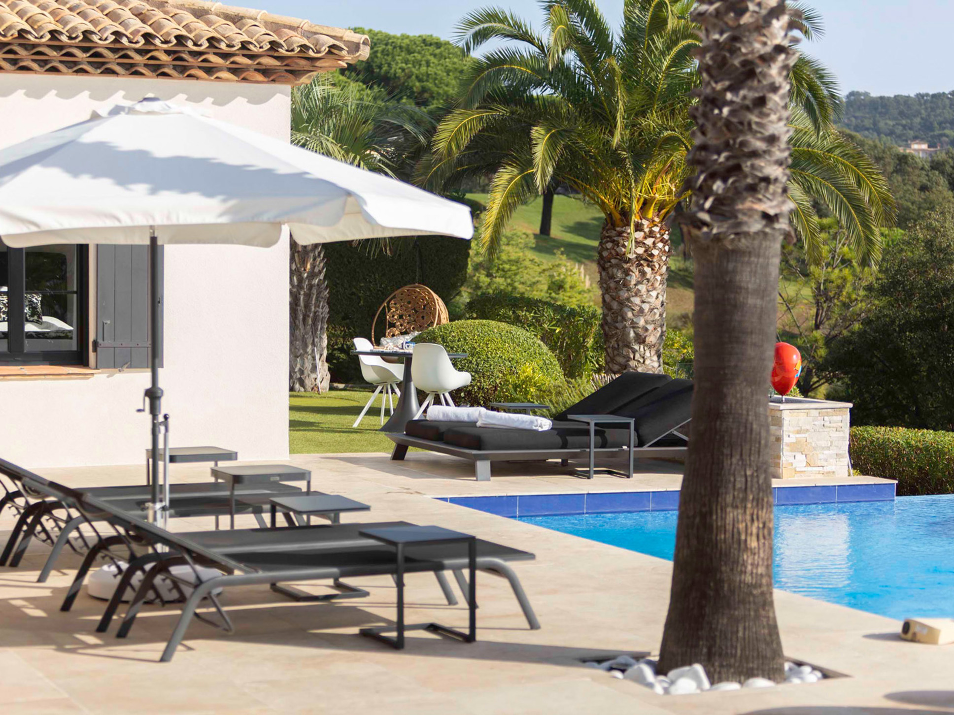 Luxe villa met privé zwembad te Sainte Maxime, Côte d'Azur. 100% airconditioning. Eigentijds interieur binnen en mooi design tuinmeubilair buiten. Uitzicht op de Golfbaan van Sainte Maxime. De villa is geschikt voor 8 - 10 personen.
