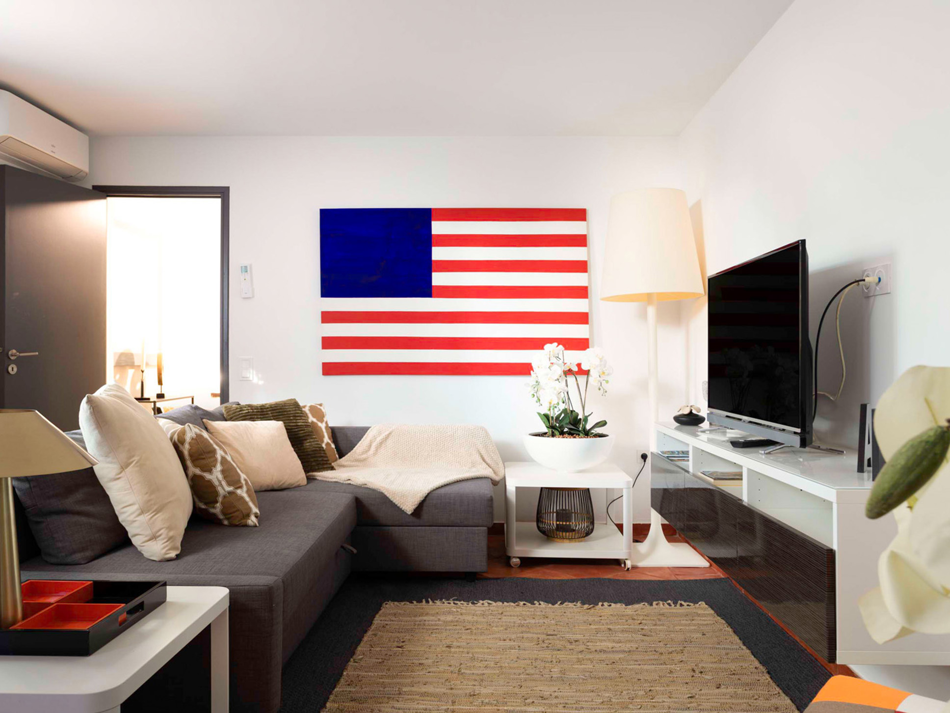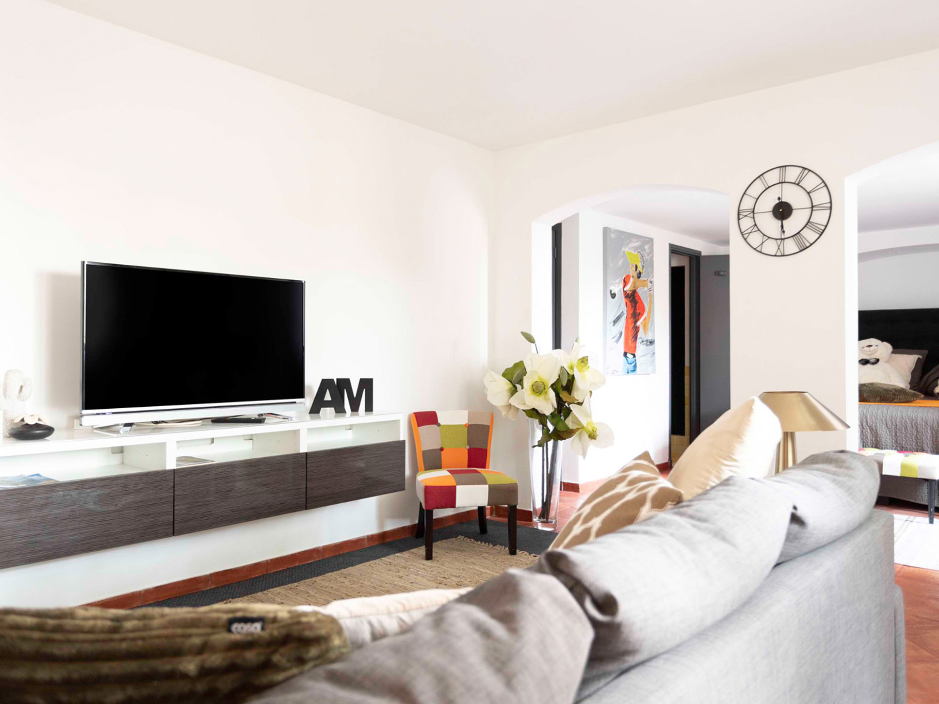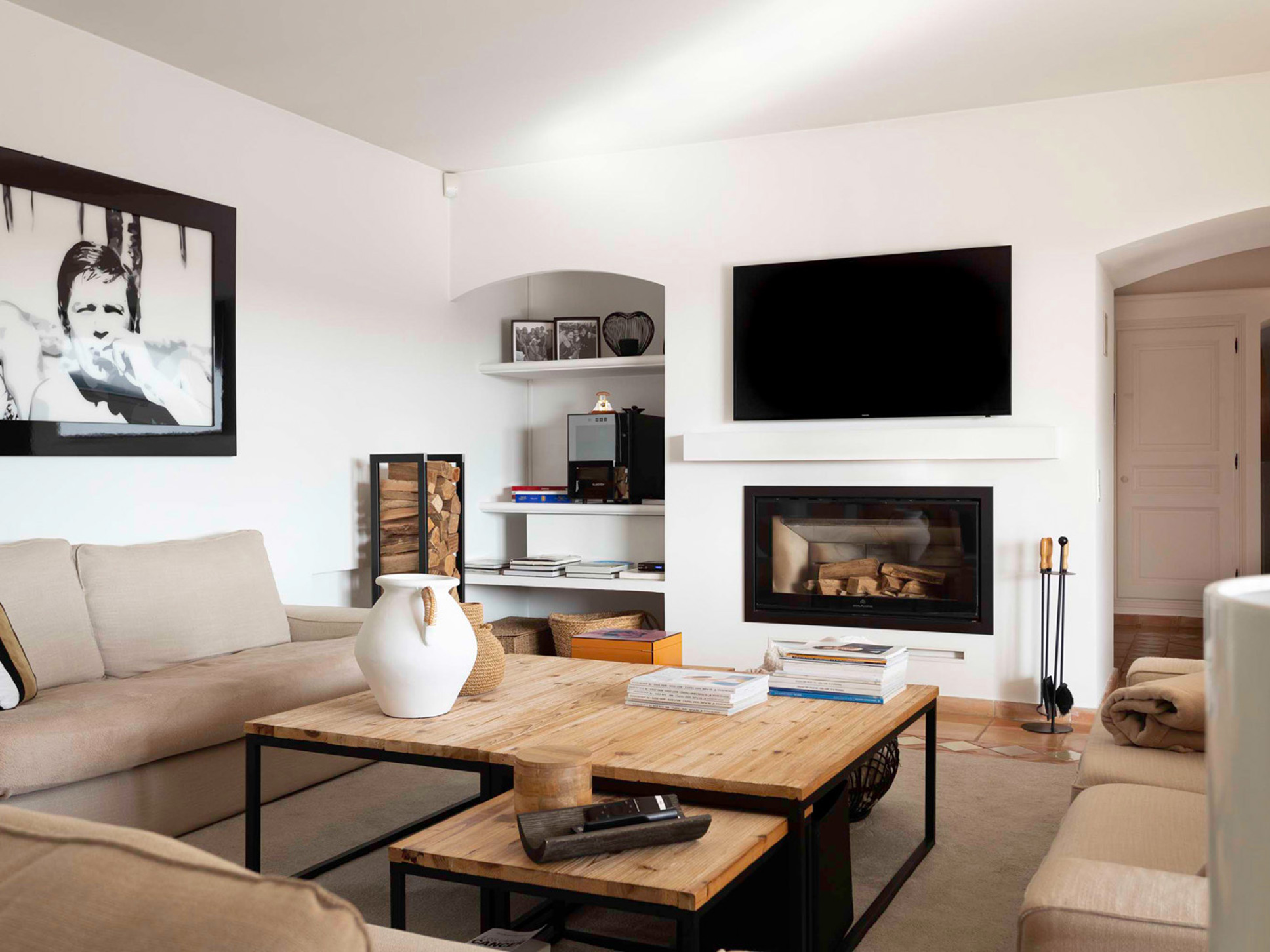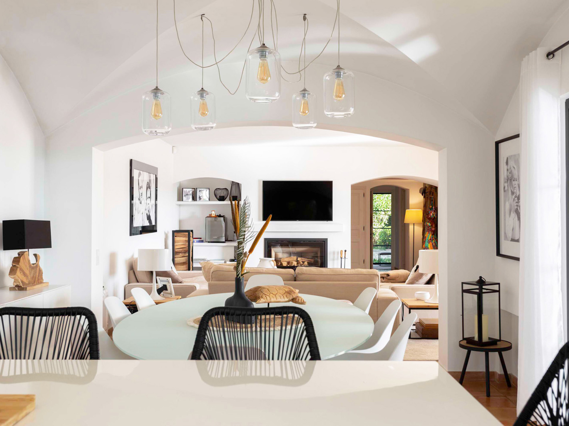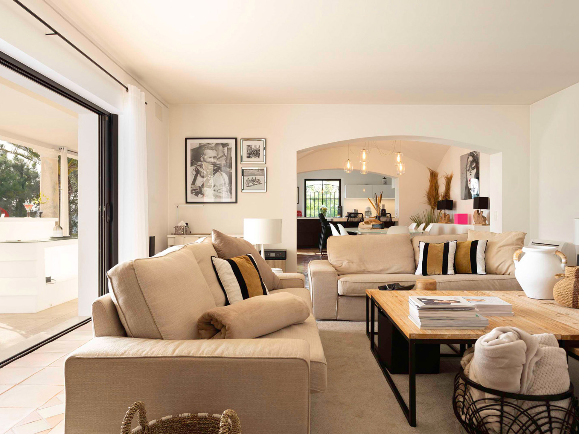 De living is licht en modern van opzet. Het oog wordt direct gegrepen door de diverse schilderijen en andere Zuid Franse georiënteerde kunstvoorwerpen. De living is verder luxe ingericht met moderne meubels, een comfortabele zithoek en een design eettafel.