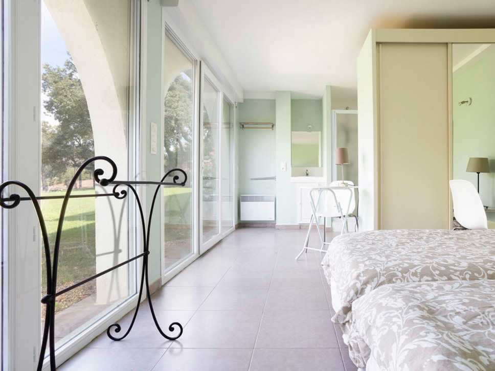 De 5e slaapkamer is de tuinkamer. De kamer is gelegen op de benedenverdieping en buitenom te bereiken via de trap aan de zijkant van het terras. Deze kamer beschikt over twee eenpersoonsbedden (2x90x200) en een ensuite badkamer met douche en toilet. Deze tuinkamer is optioneel bij te boeken (zie ook: 'In de omgeving').