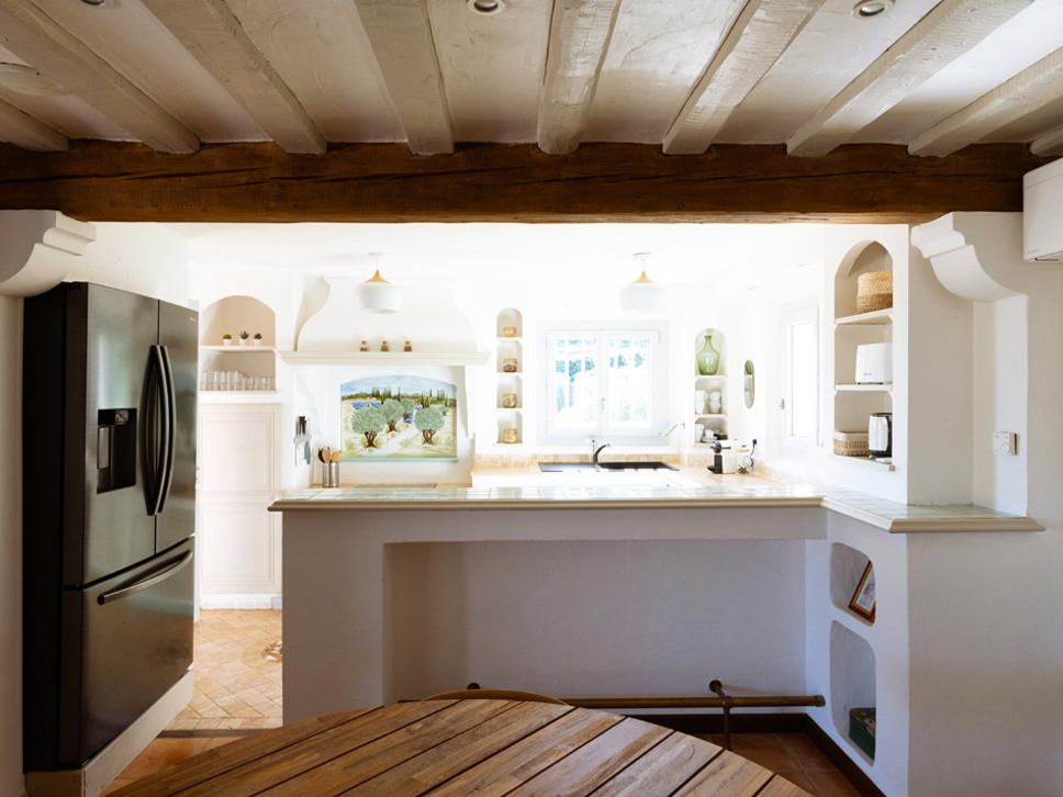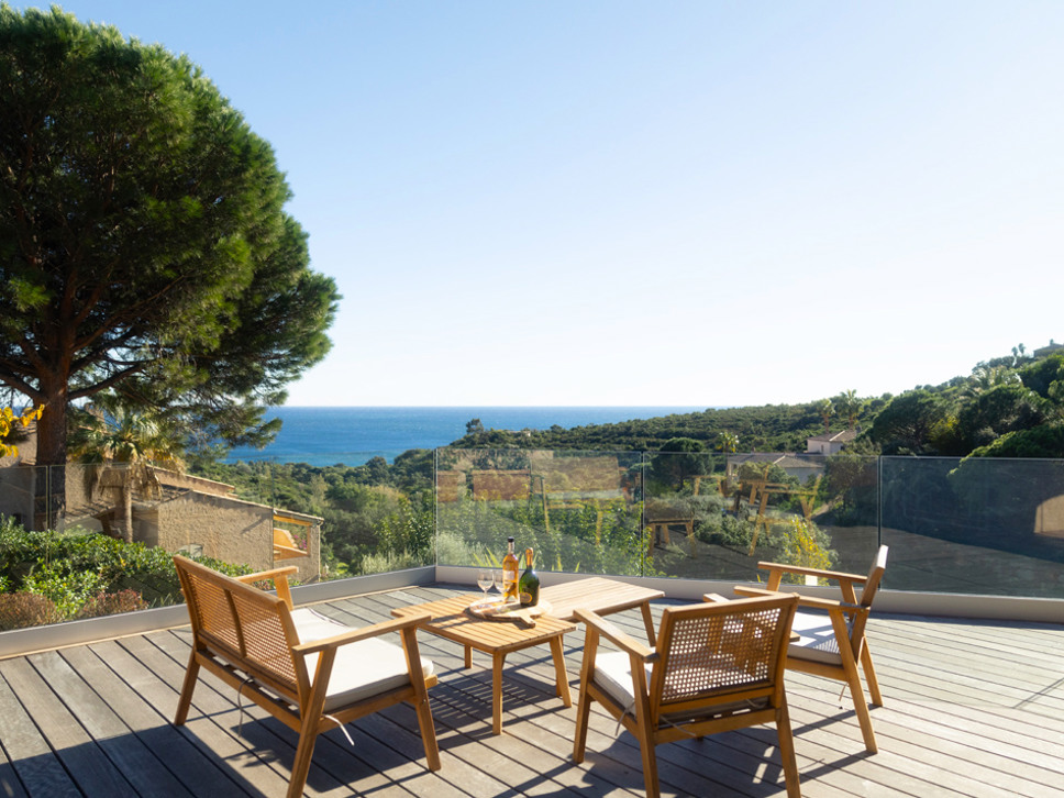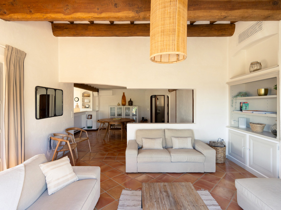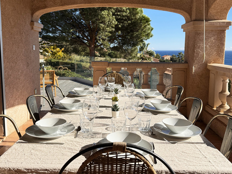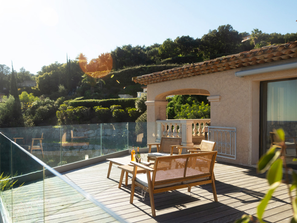 Op het overdekte deel van het terras direct grenzend aan de keuken staat een eettafel. Hier geniet u van een vers bereide lunch met mooi zicht op de Golf van Saint Tropez.