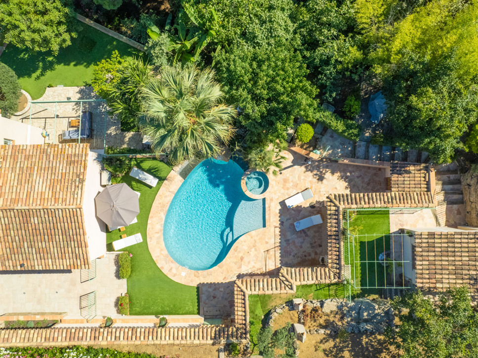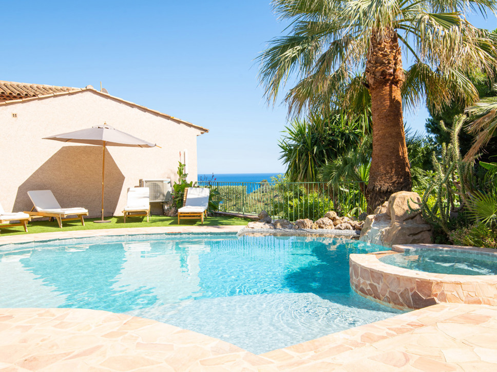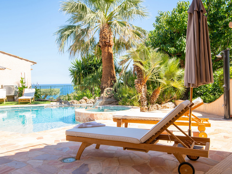 Het zwembad, zeer beschut gelegen aan de achterzijde van de villa heeft een organische vorm en er staan 6 ligbedden op u te wachten. De mooie grote palmboom maakte Zuid-Franse plaatje compleet.