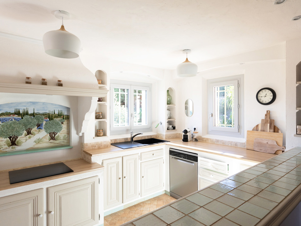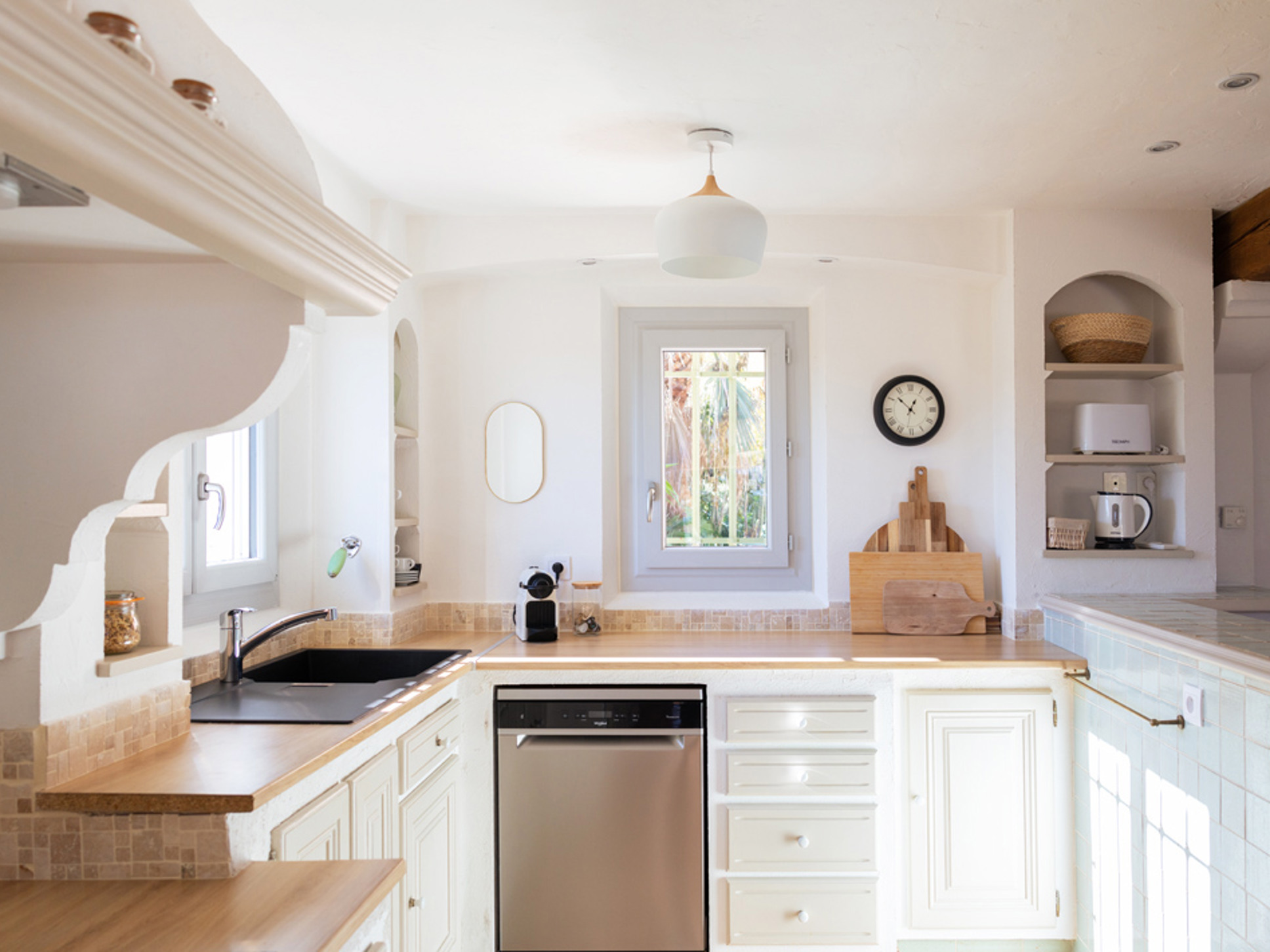 De open keuken is voorzien van alle gemakken zoals een dubbele oven, elektrische kookplaat, magnetron, Nespresso-apparaat en een grote koel-vriescombinatie met ijsmaker en biedt toegang tot het overdekte terras met royale eettafel.