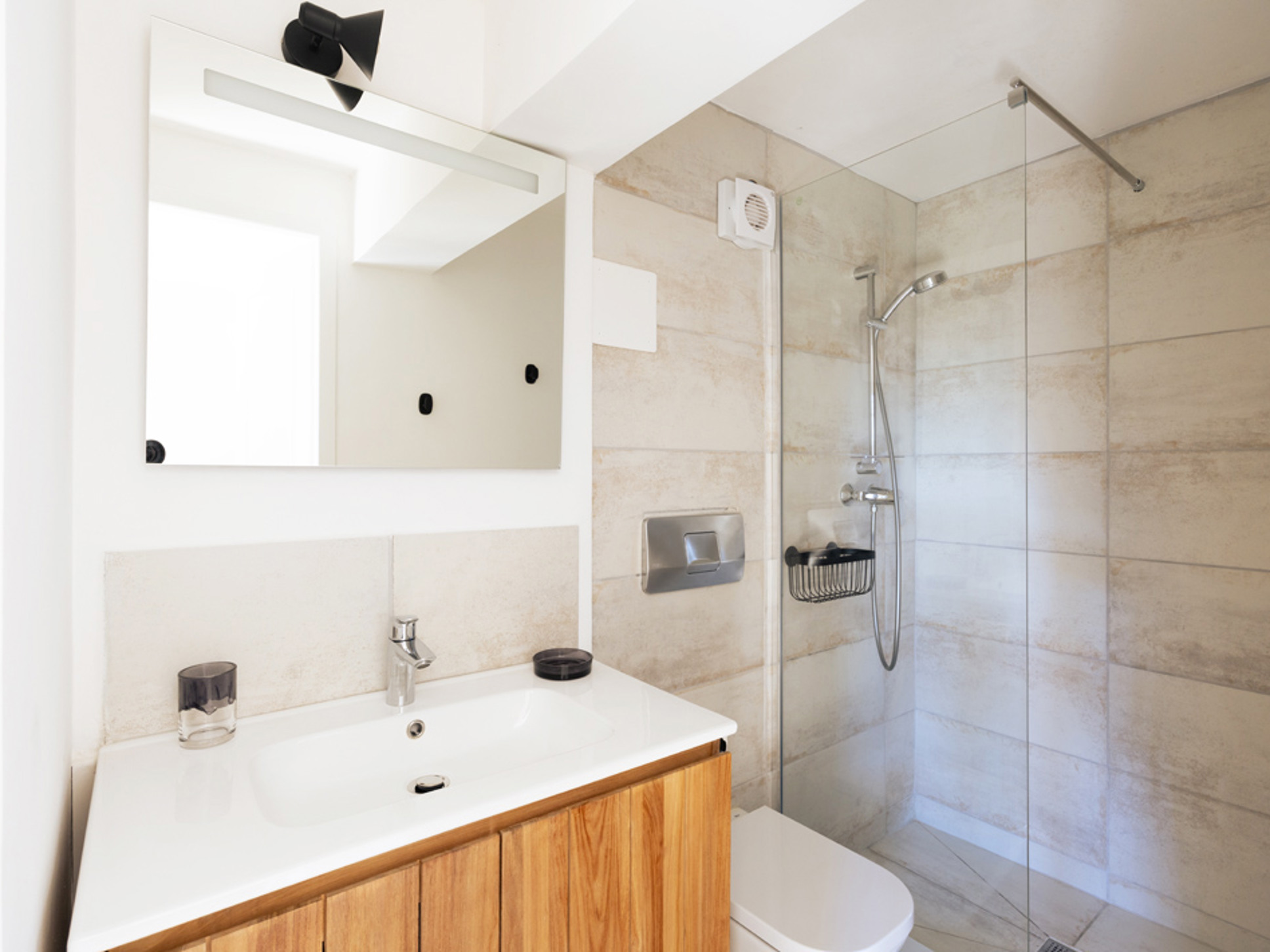 Slaapkamer 1 bevindt zich op het niveau van de living. Slaapkamer 1 is voorzien van een tweepersoonsbed (160x200) en de badkamer (douche en apart toilet) is privé. Het frans-balkon met uitzicht op de Middellandse Zee is een leuke feature.