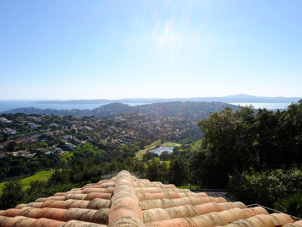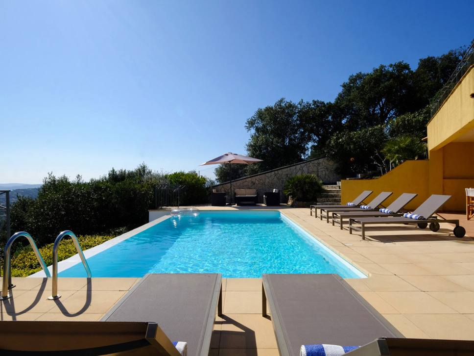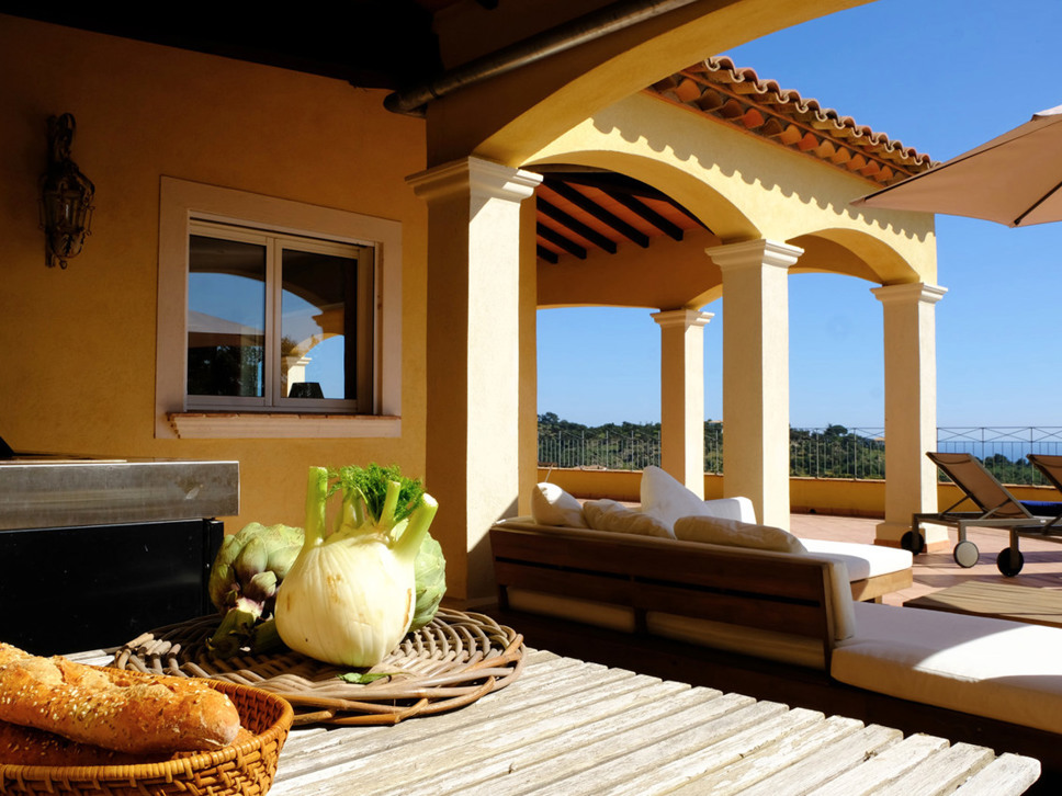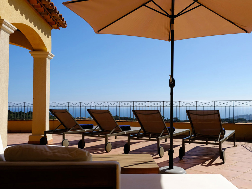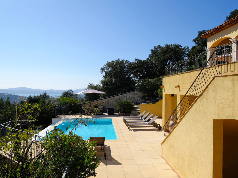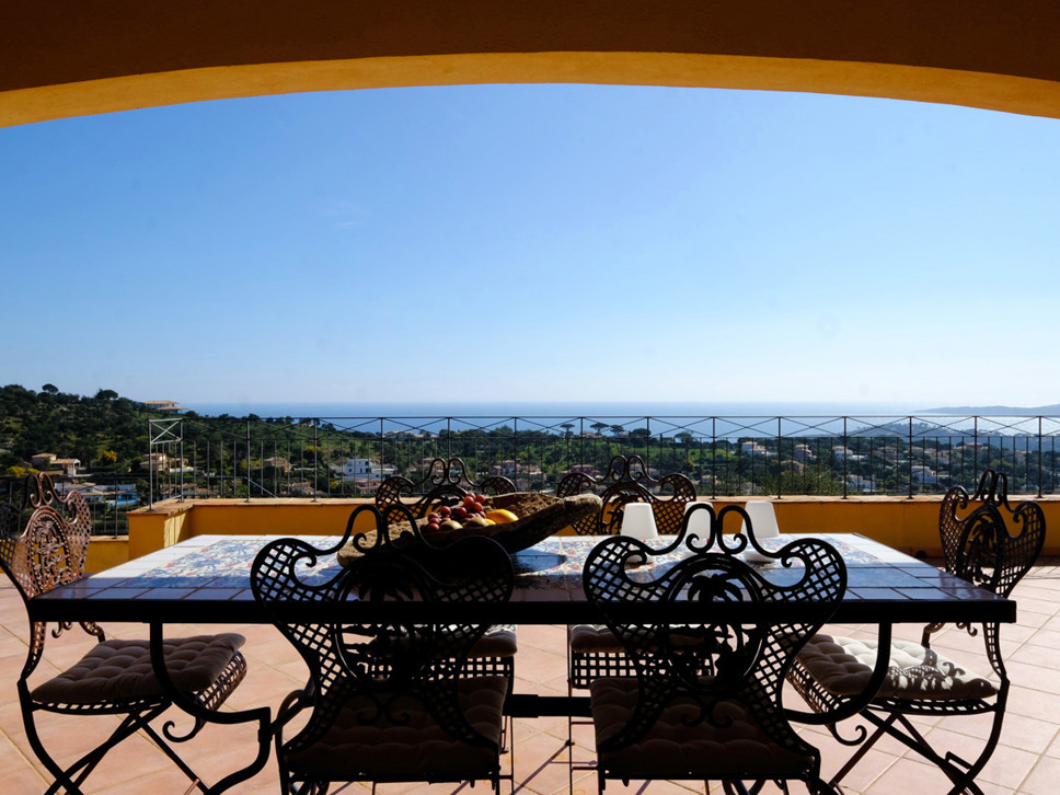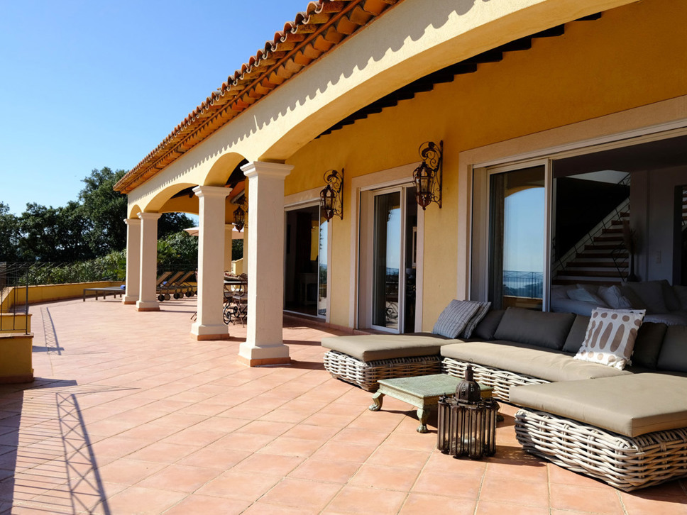 Er staat een grote eettafel, er zijn 2 royale loungesets en er staan sunloungers. De X-factor van deze villa is natuurlijk het uitzicht. Vanaf het terras geniet u van een panoramisch zicht over de Middellandse zee en de Golf van Saint Tropez. Via dit terras kunt u middels 2 trappen naar het lager gelegen zwembad.