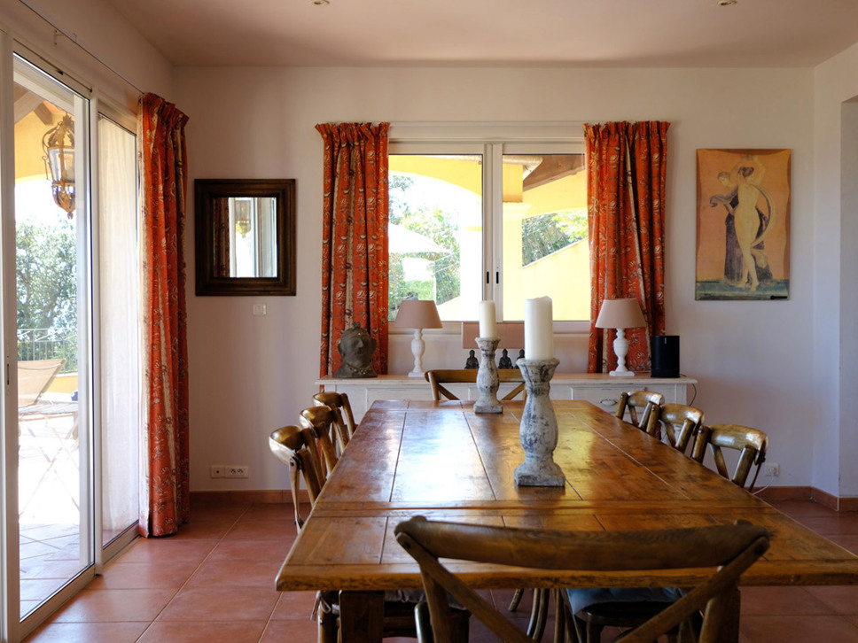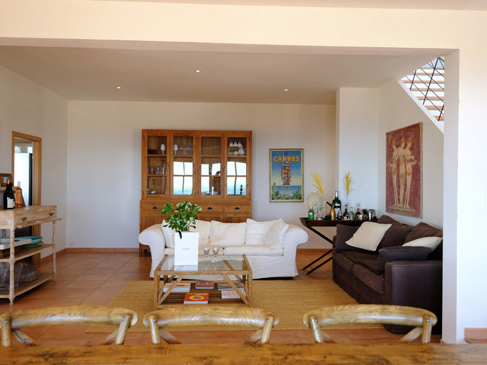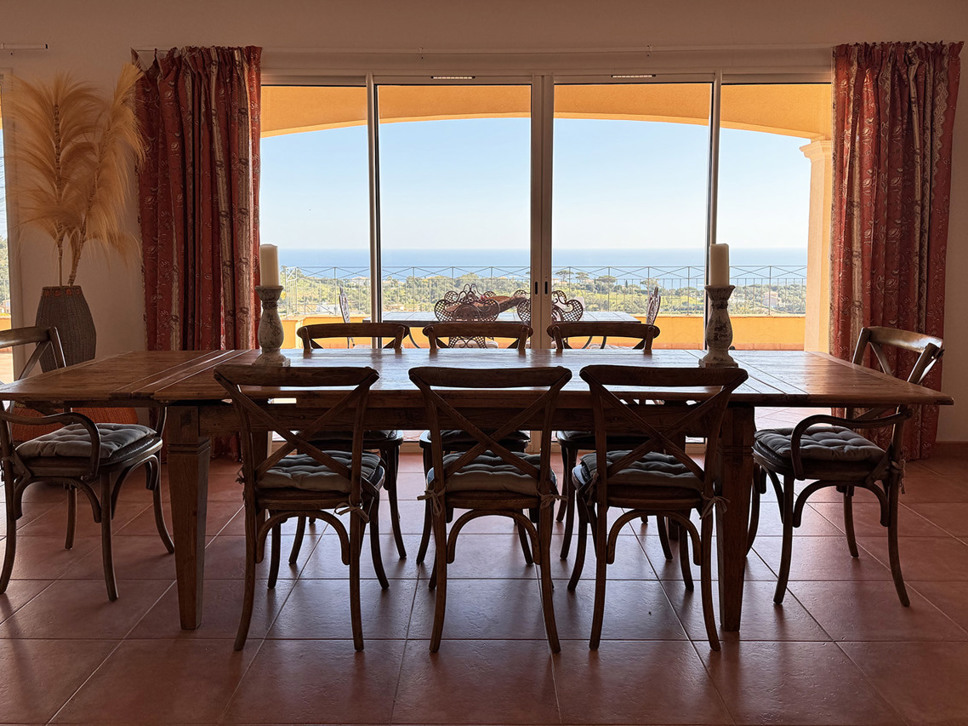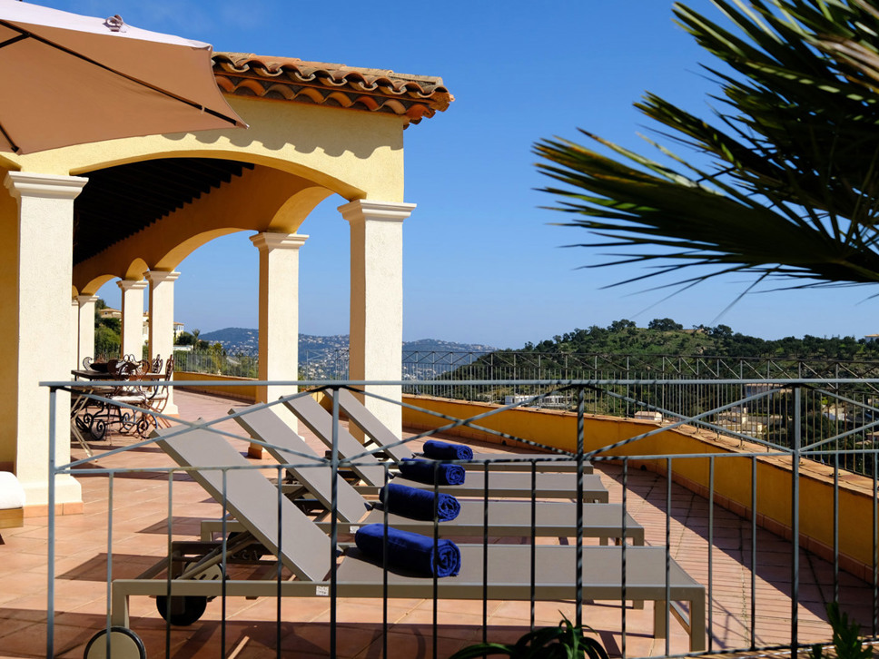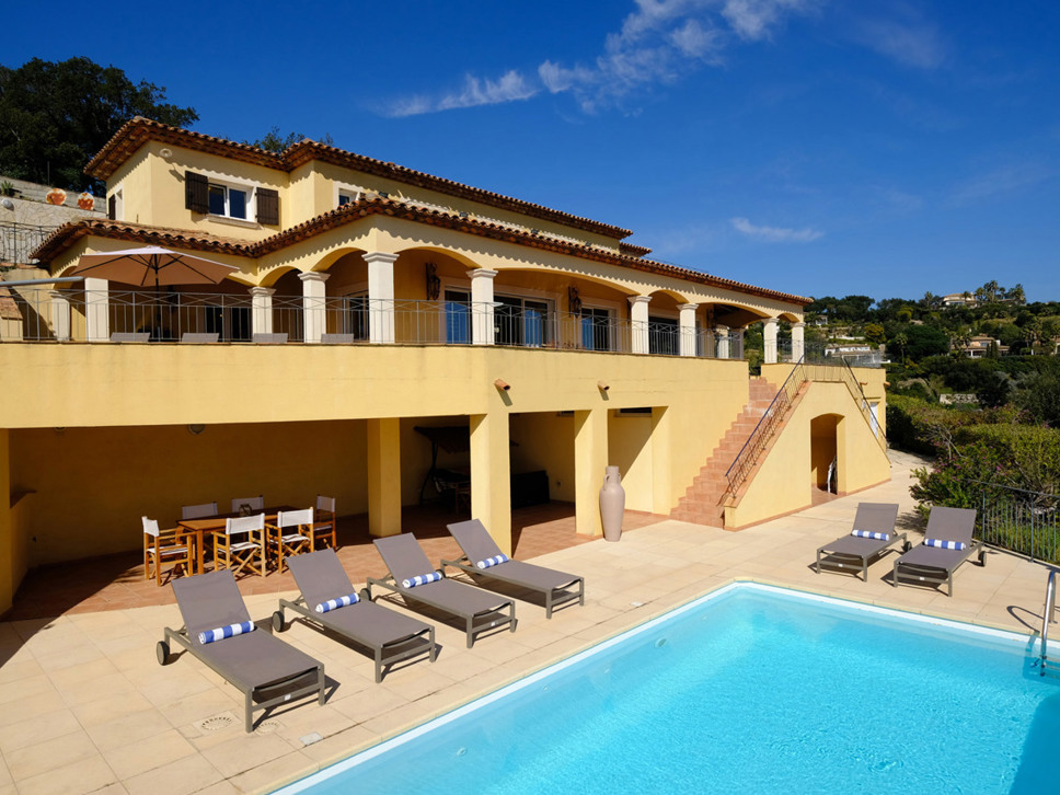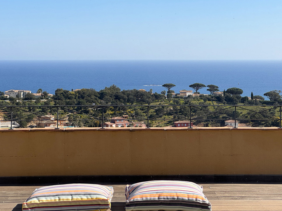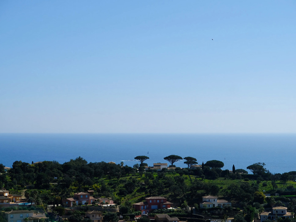 Er staat een grote eettafel, er zijn 2 royale loungesets en er staan sunloungers. De X-factor van deze villa is natuurlijk het uitzicht. Vanaf het terras geniet u van een panoramisch zicht over de Middellandse zee en de Golf van Saint Tropez. Via dit terras kunt u middels 2 trappen naar het lager gelegen zwembad.