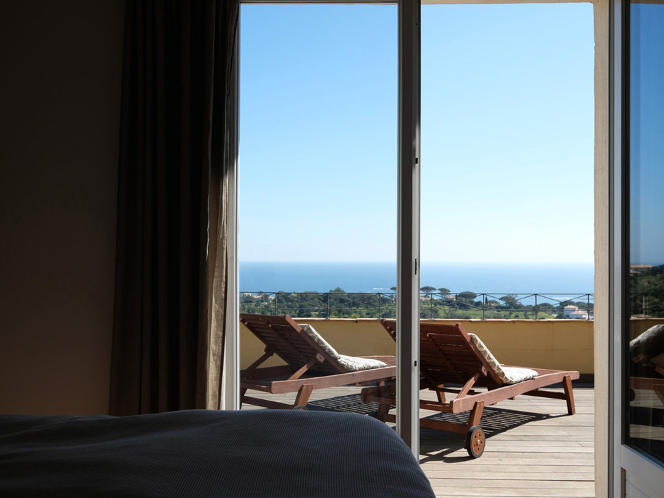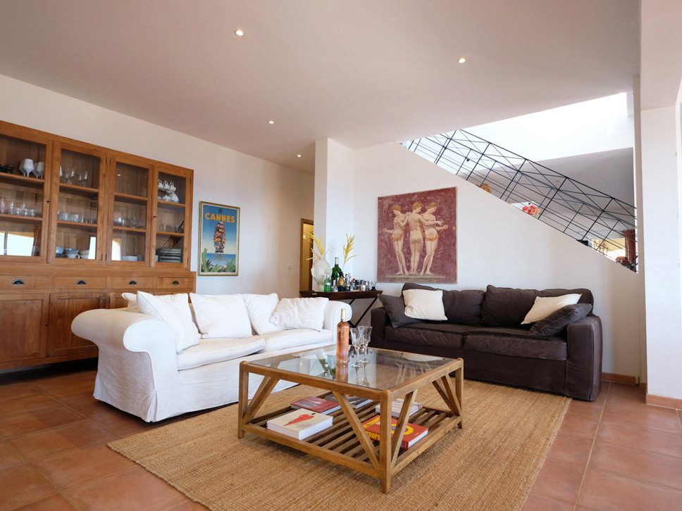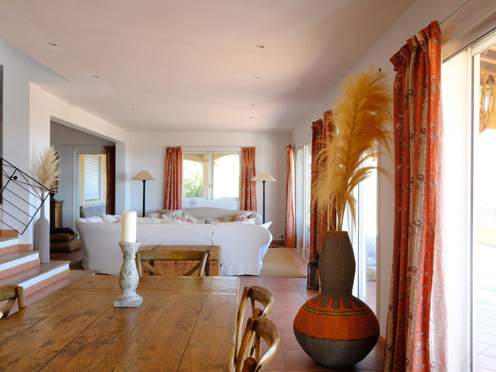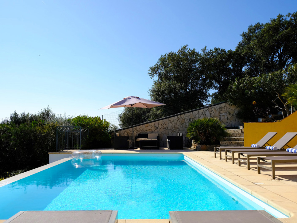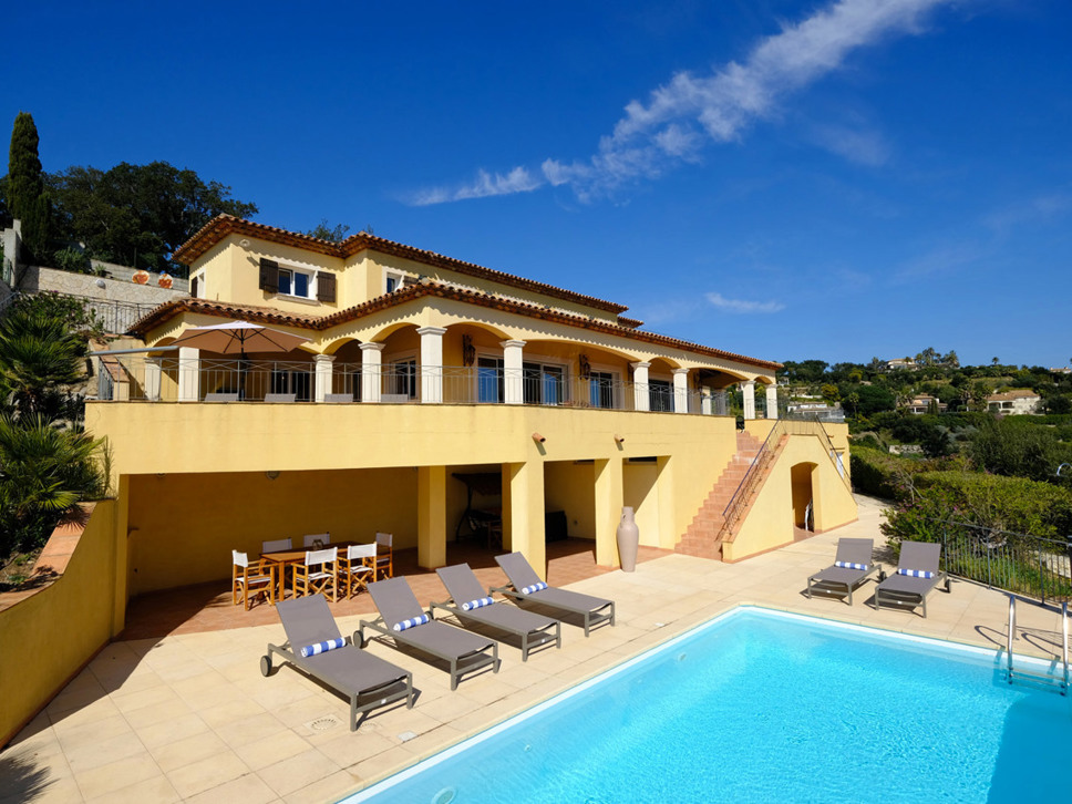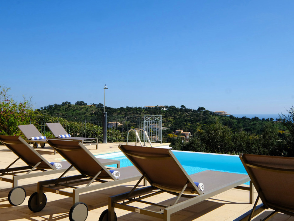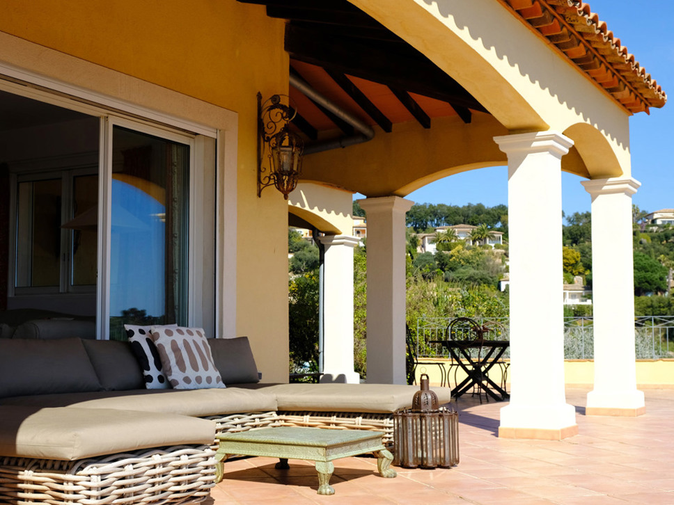 Er staat een grote eettafel, er zijn 2 royale loungesets en er staan sunloungers. De X-factor van deze villa is natuurlijk het uitzicht. Vanaf het terras geniet u van een panoramisch zicht over de Middellandse zee en de Golf van Saint Tropez. Via dit terras kunt u middels 2 trappen naar het lager gelegen zwembad.