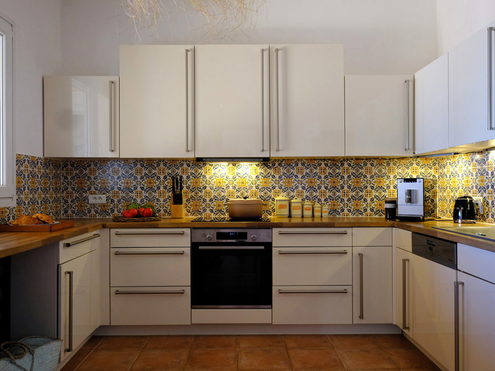 De living biedt 2 royale zithoeken, een TV-gedeelte en een dining area. Openslaande deuren / grote glazen schuifdeuren bieden direct toegang tot het terras. De gehele woning is voorzien van airconditioning. Er is een volledig ingerichte keuken voorzien van al het comfort. De keuken bevat o.a. een grote oven, koelkast met diepvriezer, separate vriezer,